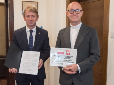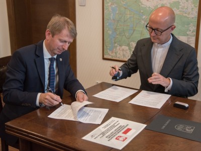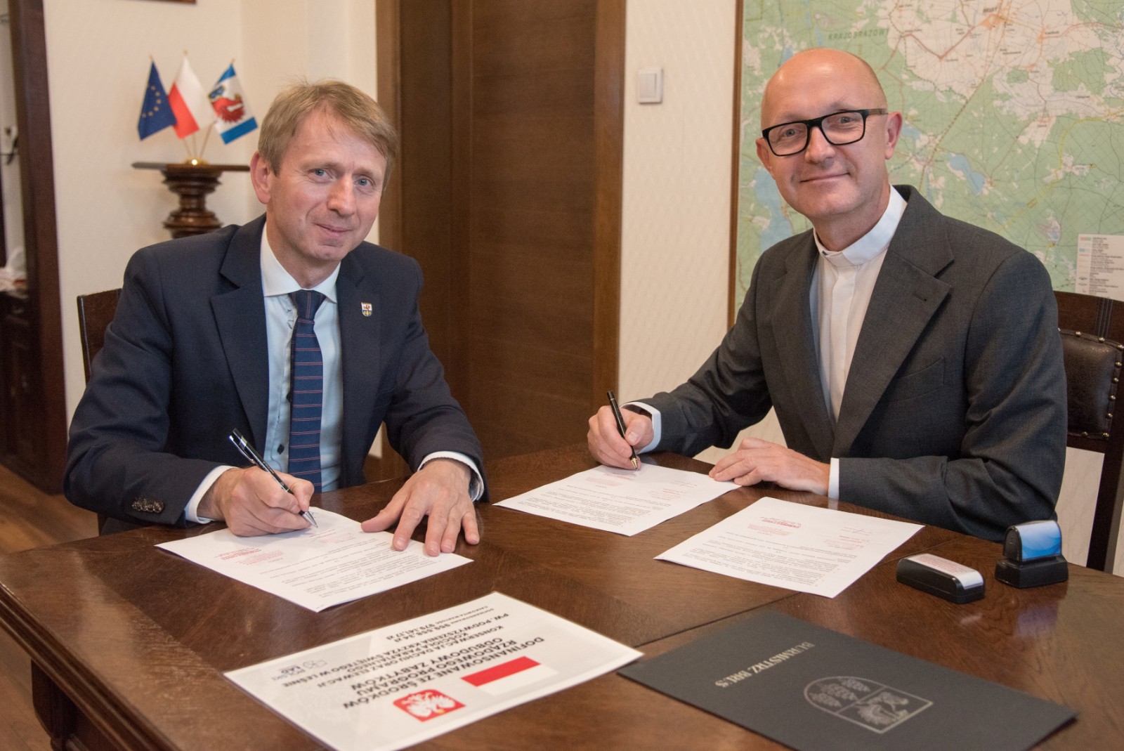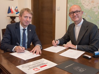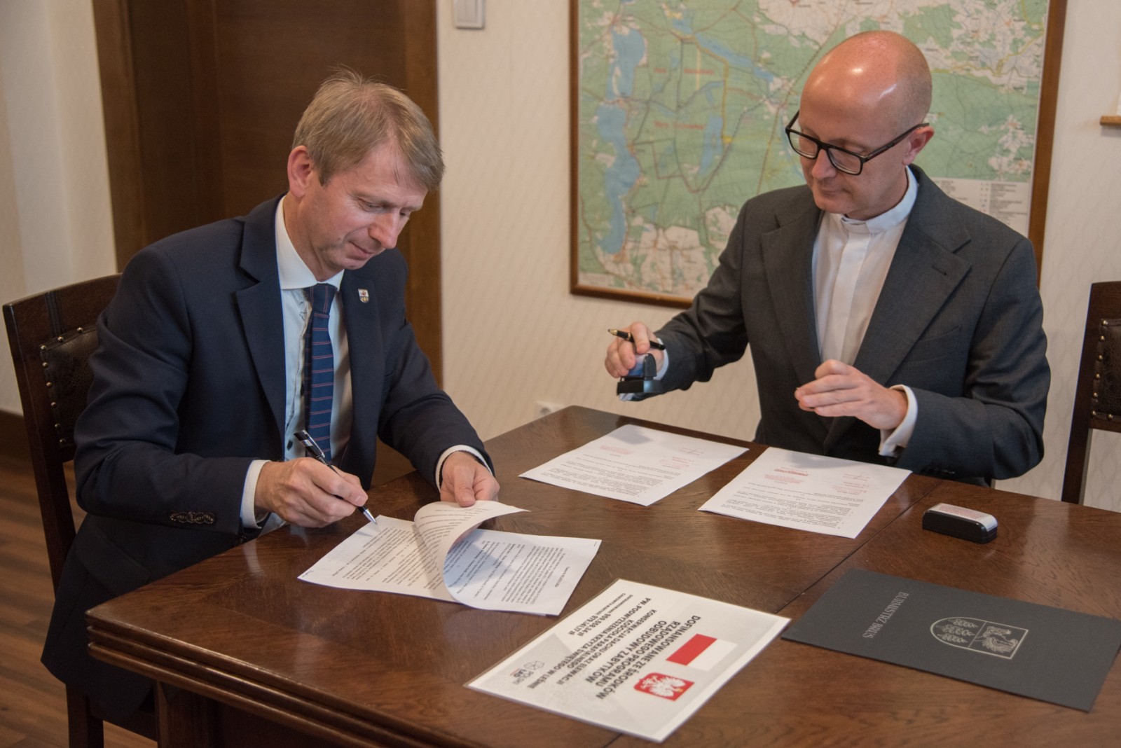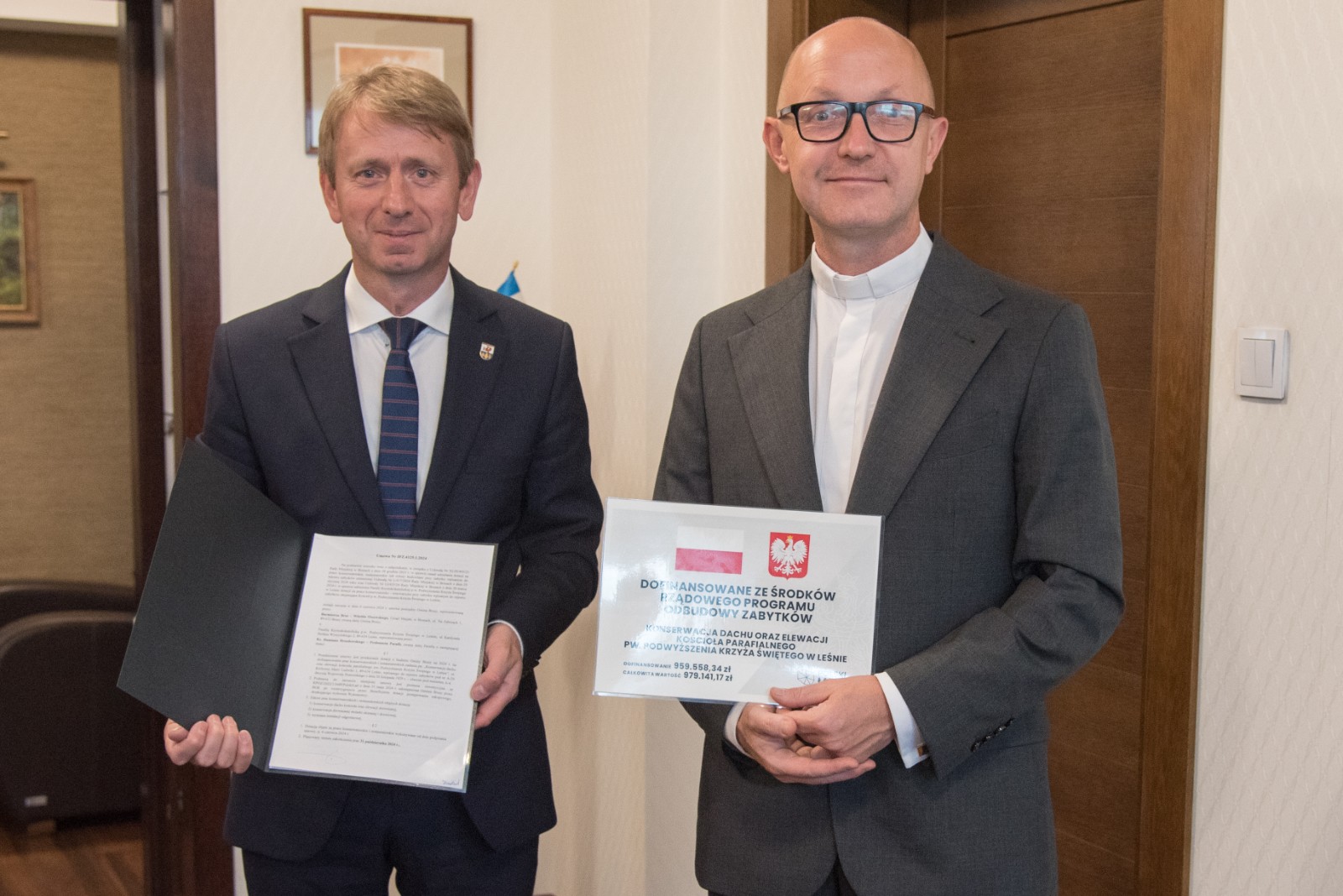 Burmistrz Brus Witold Ossowski podpisał dziś (06.06) umowę z księdzem Damianem Drozdowskim, proboszczem Parafii Podwyższenia Krzyża Świętego w Leśnie o przekazanie dotacji na konserwację leśnieńskiego kościoła.