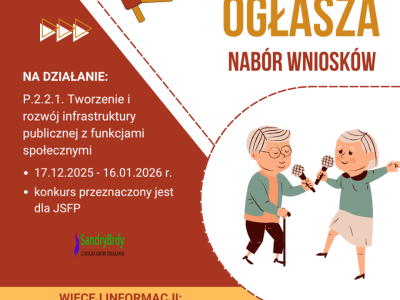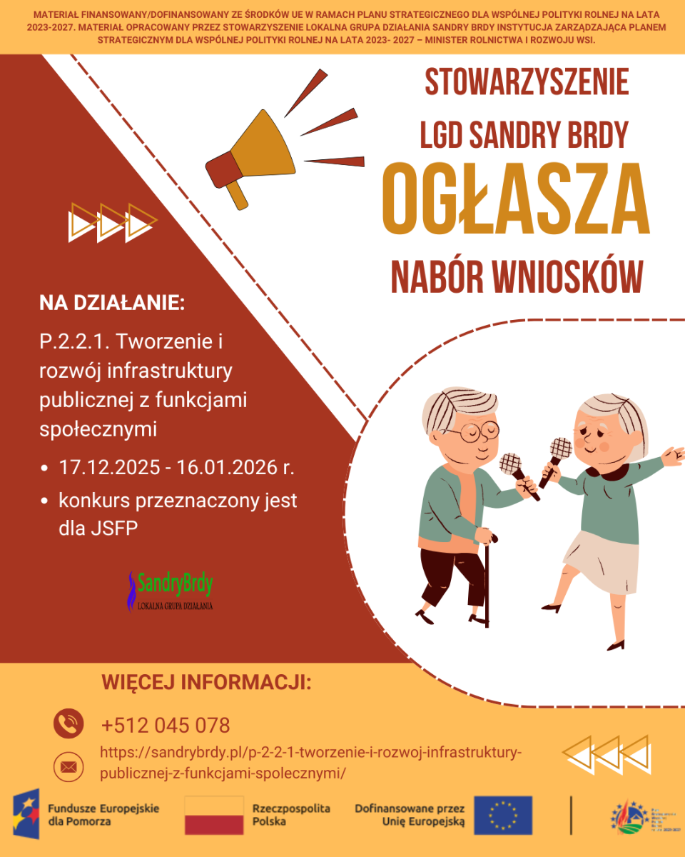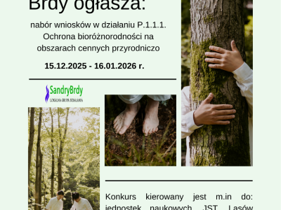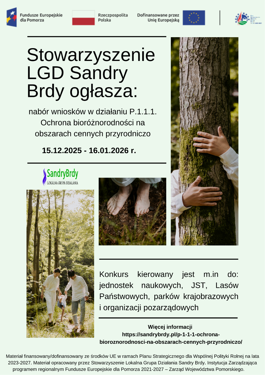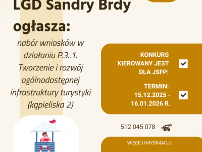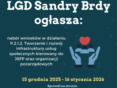 Informujemy, że do 16 stycznia 2026 r. trwa nabór wniosków w konkursach ogłoszonych przez Stowarzyszenie LGD Sandry Brdy: