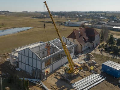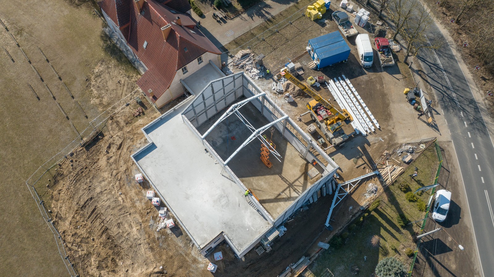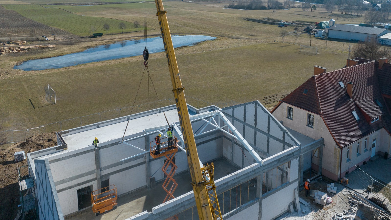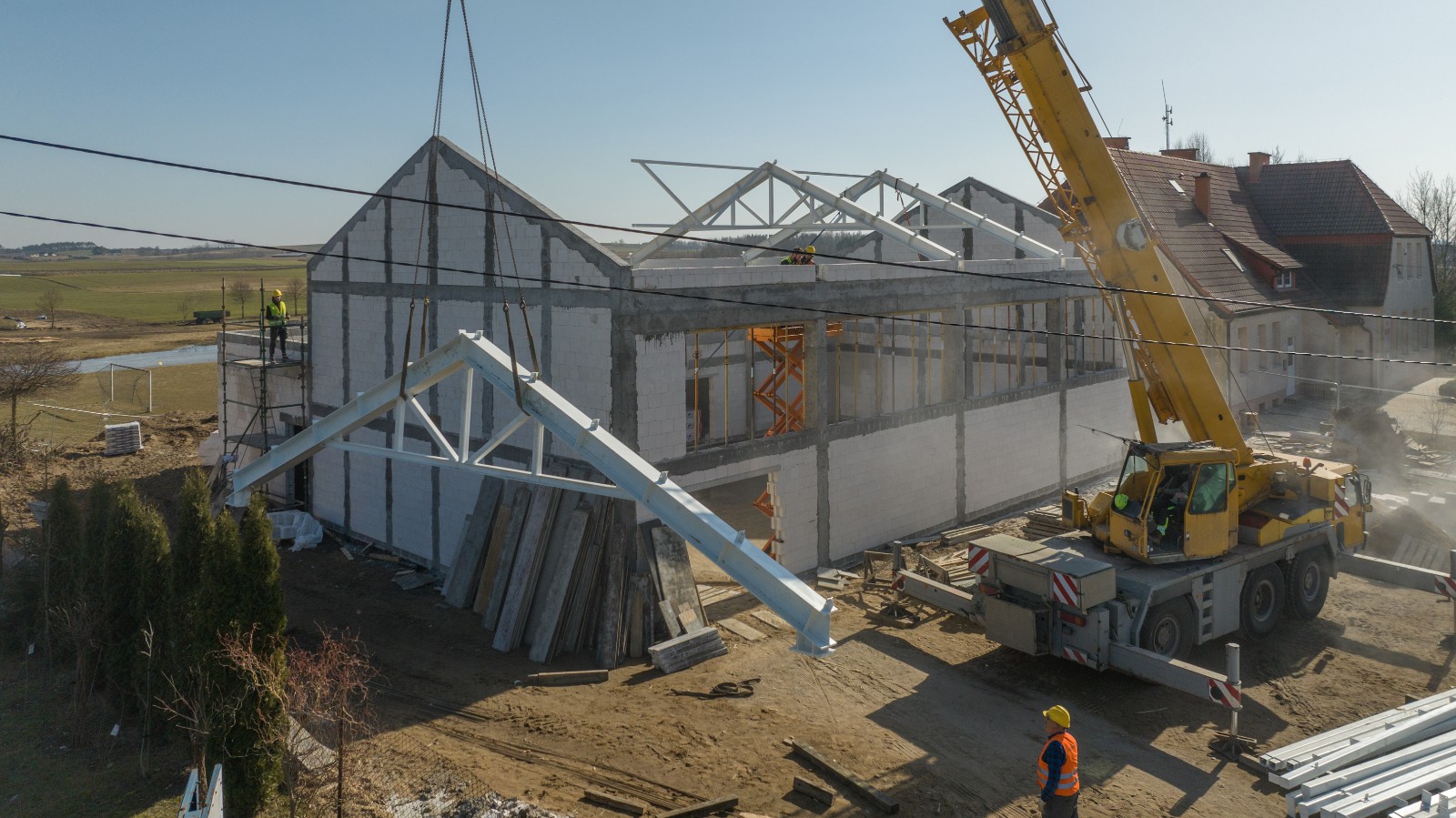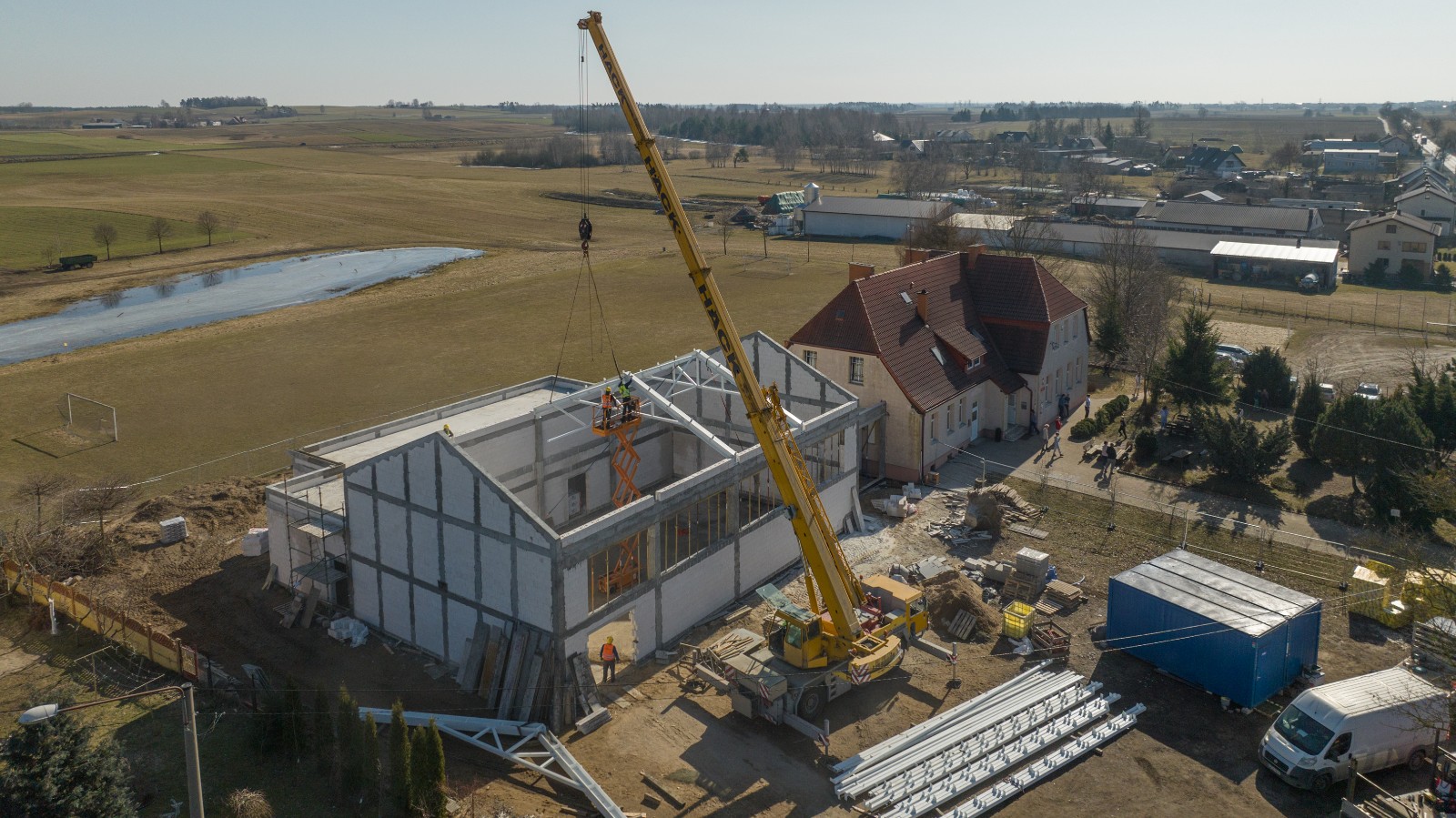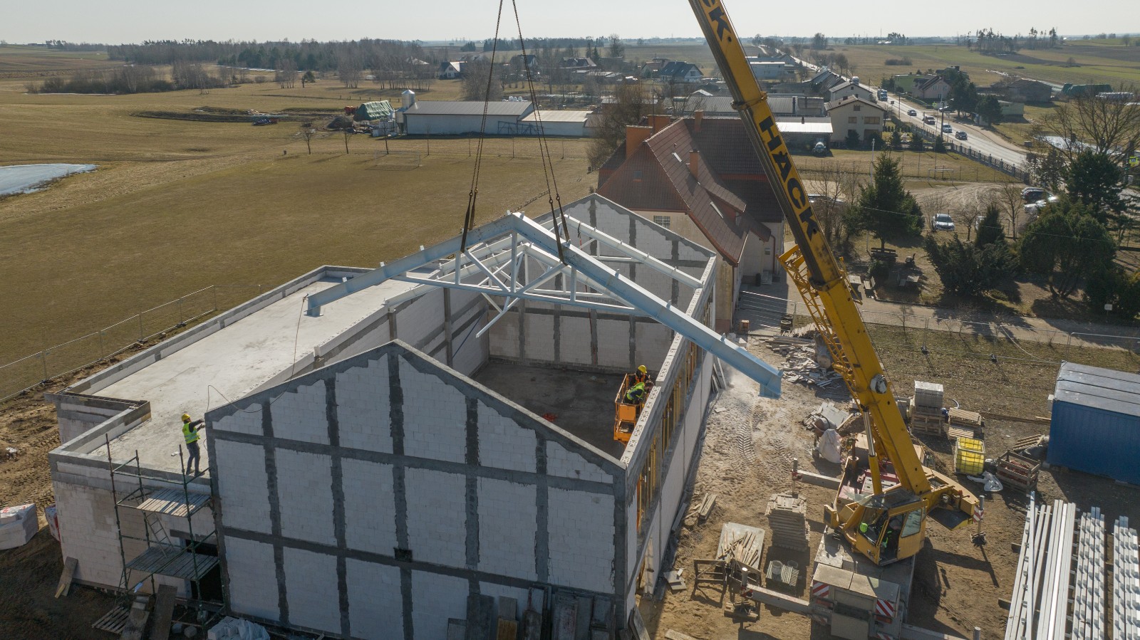 Na budowie sali gimnastycznej przy Szkole Podstawowej w Zalesiu realizowany jest kolejny ważny etap inwestycji – montaż konstrukcji dachowej.