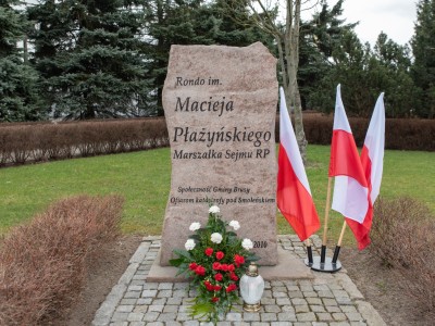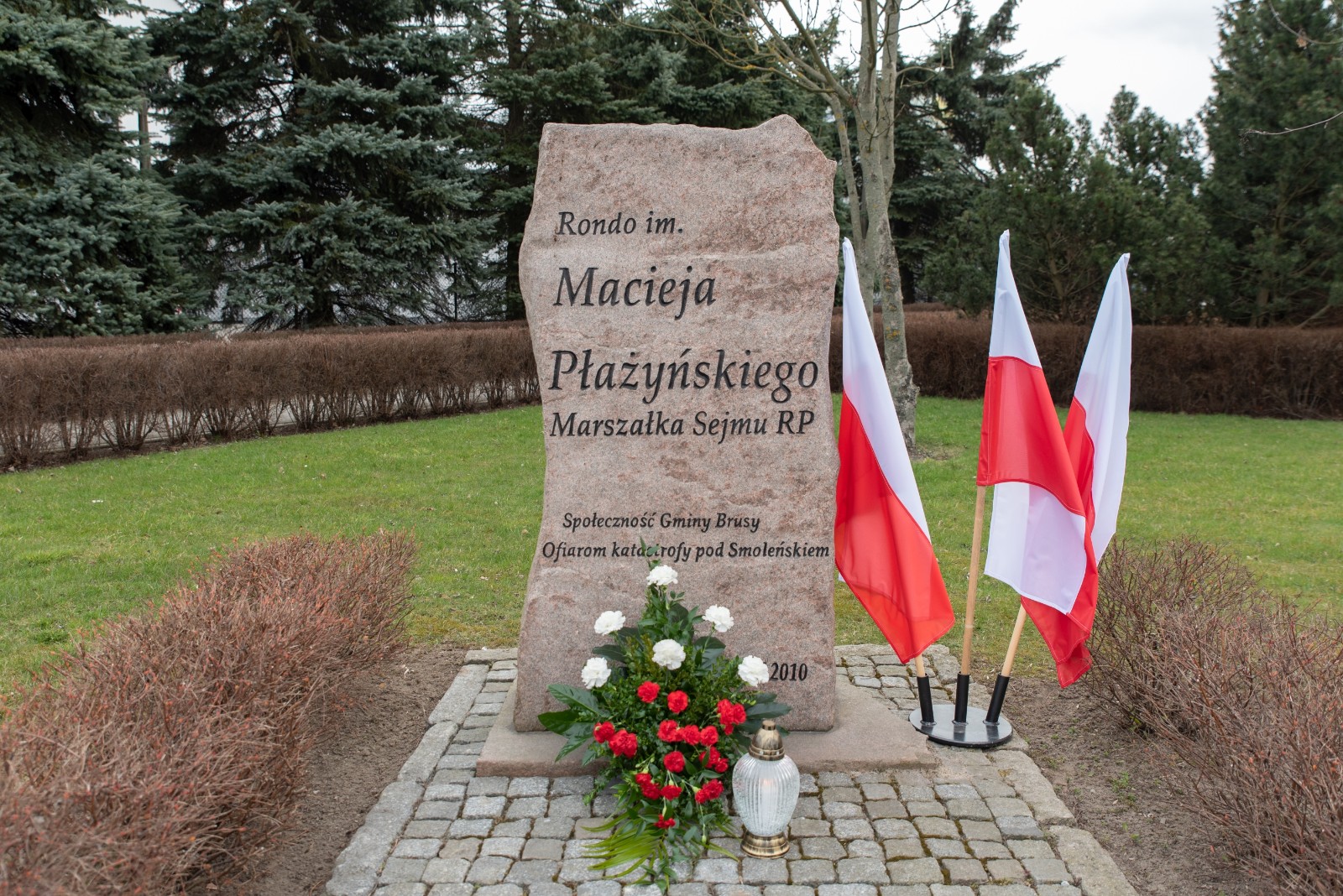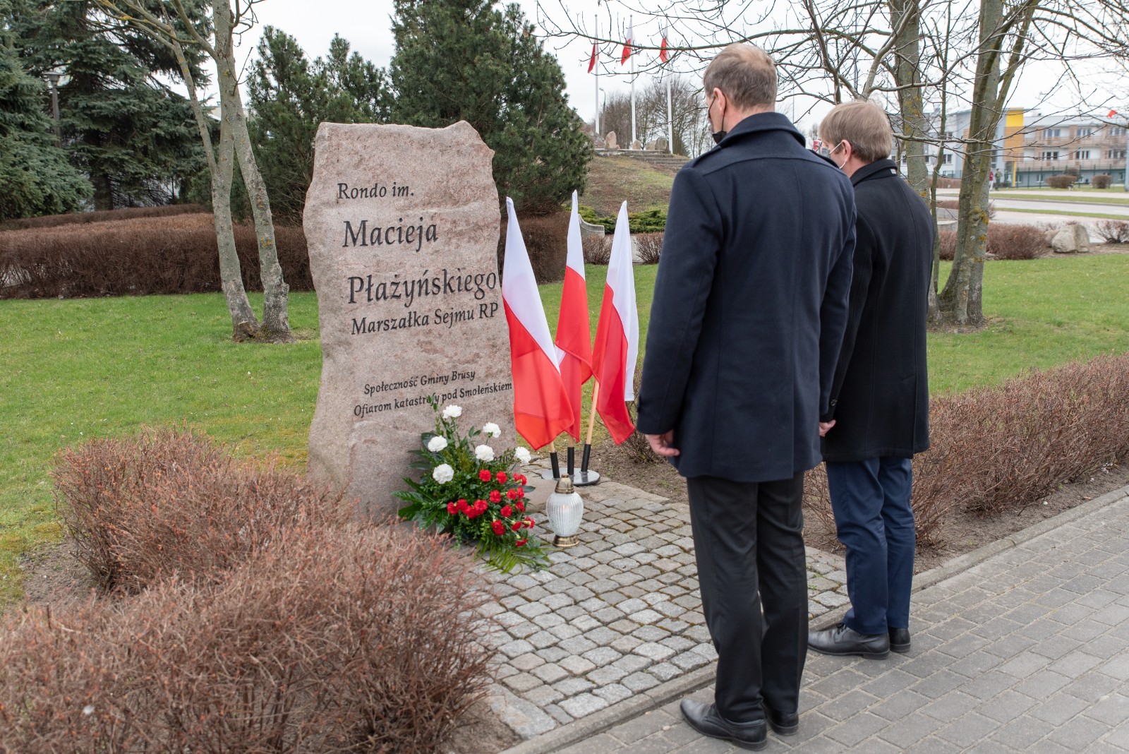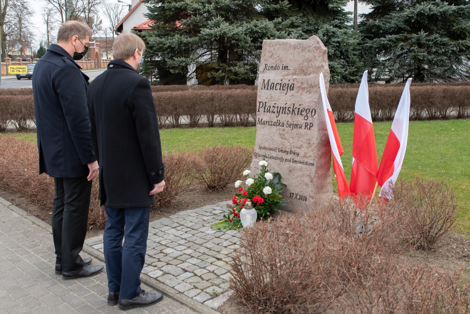 W hołdzie tragicznie zmarłym, Burmistrz Brus Witold Ossowski oraz Przewodniczący Rady Miejskiej w Brusach Zbigniew Łącki, złożyli wiązankę kwiatów oraz znicz przy pomniku ofiar katastrofy smoleńskiej, który mieści się w sąsiedztwie ronda im. Marszałka Sejmu RP Macieja Płażyńskiego w Brusach.