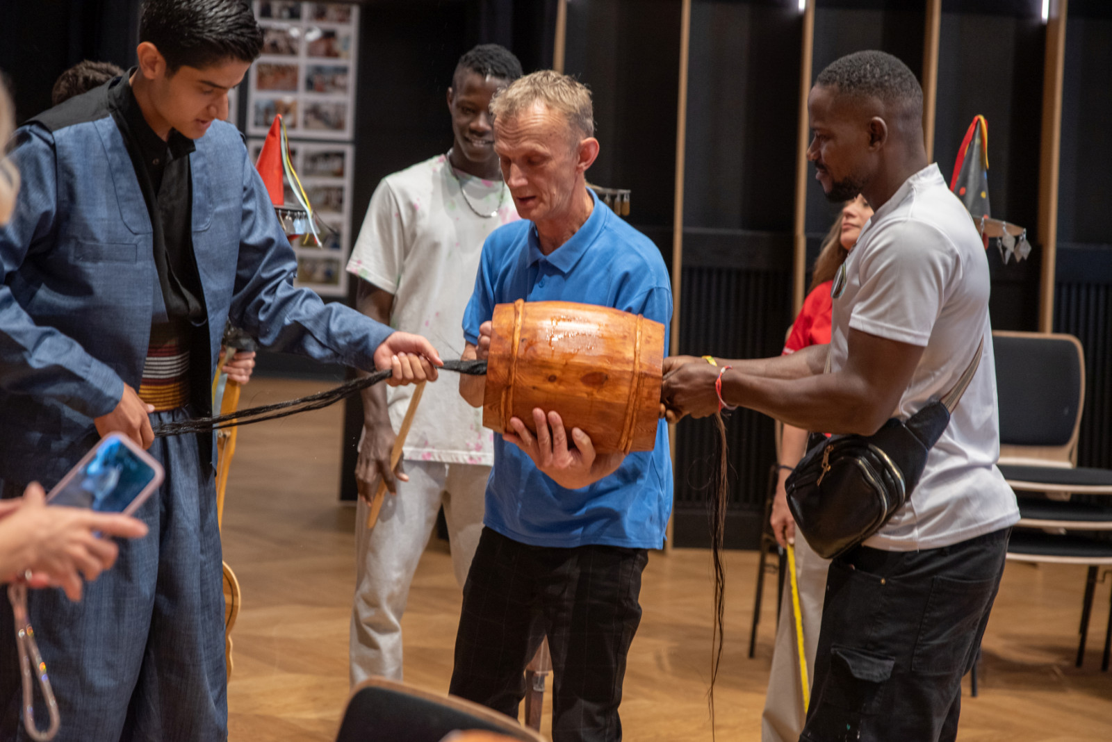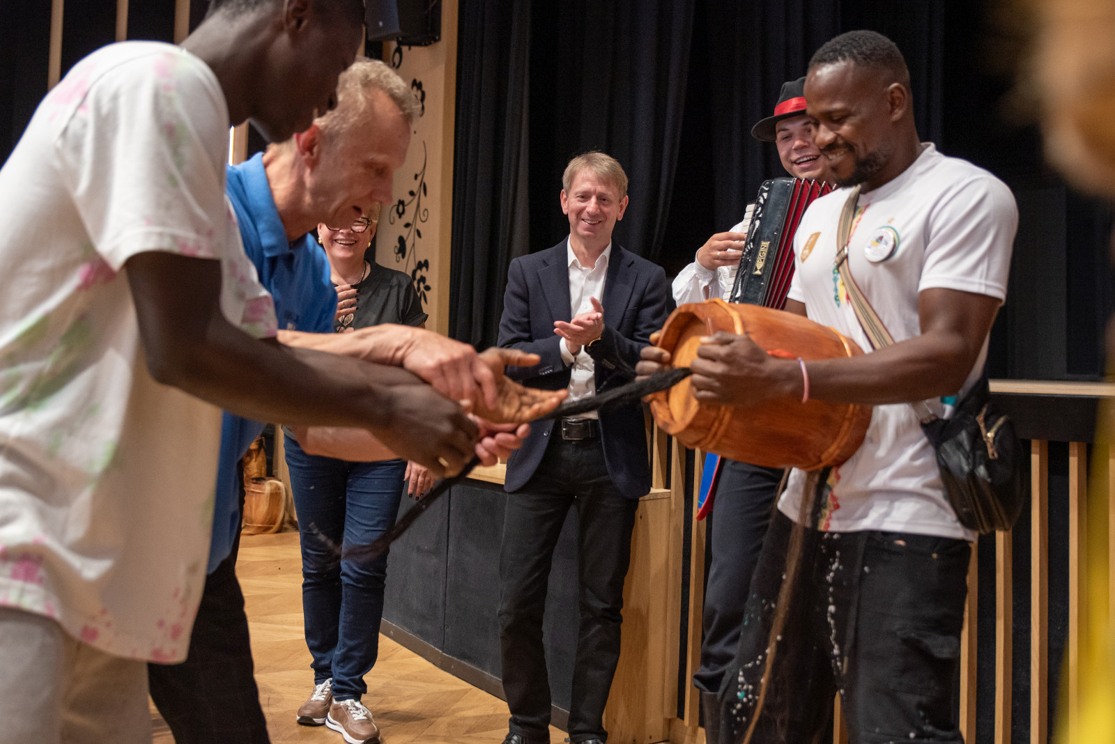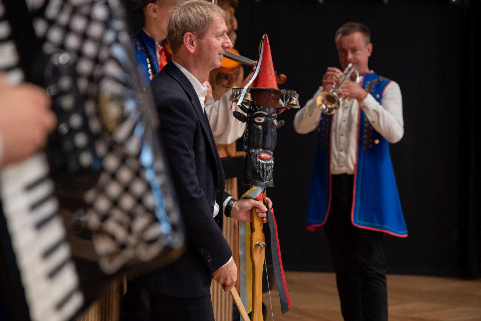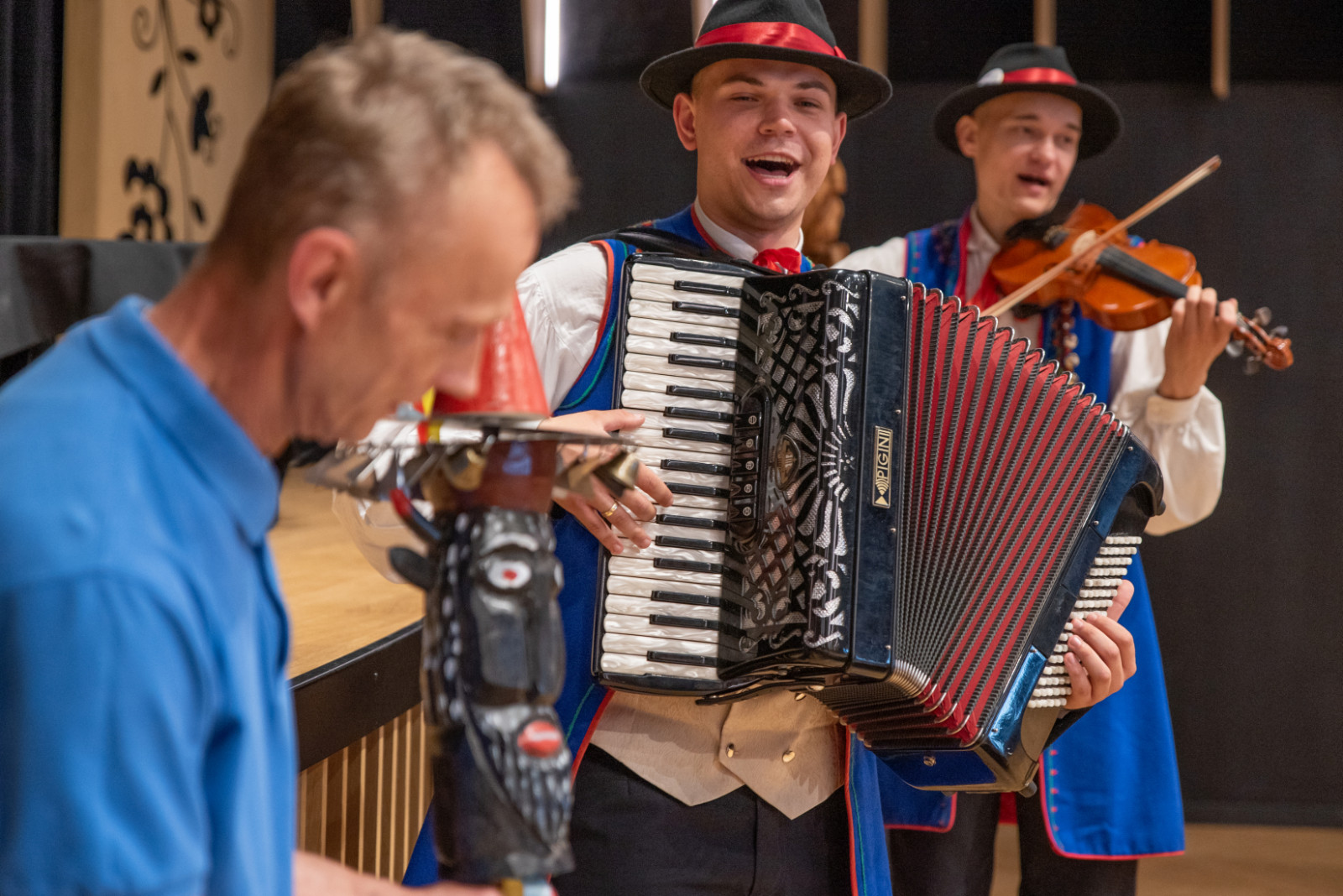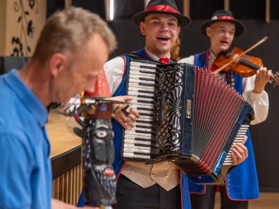 Spotkanie przebiegało w serdecznej atmosferze, przy dźwiękach kapeli Zespołu Pieśni i Tańca „Krebane”. Goście mieli okazję spróbować gry na tradycyjnych kaszubskich instrumentach – diabelskich skrzypcach i burczybasie, co sprawiło im wiele radości i wywołało sporo uśmiechów.