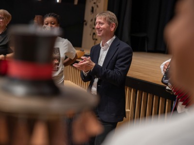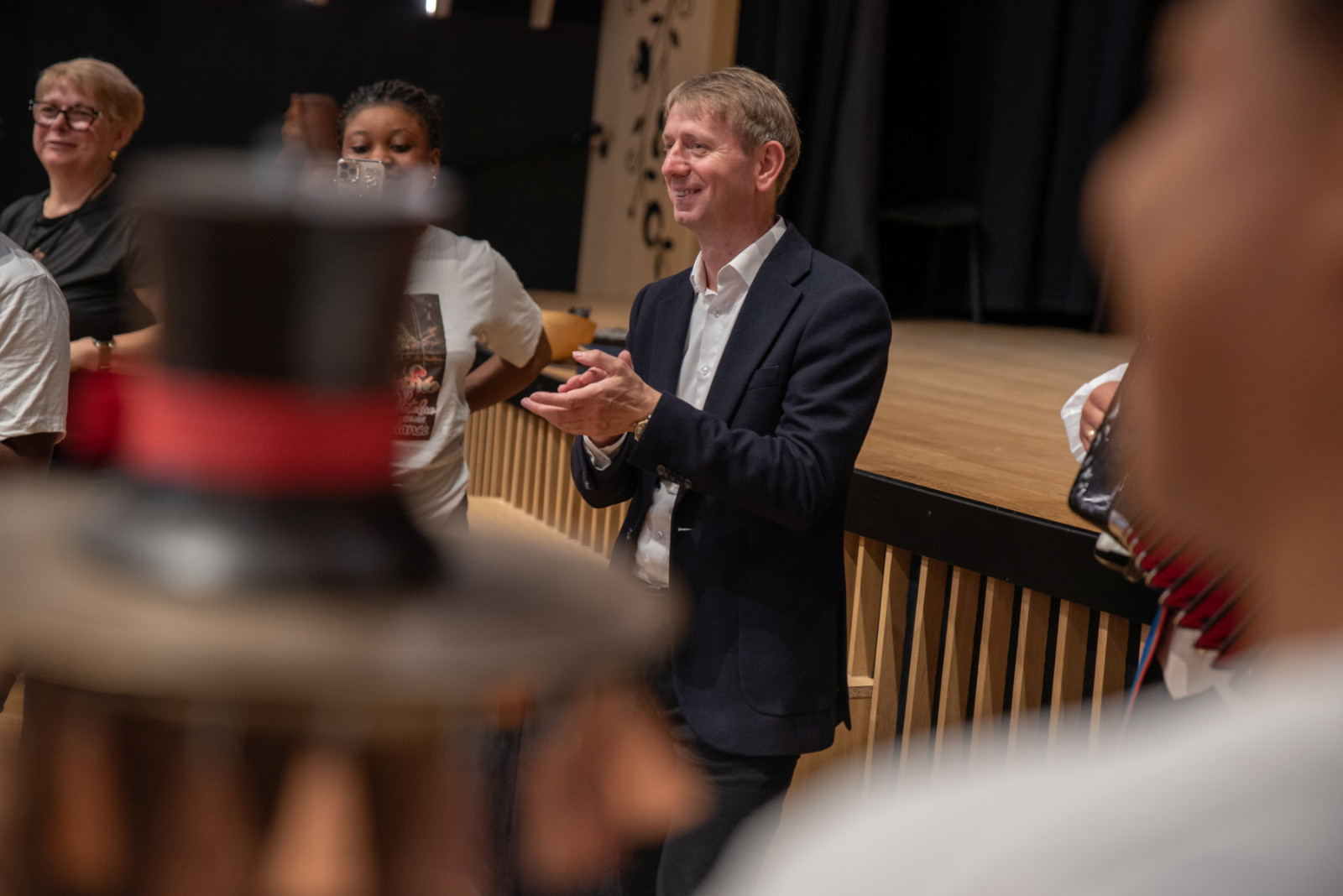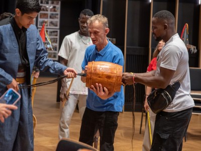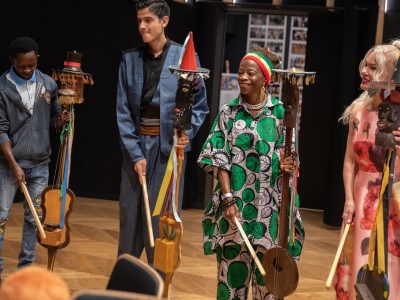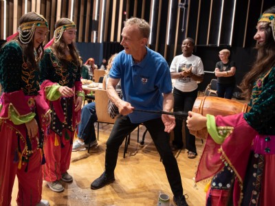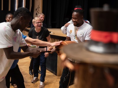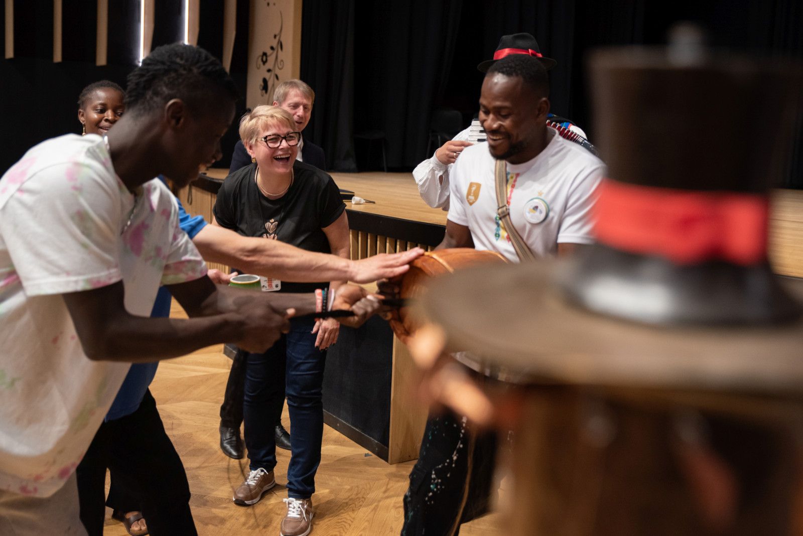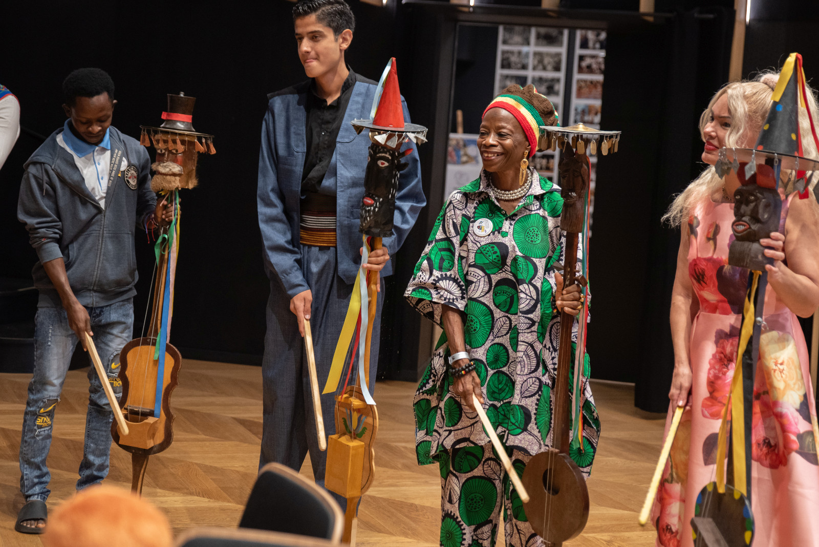 Spotkanie przebiegało w serdecznej atmosferze, przy dźwiękach kapeli Zespołu Pieśni i Tańca „Krebane”. Goście mieli okazję spróbować gry na tradycyjnych kaszubskich instrumentach – diabelskich skrzypcach i burczybasie, co sprawiło im wiele radości i wywołało sporo uśmiechów.