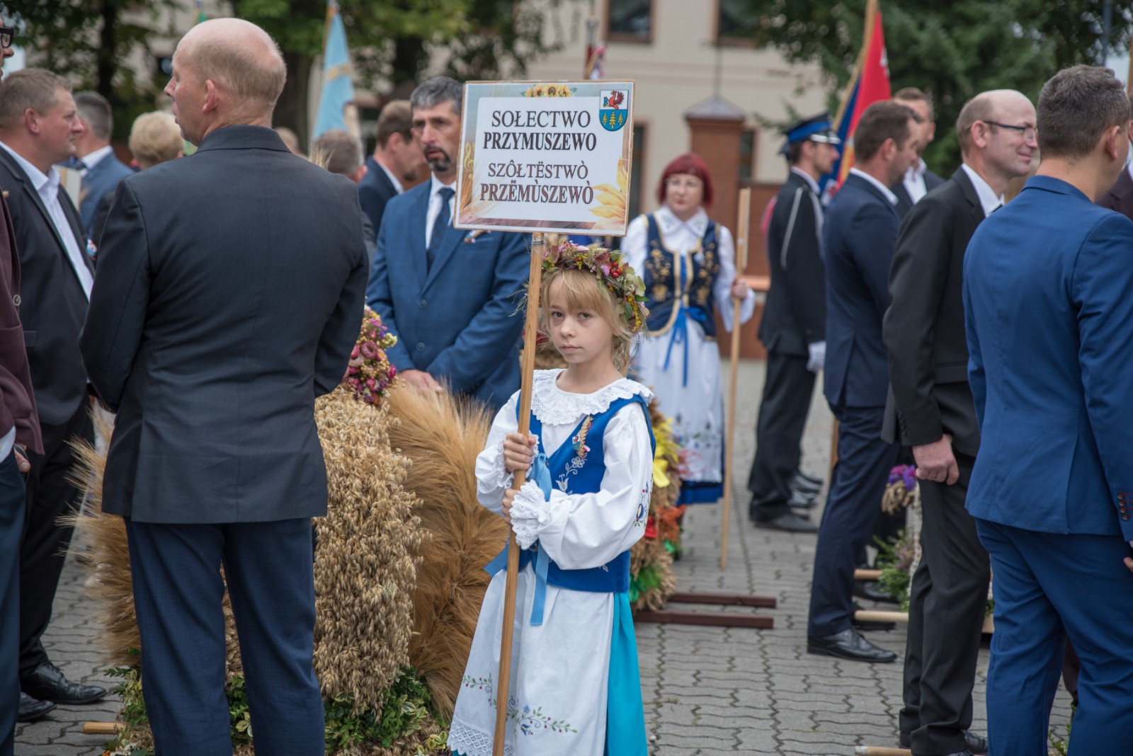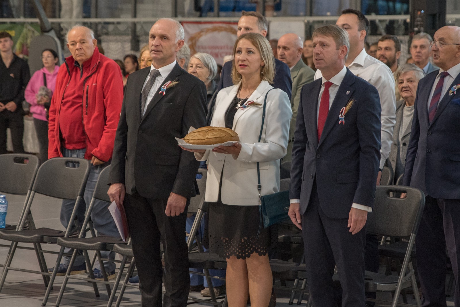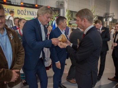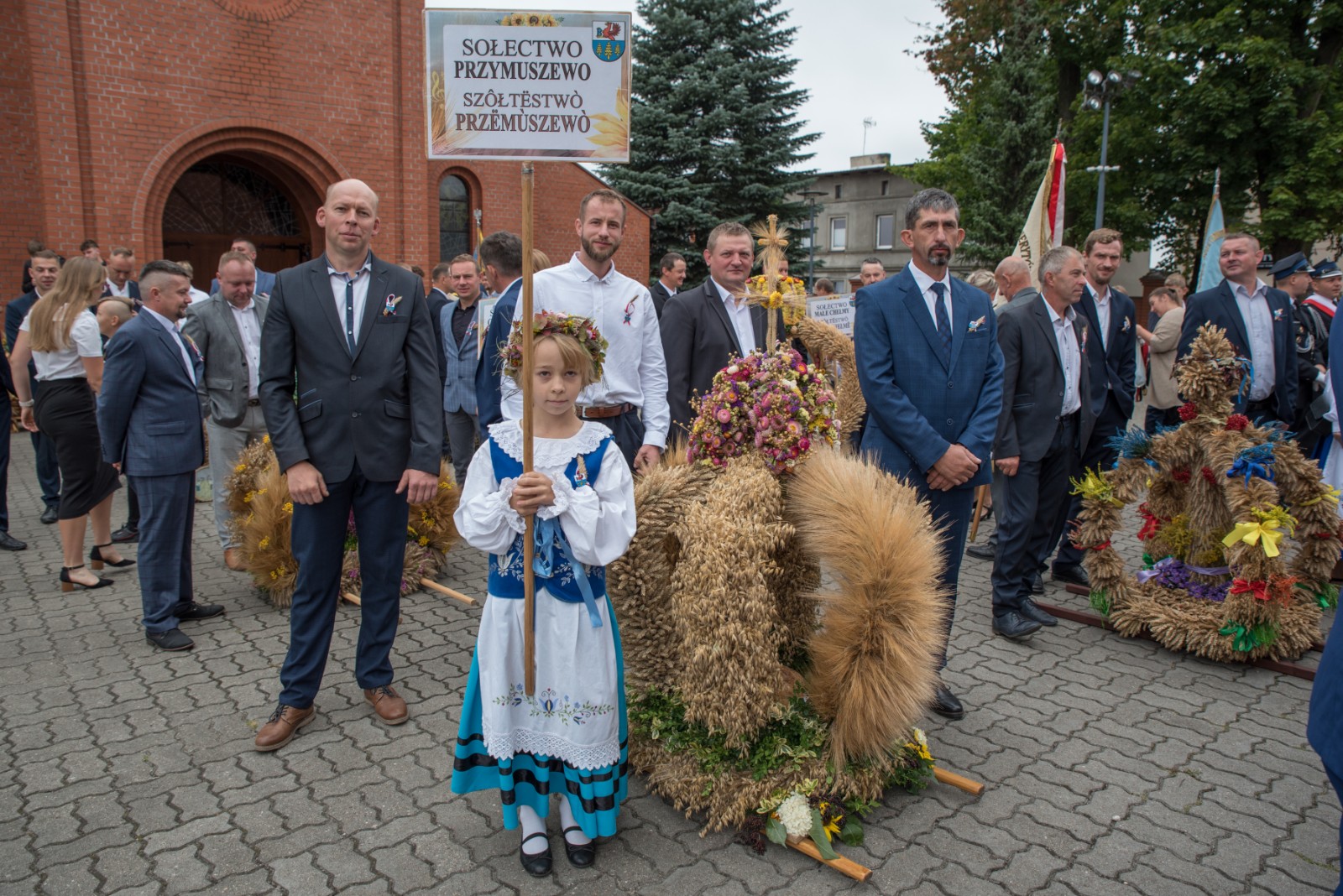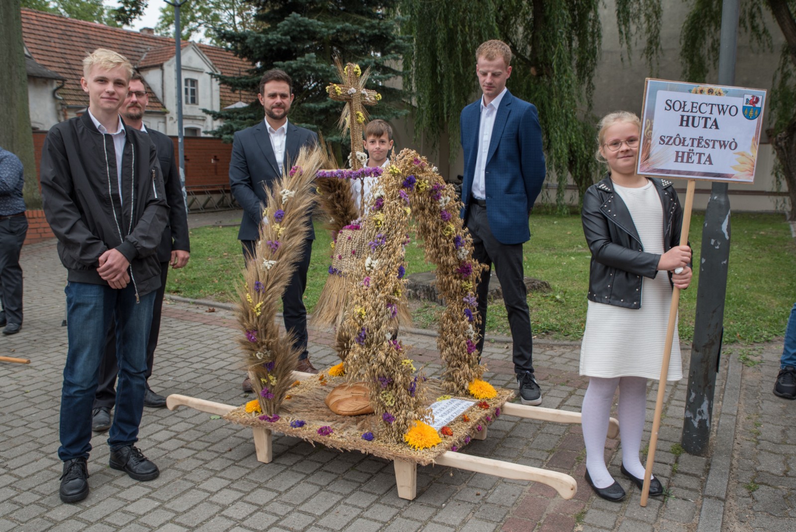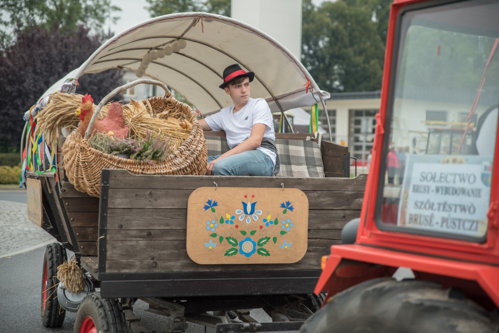Po mszy barwny korowód – pełen kaszubskiej muzyki, stukotu końskich kopyt i warkotu maszyn rolniczych – przeszedł do Hali Sportowo-Widowiskowej, gdzie odbyła się główna część uroczystości. Świętowanie otworzył huk armatni Kurkowego Bractwa Strzeleckiego, wspólny śpiew hymnu narodowego oraz dzielenie się chlebem, którego dokonali burmistrz Brus Witold Ossowski oraz starostowie dożynek – Daria Miszewska i Andrzej Stoltmann.
