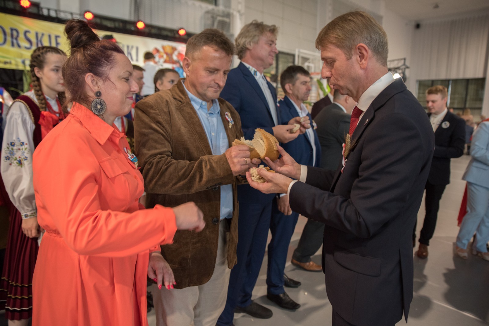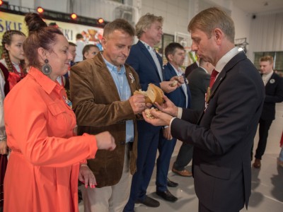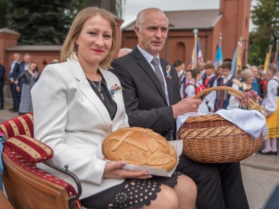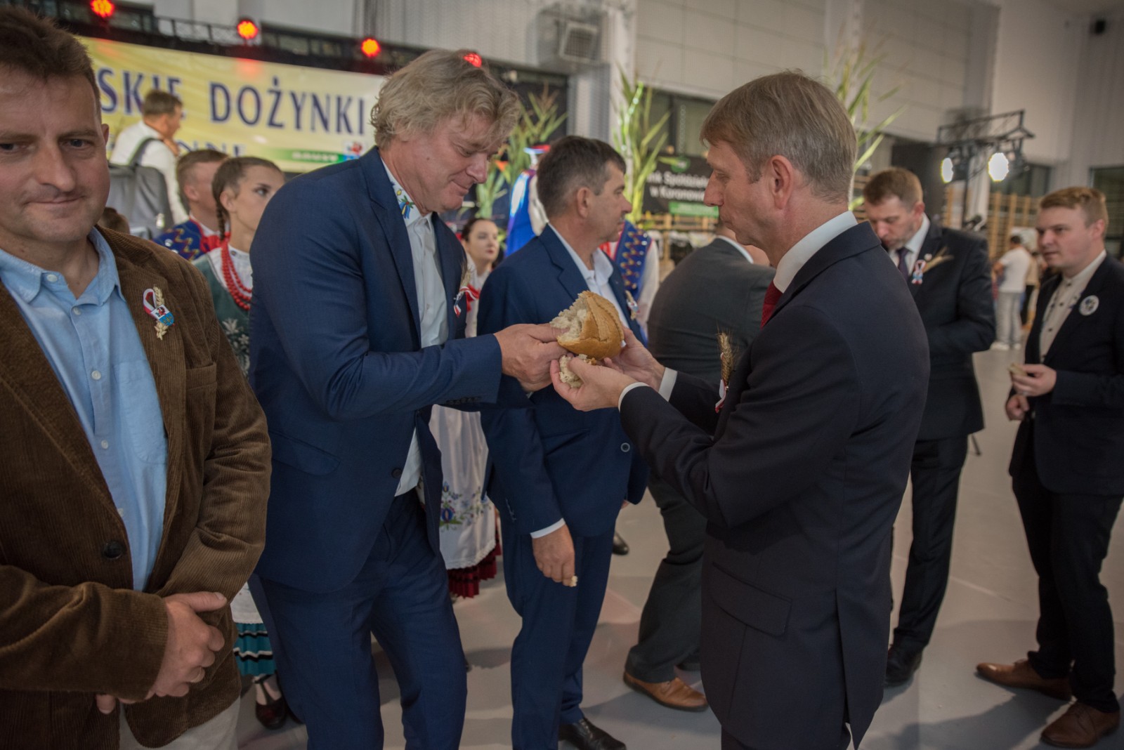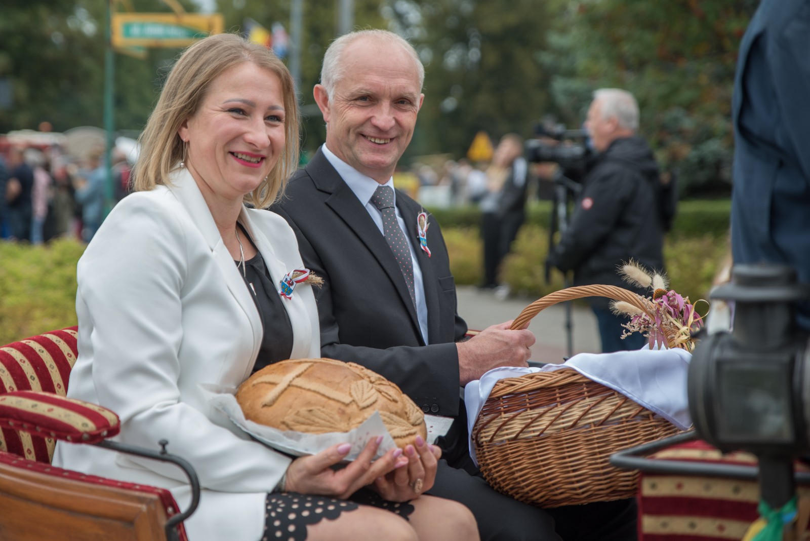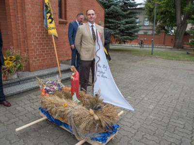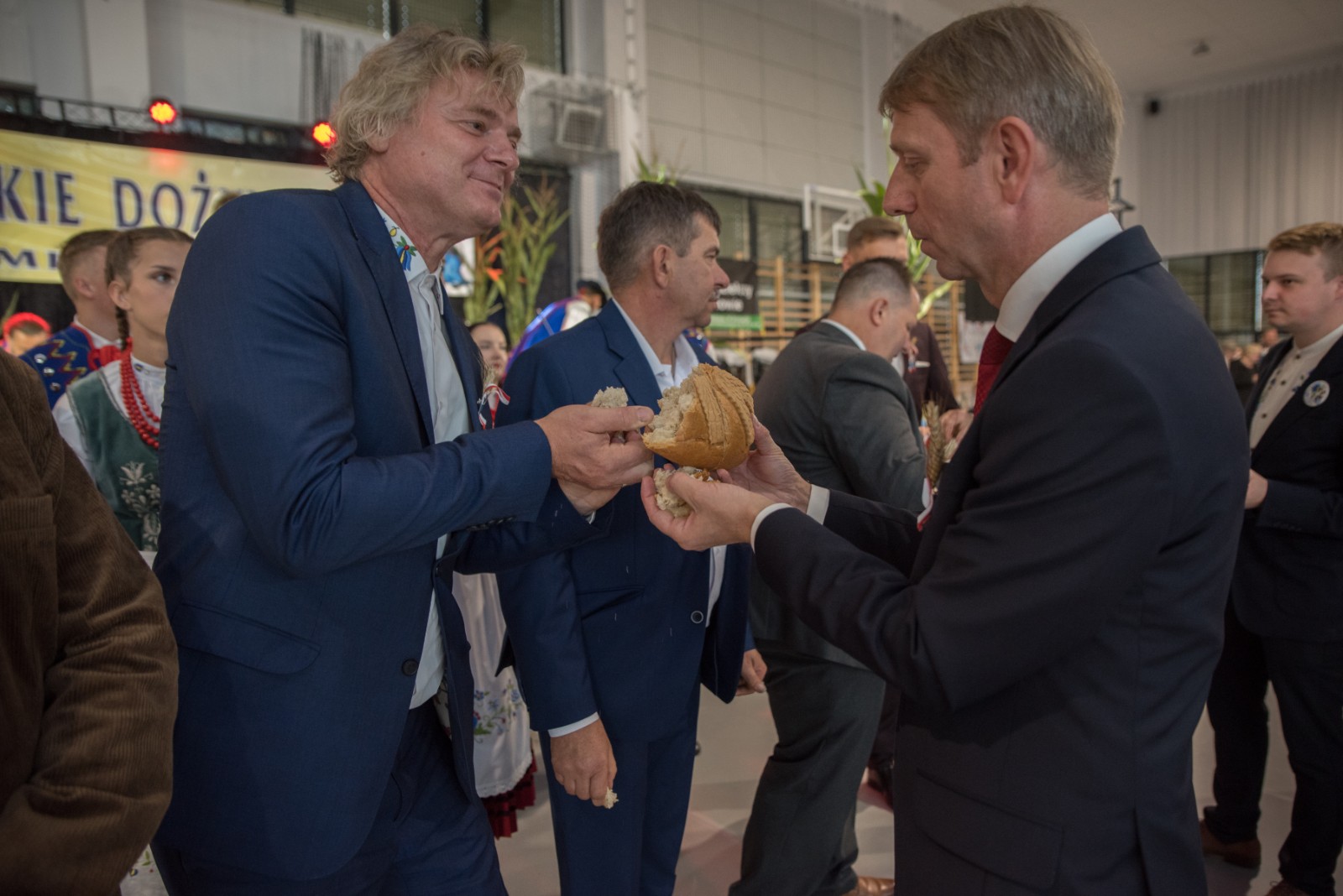 Po mszy barwny korowód – pełen kaszubskiej muzyki, stukotu końskich kopyt i warkotu maszyn rolniczych – przeszedł do Hali Sportowo-Widowiskowej, gdzie odbyła się główna część uroczystości. Świętowanie otworzył huk armatni Kurkowego Bractwa Strzeleckiego, wspólny śpiew hymnu narodowego oraz dzielenie się chlebem, którego dokonali burmistrz Brus Witold Ossowski oraz starostowie dożynek – Daria Miszewska i Andrzej Stoltmann.