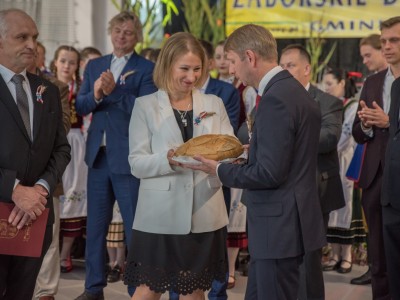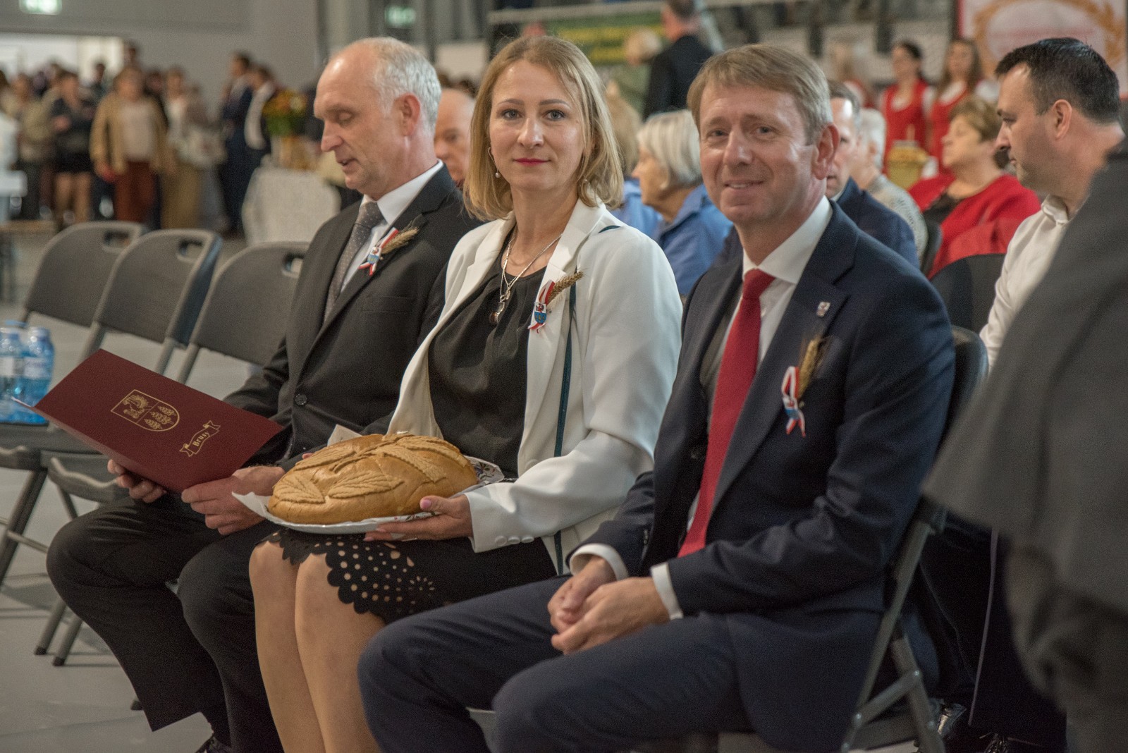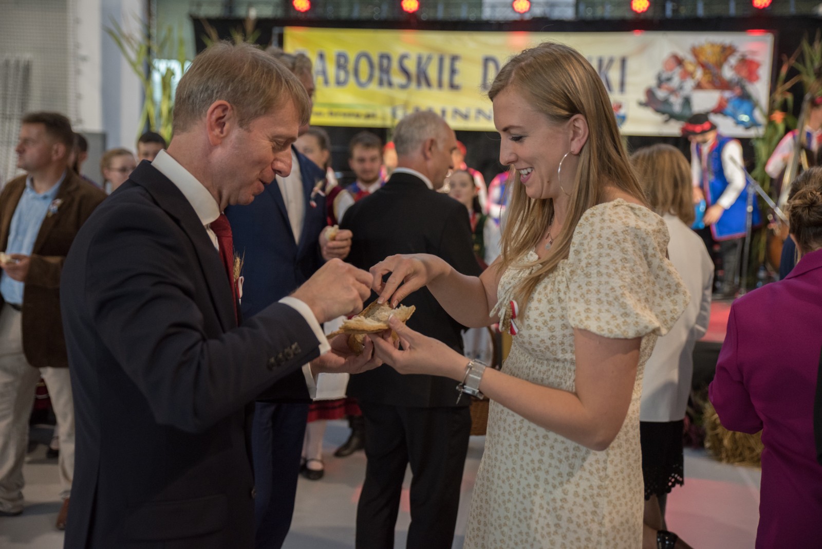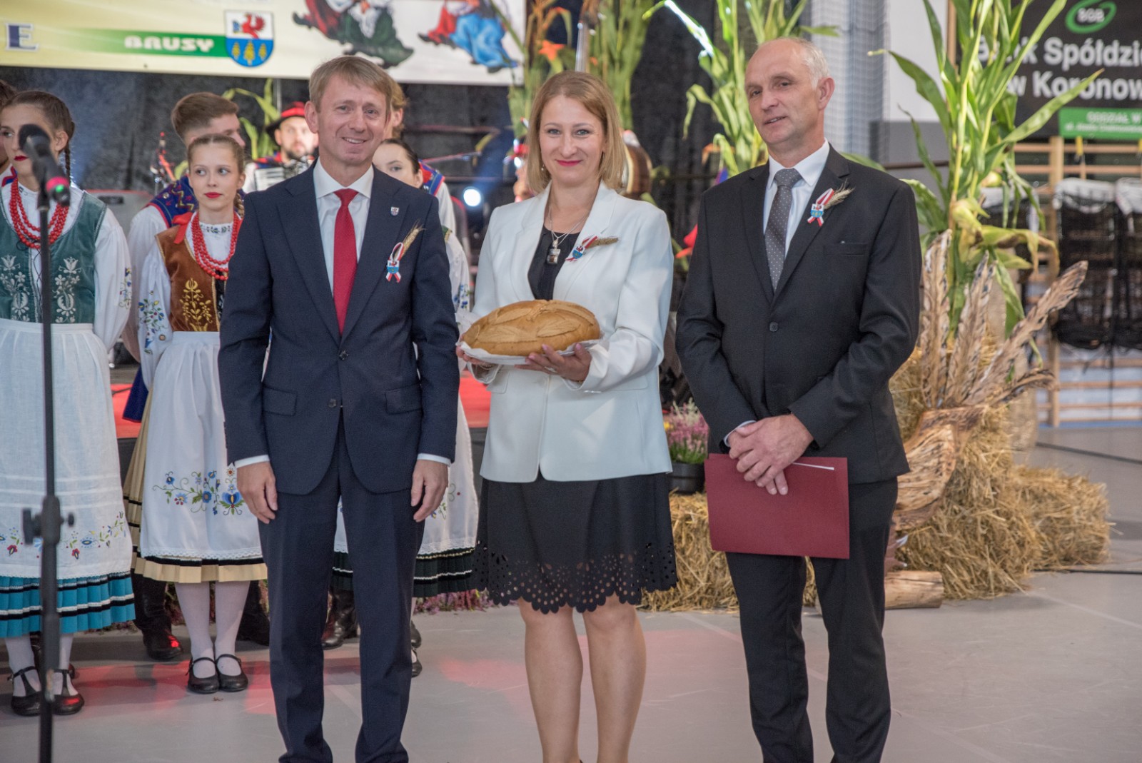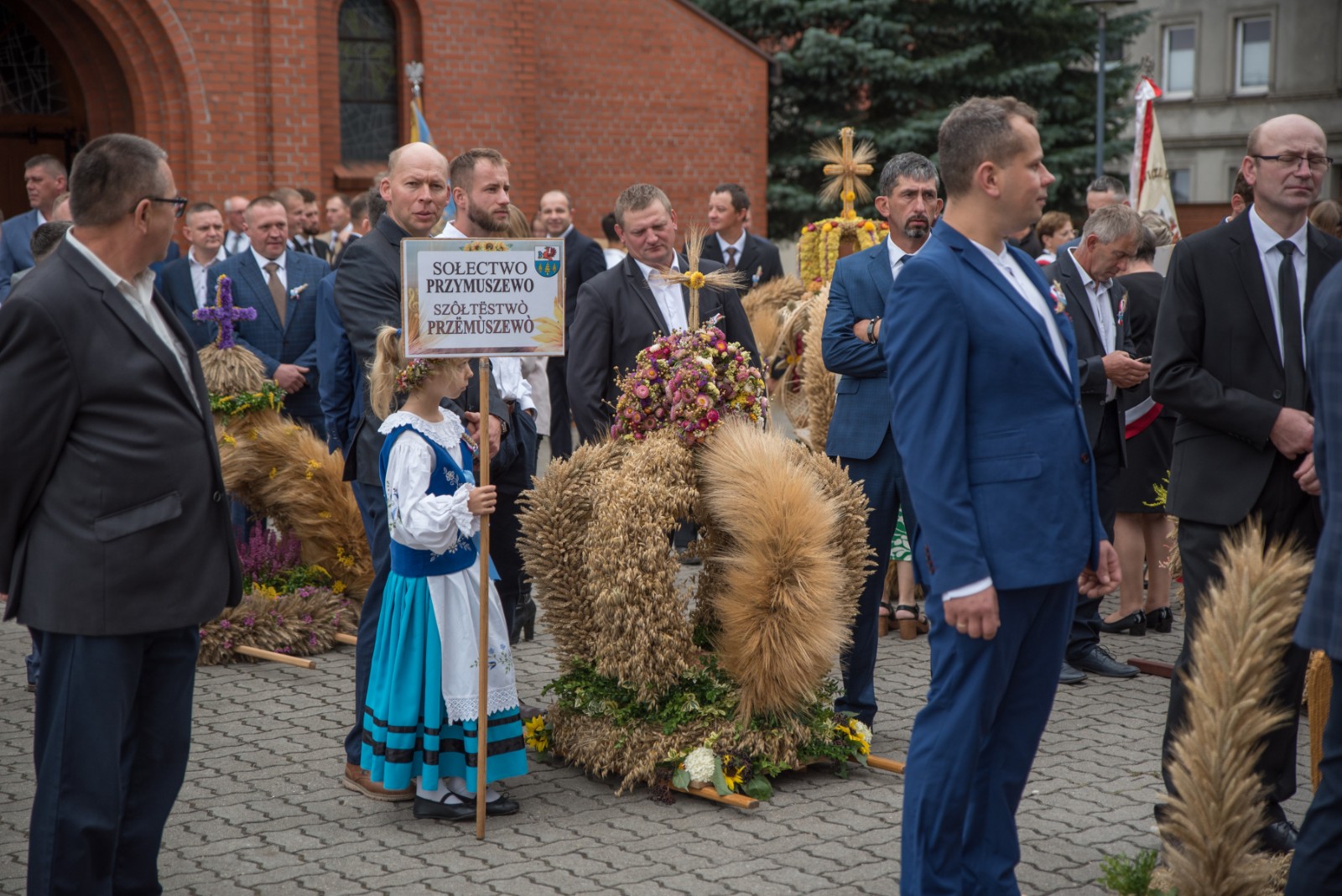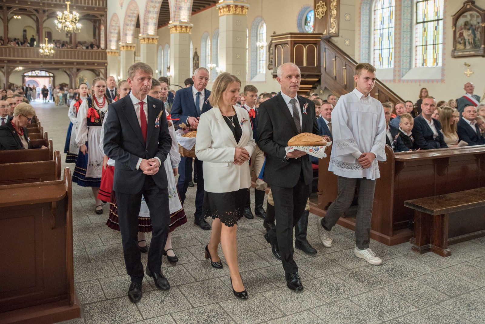 Po mszy barwny korowód – pełen kaszubskiej muzyki, stukotu końskich kopyt i warkotu maszyn rolniczych – przeszedł do Hali Sportowo-Widowiskowej, gdzie odbyła się główna część uroczystości. Świętowanie otworzył huk armatni Kurkowego Bractwa Strzeleckiego, wspólny śpiew hymnu narodowego oraz dzielenie się chlebem, którego dokonali burmistrz Brus Witold Ossowski oraz starostowie dożynek – Daria Miszewska i Andrzej Stoltmann.