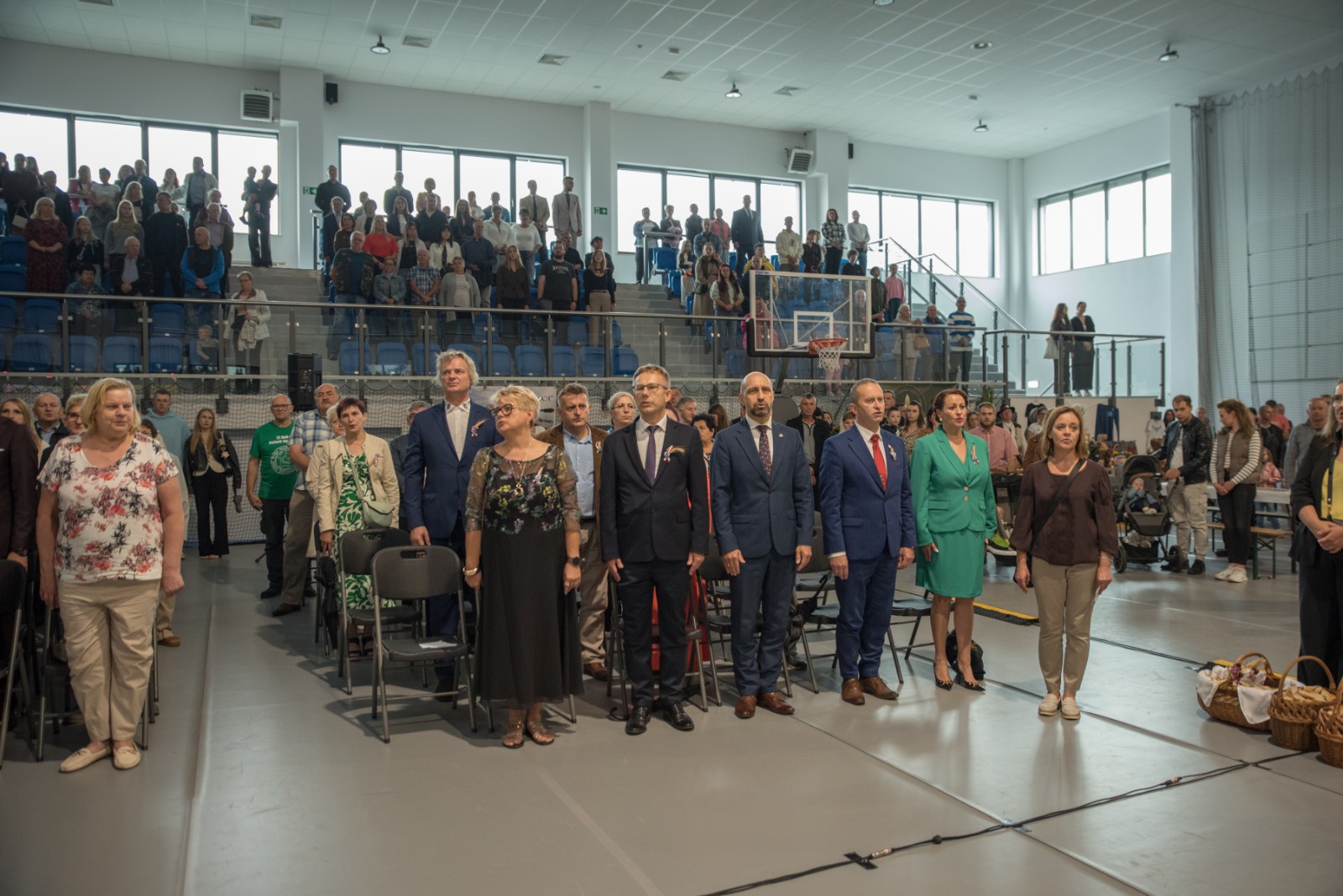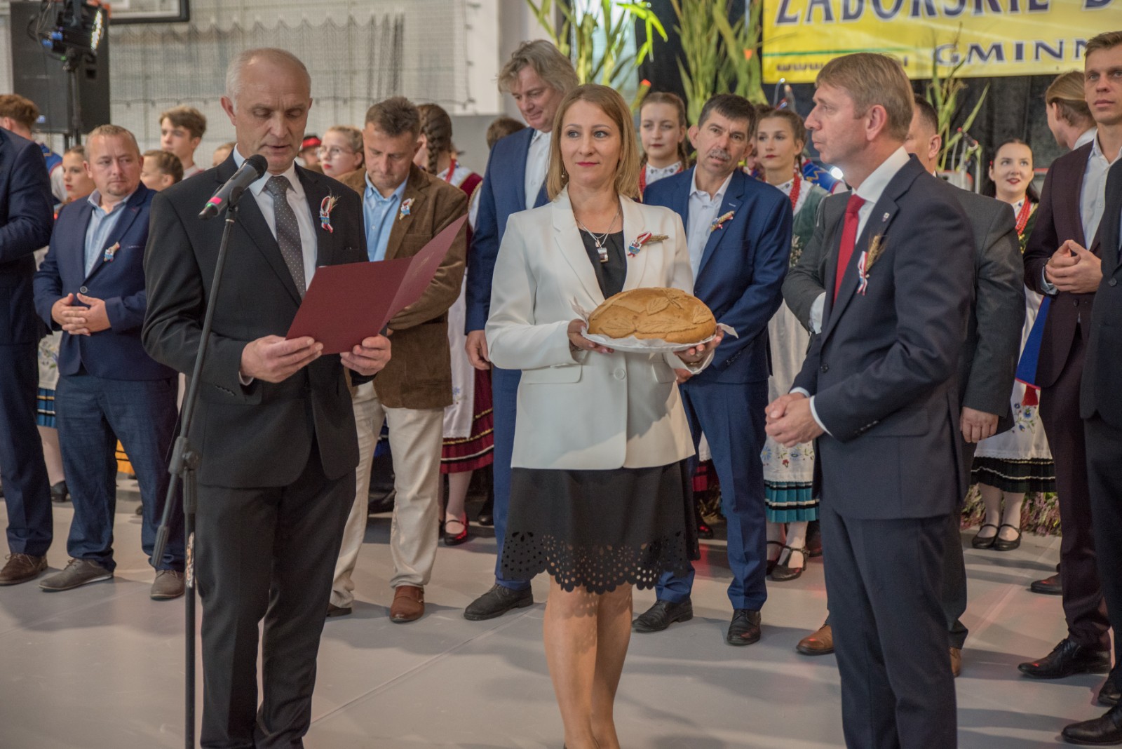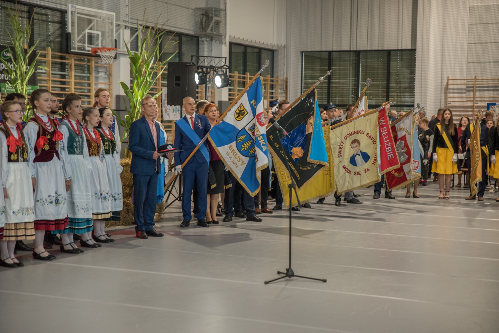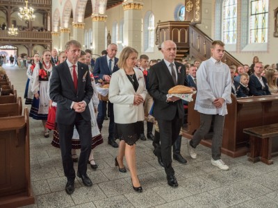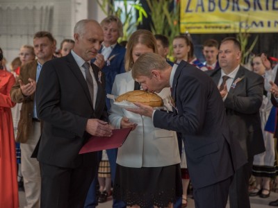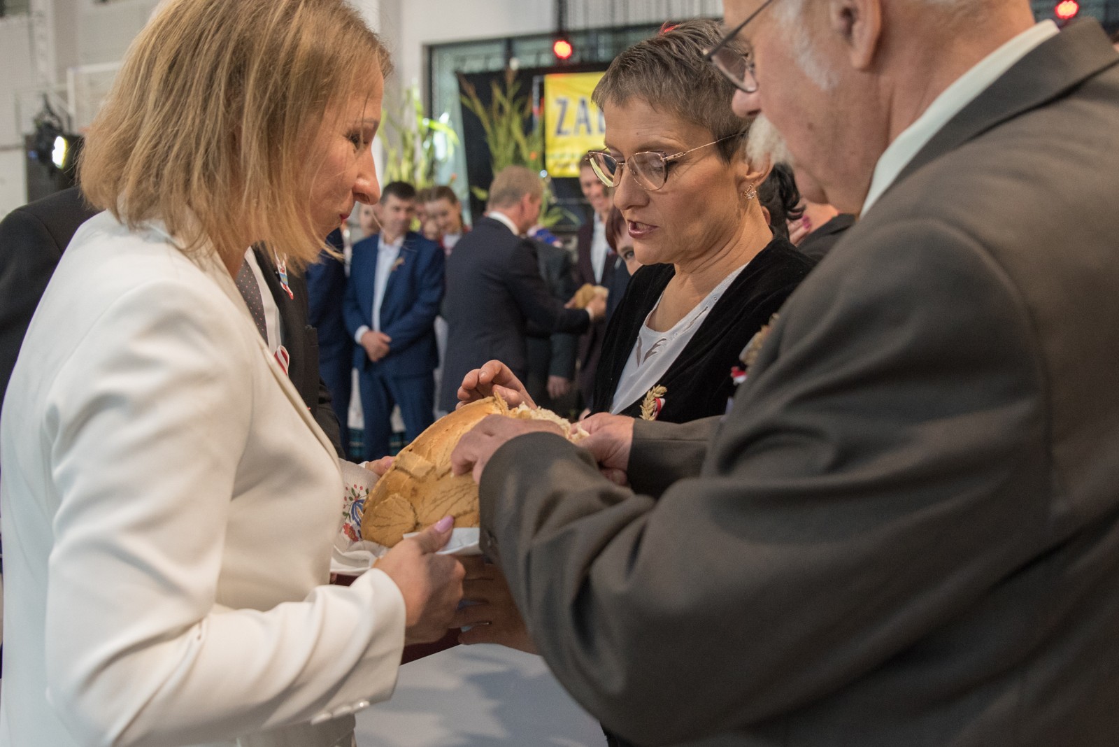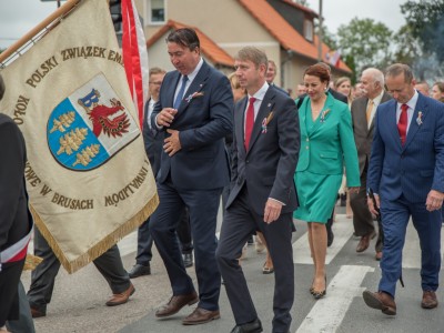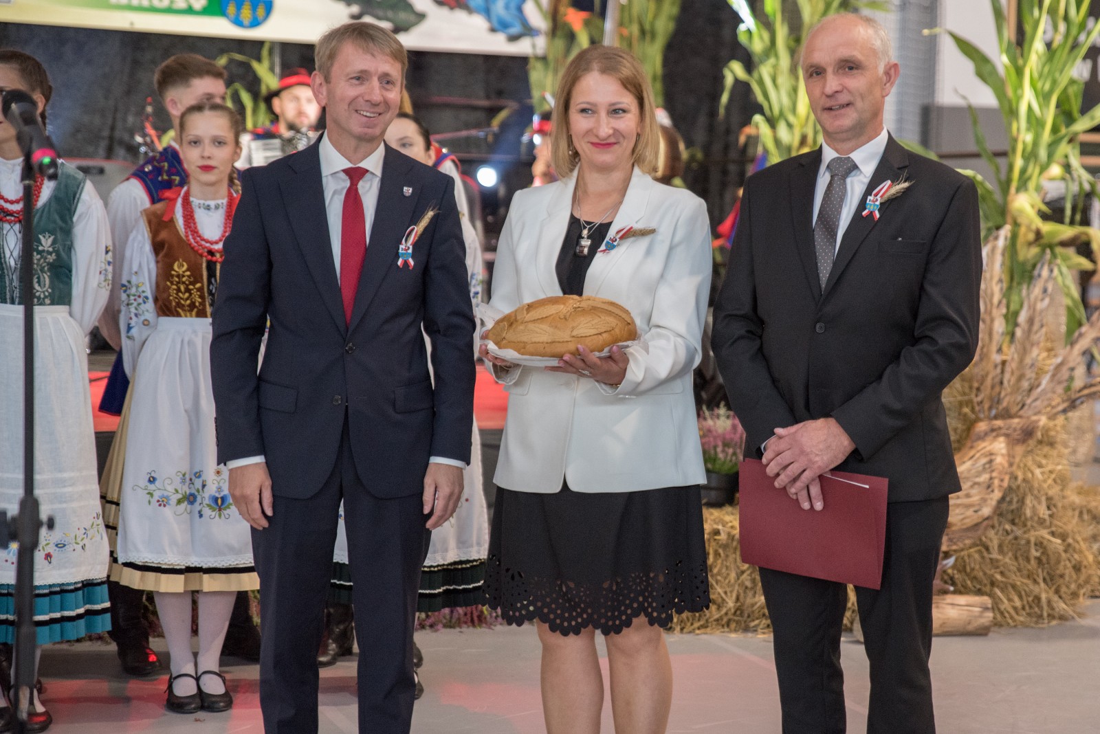 Po mszy barwny korowód – pełen kaszubskiej muzyki, stukotu końskich kopyt i warkotu maszyn rolniczych – przeszedł do Hali Sportowo-Widowiskowej, gdzie odbyła się główna część uroczystości. Świętowanie otworzył huk armatni Kurkowego Bractwa Strzeleckiego, wspólny śpiew hymnu narodowego oraz dzielenie się chlebem, którego dokonali burmistrz Brus Witold Ossowski oraz starostowie dożynek – Daria Miszewska i Andrzej Stoltmann.
