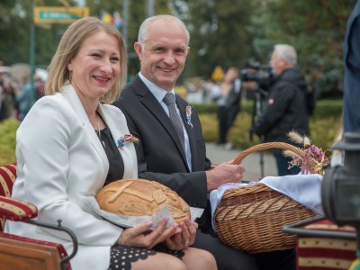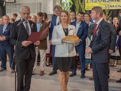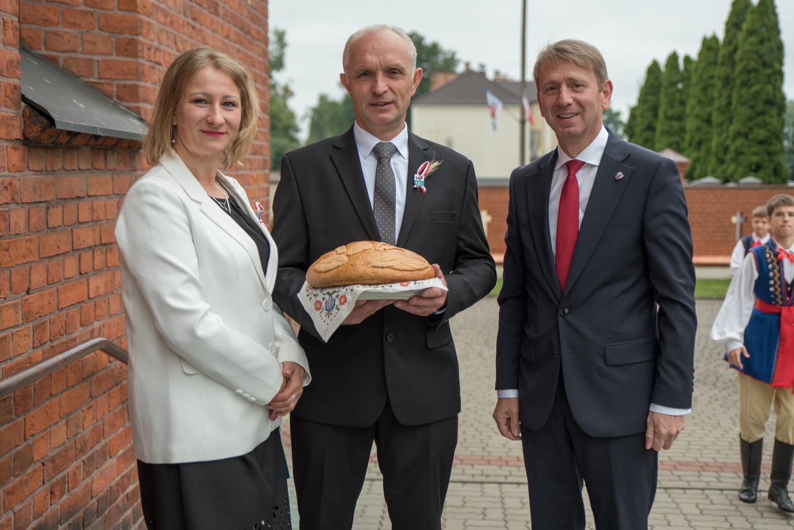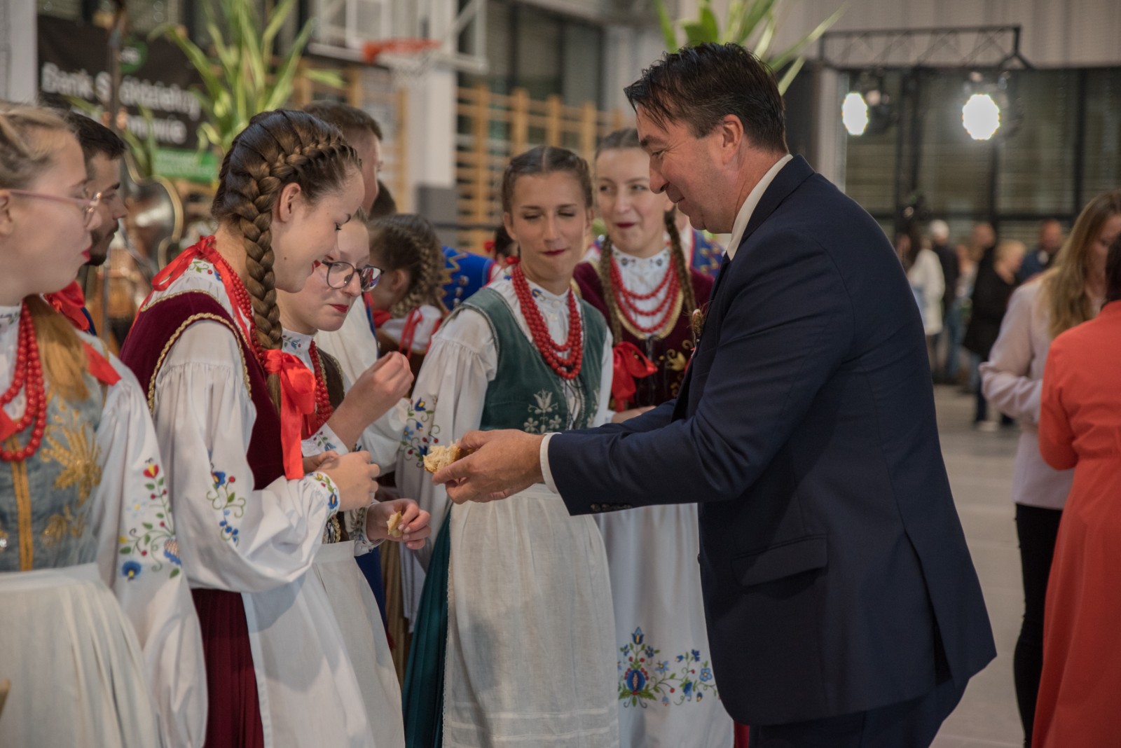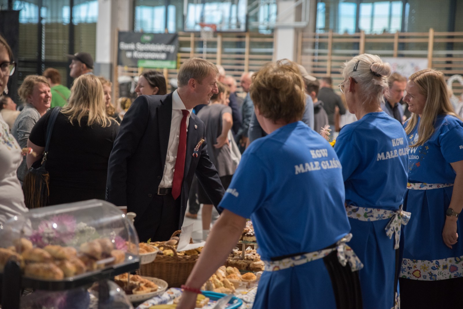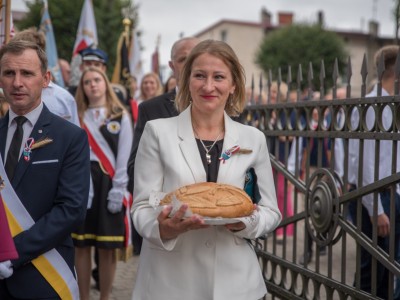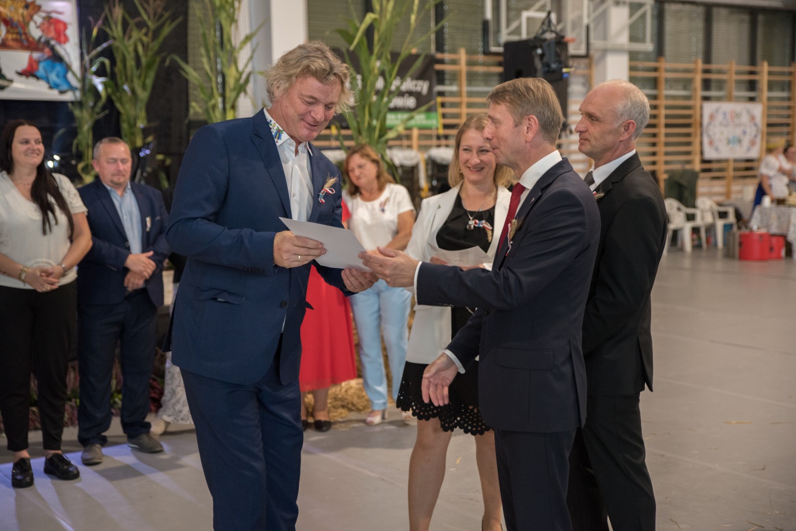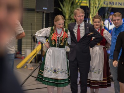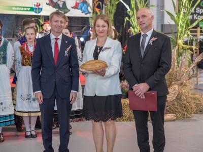 Po mszy barwny korowód – pełen kaszubskiej muzyki, stukotu końskich kopyt i warkotu maszyn rolniczych – przeszedł do Hali Sportowo-Widowiskowej, gdzie odbyła się główna część uroczystości. Świętowanie otworzył huk armatni Kurkowego Bractwa Strzeleckiego, wspólny śpiew hymnu narodowego oraz dzielenie się chlebem, którego dokonali burmistrz Brus Witold Ossowski oraz starostowie dożynek – Daria Miszewska i Andrzej Stoltmann.