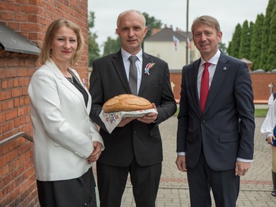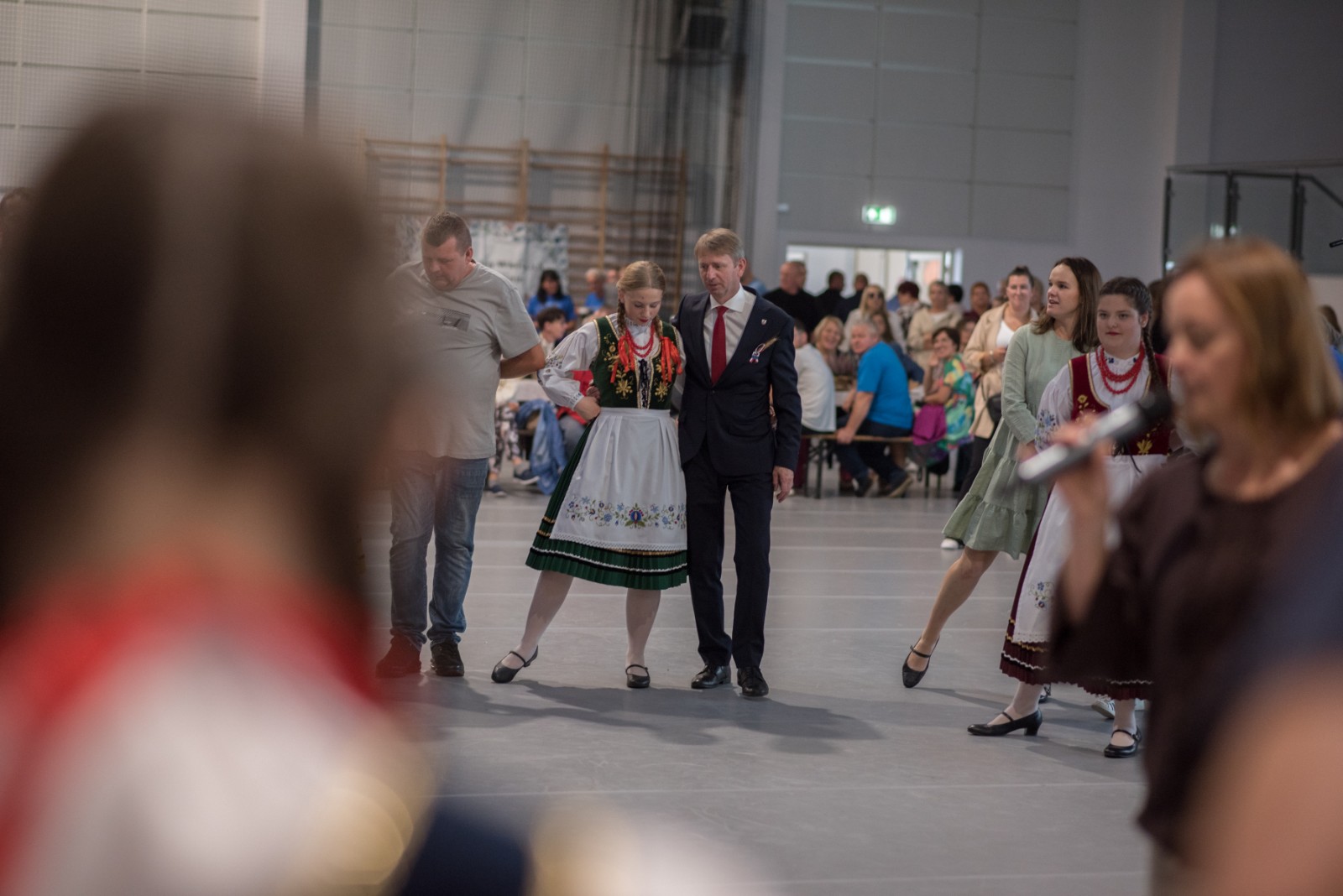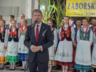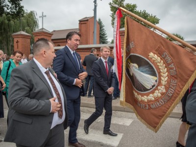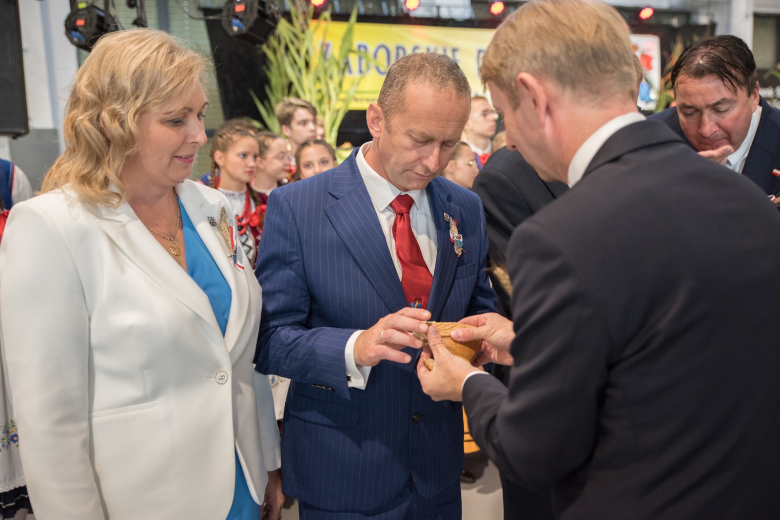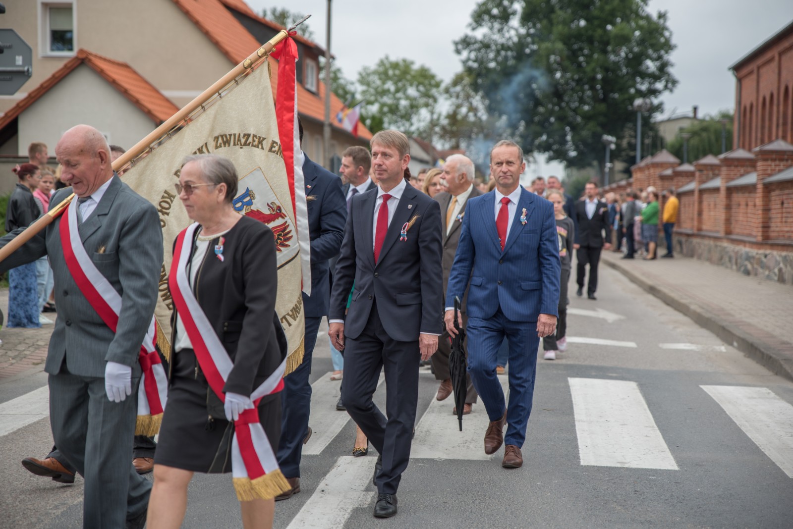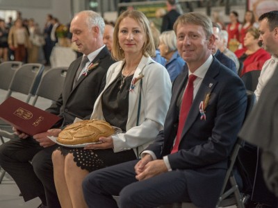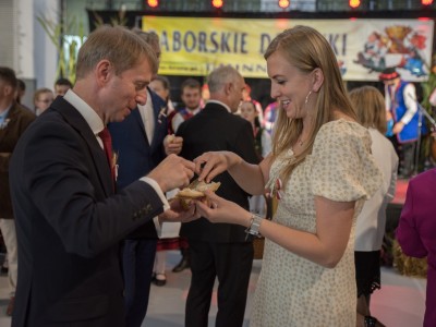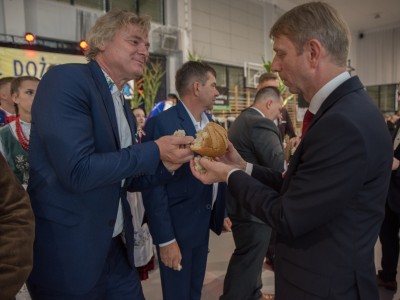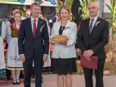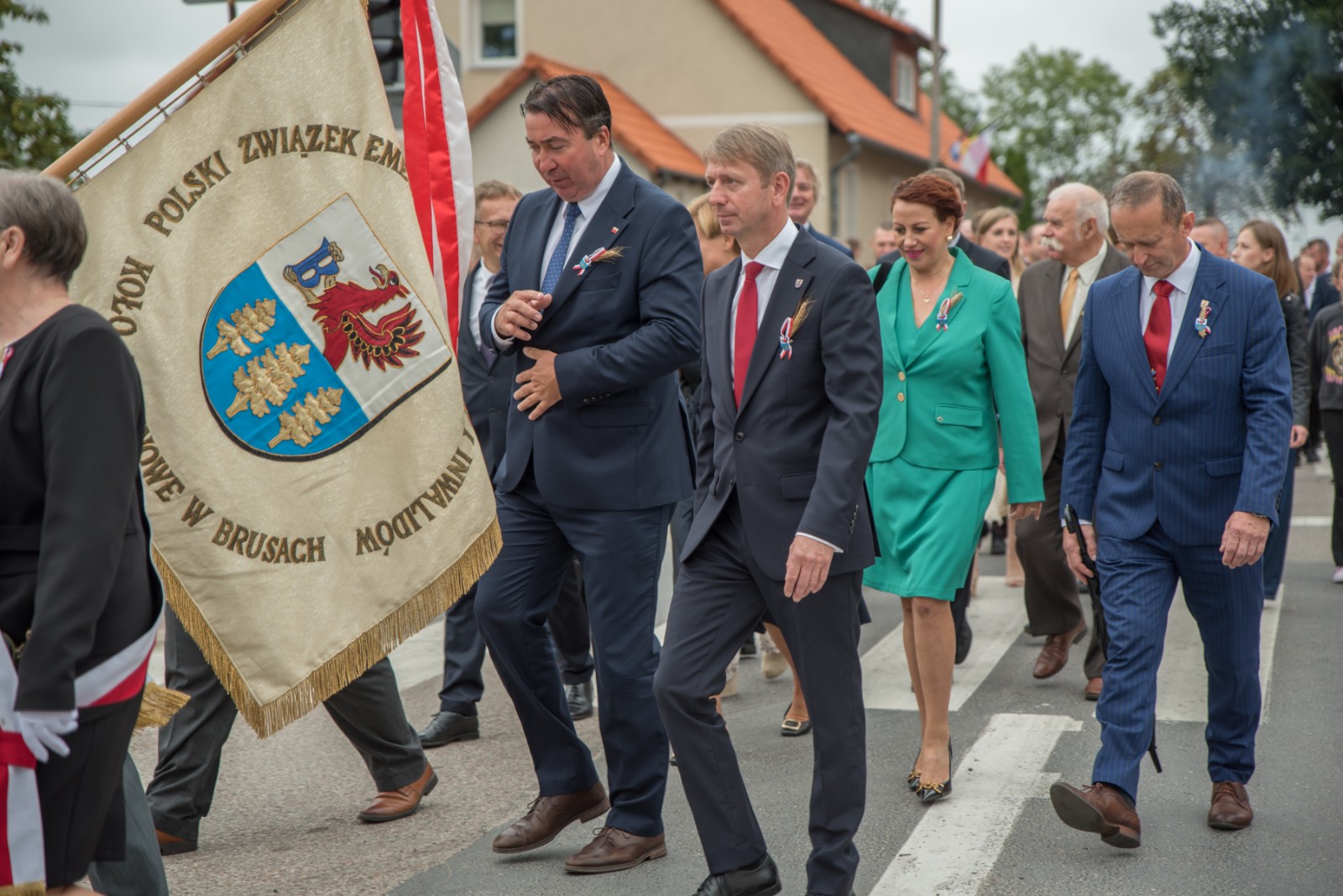 Po mszy barwny korowód – pełen kaszubskiej muzyki, stukotu końskich kopyt i warkotu maszyn rolniczych – przeszedł do Hali Sportowo-Widowiskowej, gdzie odbyła się główna część uroczystości. Świętowanie otworzył huk armatni Kurkowego Bractwa Strzeleckiego, wspólny śpiew hymnu narodowego oraz dzielenie się chlebem, którego dokonali burmistrz Brus Witold Ossowski oraz starostowie dożynek – Daria Miszewska i Andrzej Stoltmann.