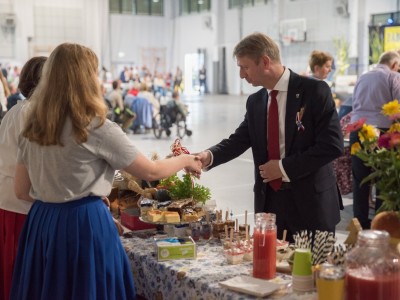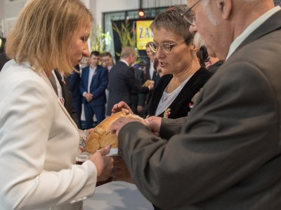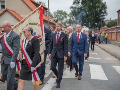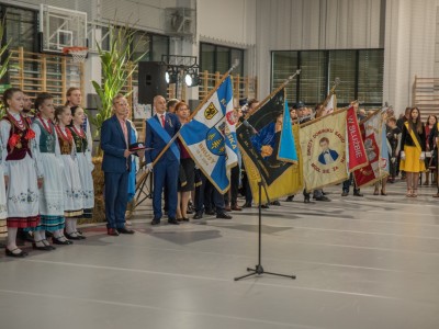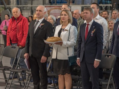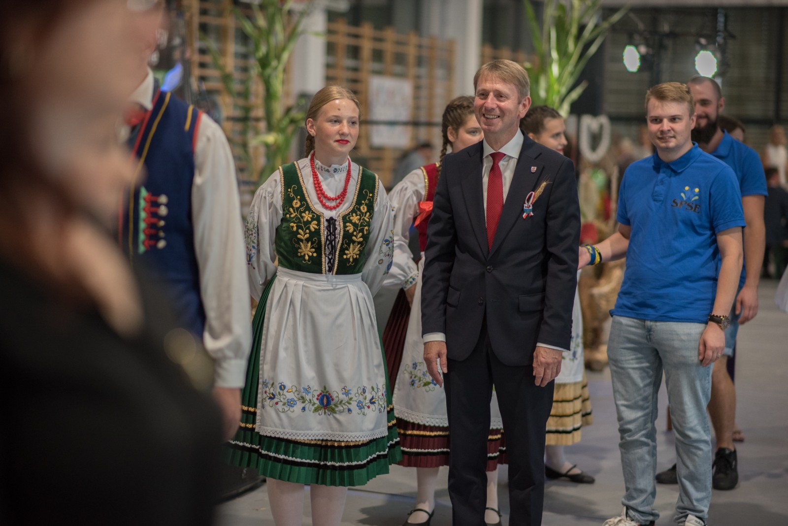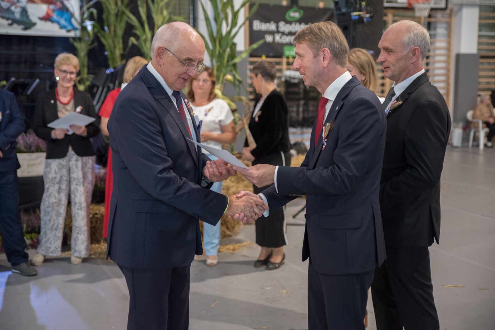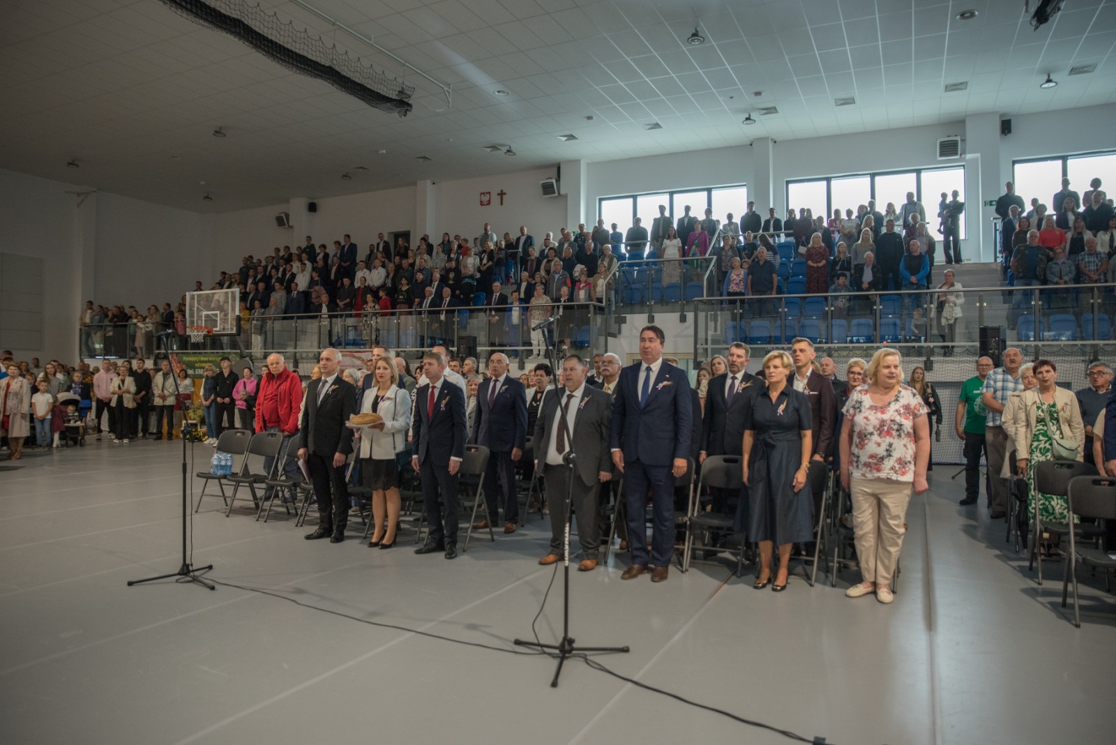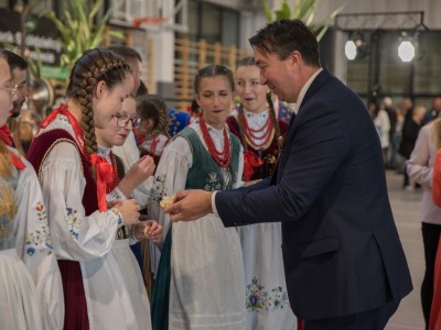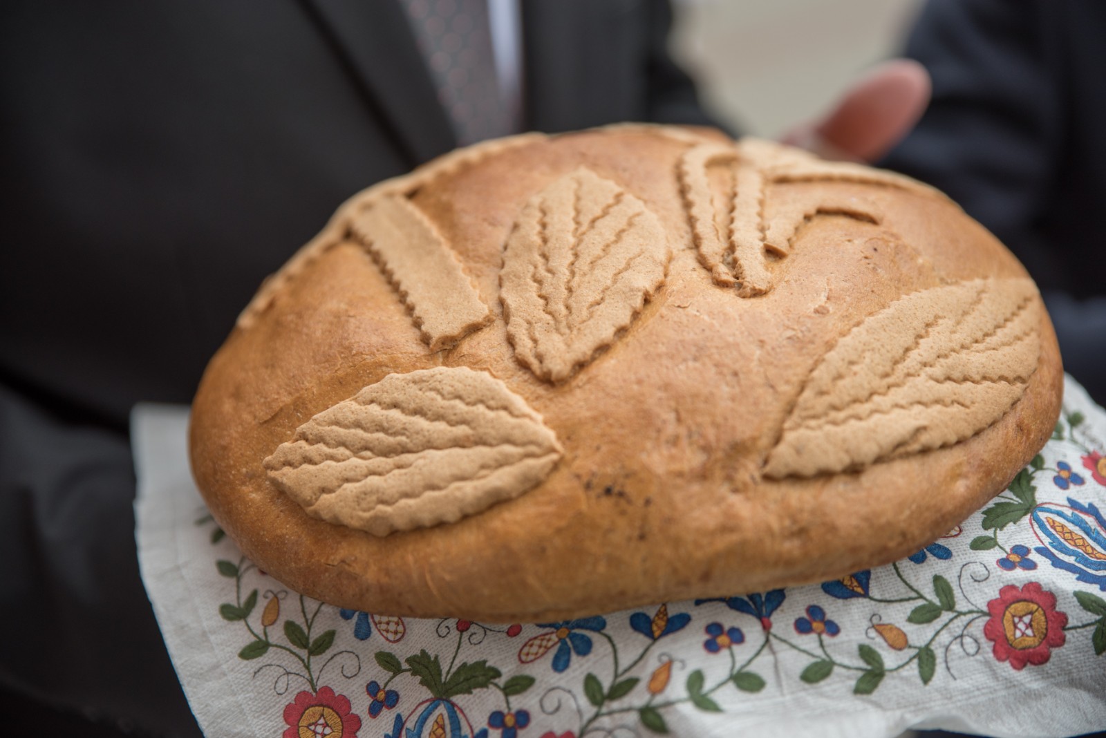 Po mszy barwny korowód – pełen kaszubskiej muzyki, stukotu końskich kopyt i warkotu maszyn rolniczych – przeszedł do Hali Sportowo-Widowiskowej, gdzie odbyła się główna część uroczystości. Świętowanie otworzył huk armatni Kurkowego Bractwa Strzeleckiego, wspólny śpiew hymnu narodowego oraz dzielenie się chlebem, którego dokonali burmistrz Brus Witold Ossowski oraz starostowie dożynek – Daria Miszewska i Andrzej Stoltmann.