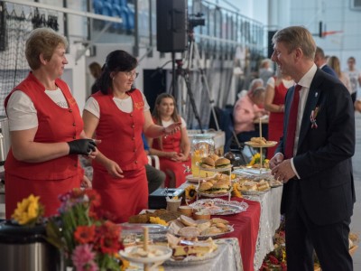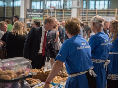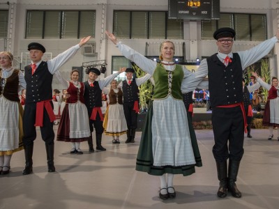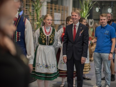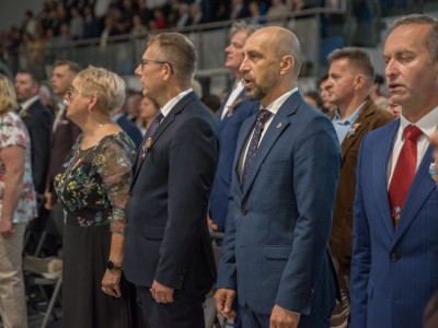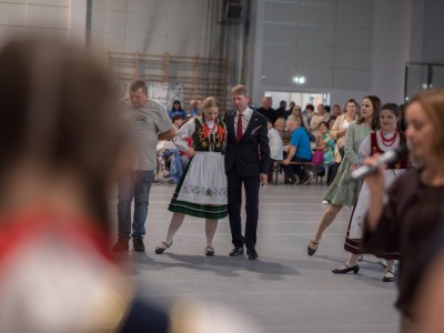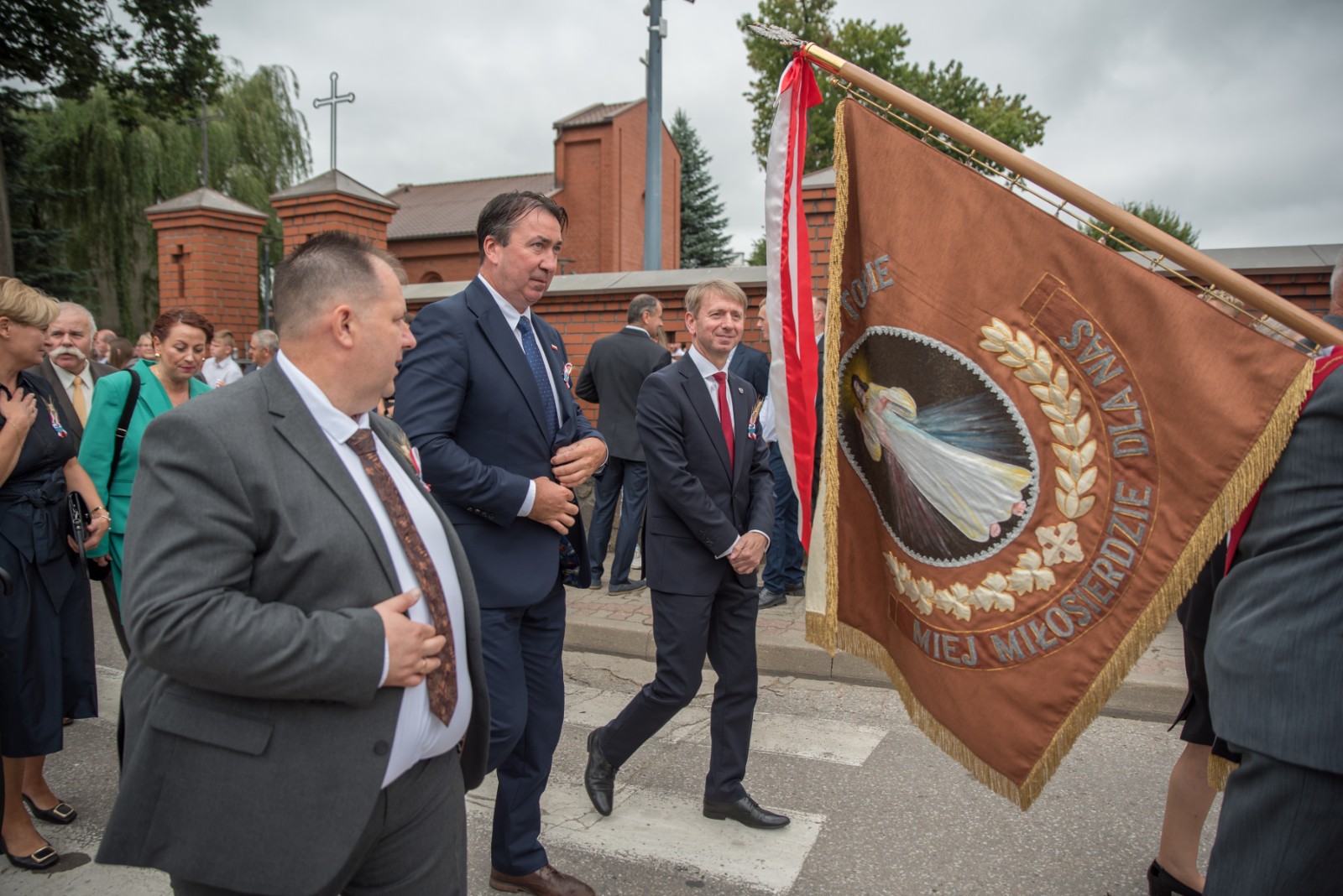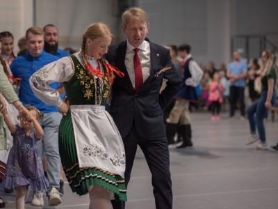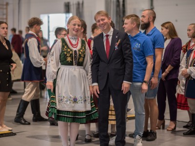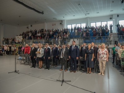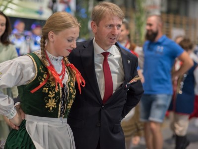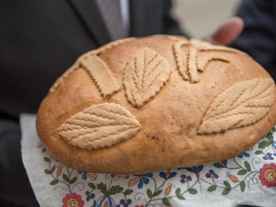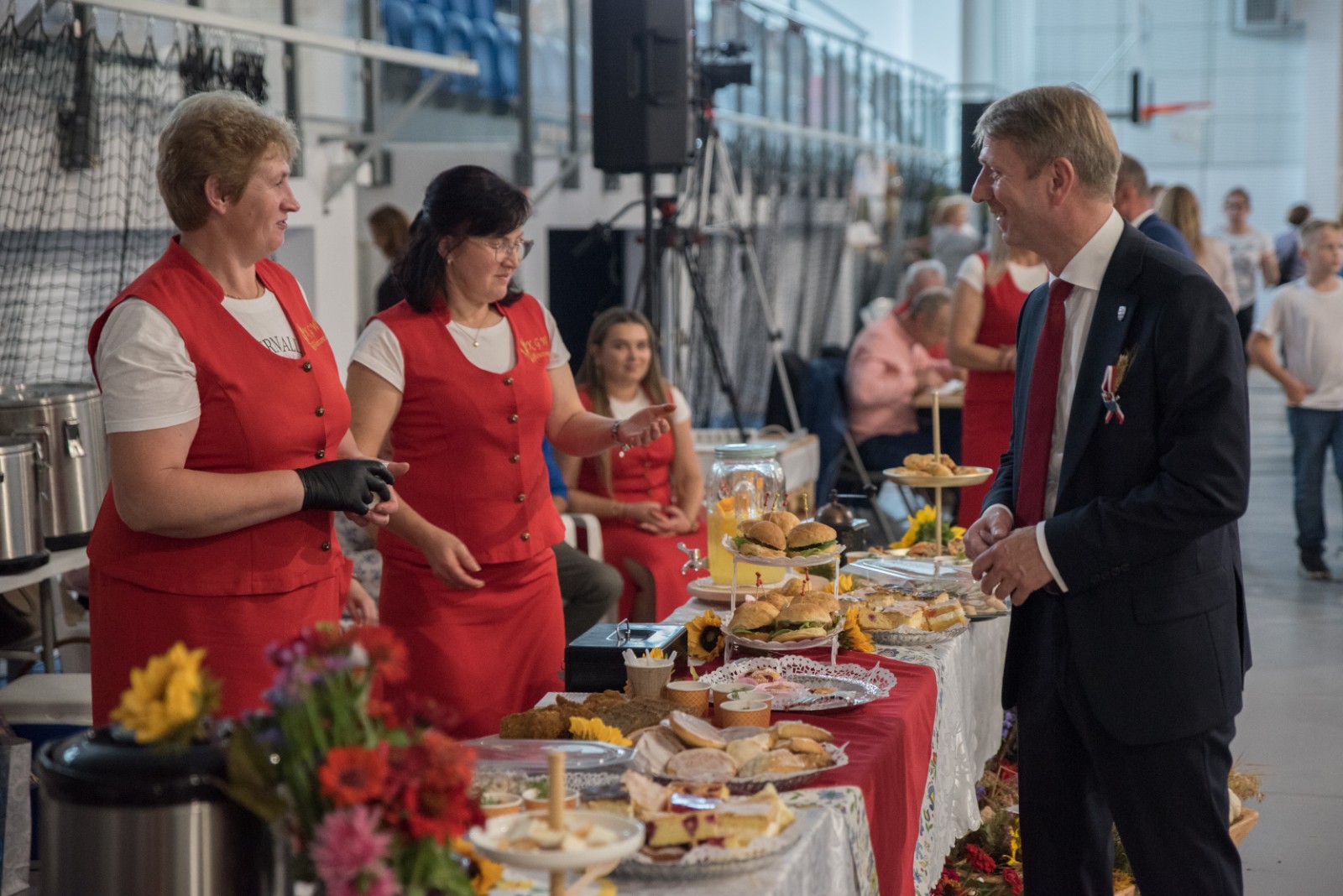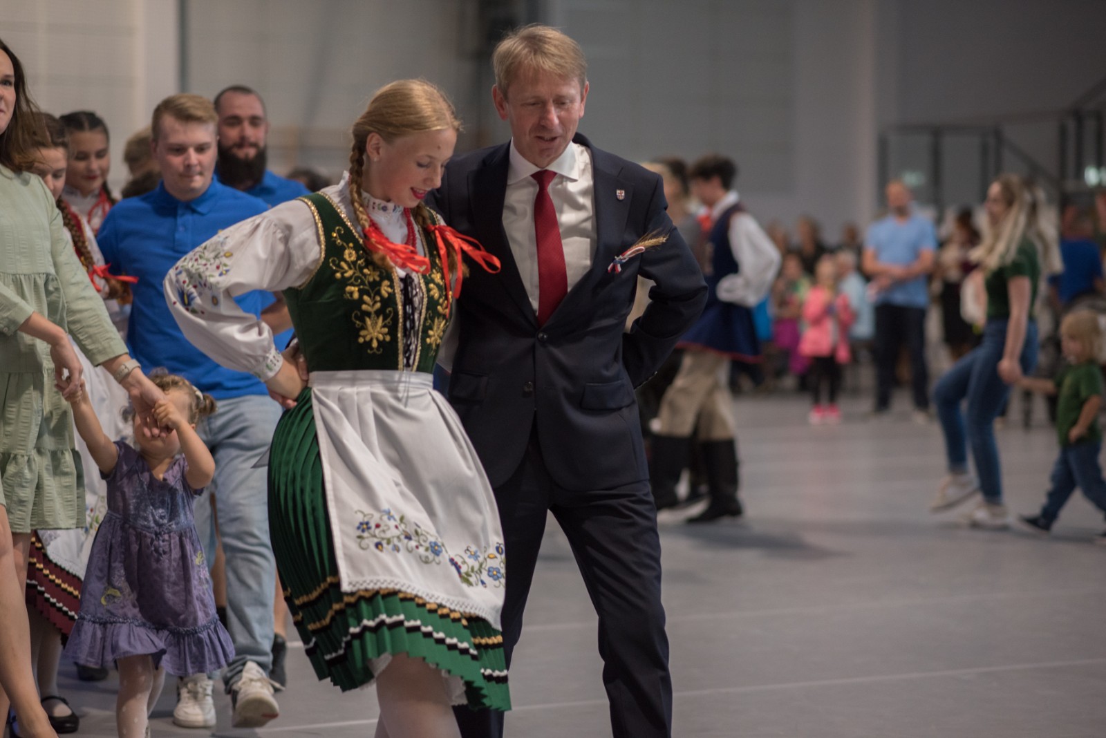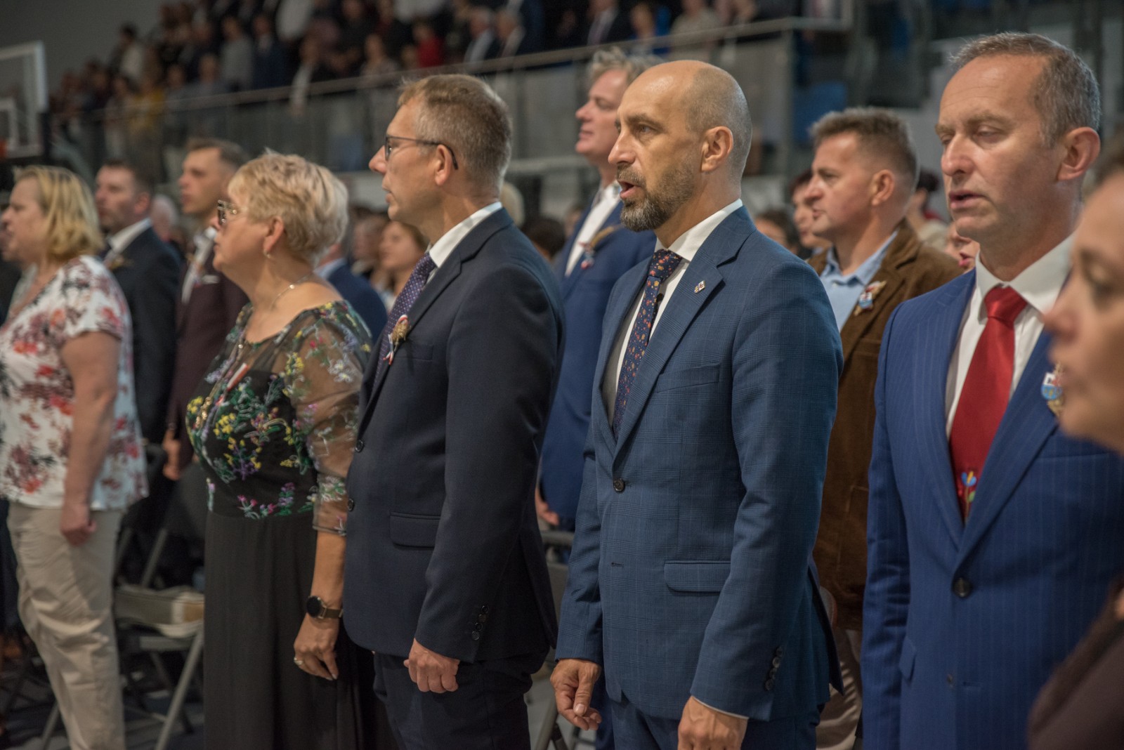 Po mszy barwny korowód – pełen kaszubskiej muzyki, stukotu końskich kopyt i warkotu maszyn rolniczych – przeszedł do Hali Sportowo-Widowiskowej, gdzie odbyła się główna część uroczystości. Świętowanie otworzył huk armatni Kurkowego Bractwa Strzeleckiego, wspólny śpiew hymnu narodowego oraz dzielenie się chlebem, którego dokonali burmistrz Brus Witold Ossowski oraz starostowie dożynek – Daria Miszewska i Andrzej Stoltmann.