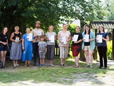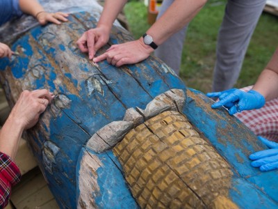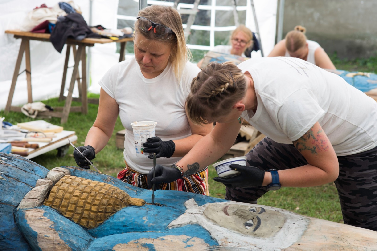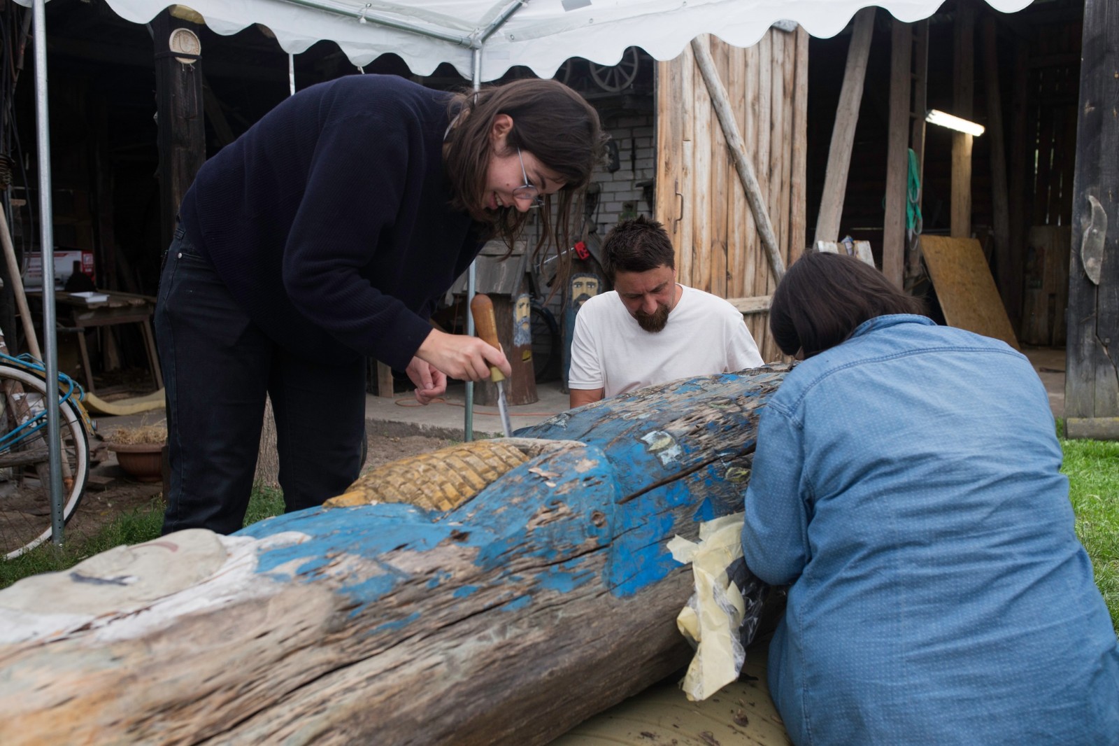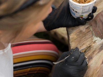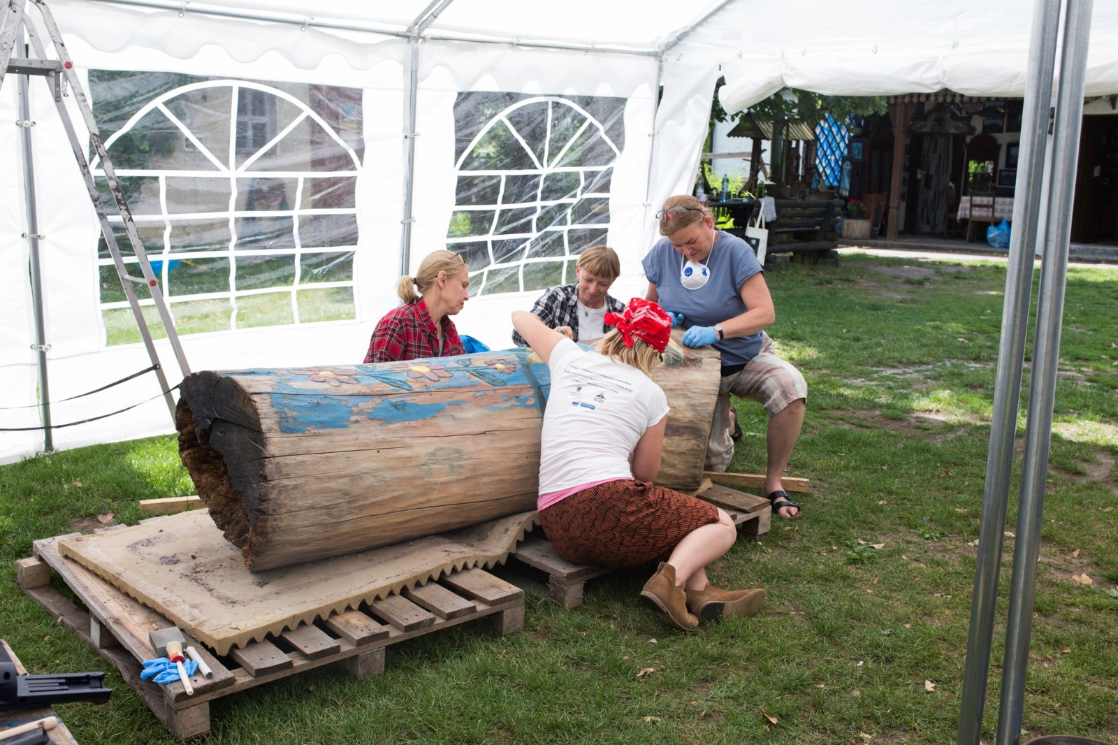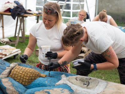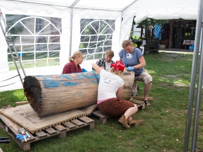 Tym razem wolontariuszki, które zgłosiły się do podjęcia prac konserwatorskich, miały za zadanie oczyścić i zabezpieczyć dwie figuralne, drewniane rzeźby - ule przedstawiające Panią z koszką i Panią ze słowikiem. Ponadto na warsztat wzięto glinianą donicę z malunkami Chełmowskiego. Konserwatorki działały pod czujnym okiem instruktorów. Pracy było sporo, a efekty można podziwiać w skansenie w Brusach - Jagliach.