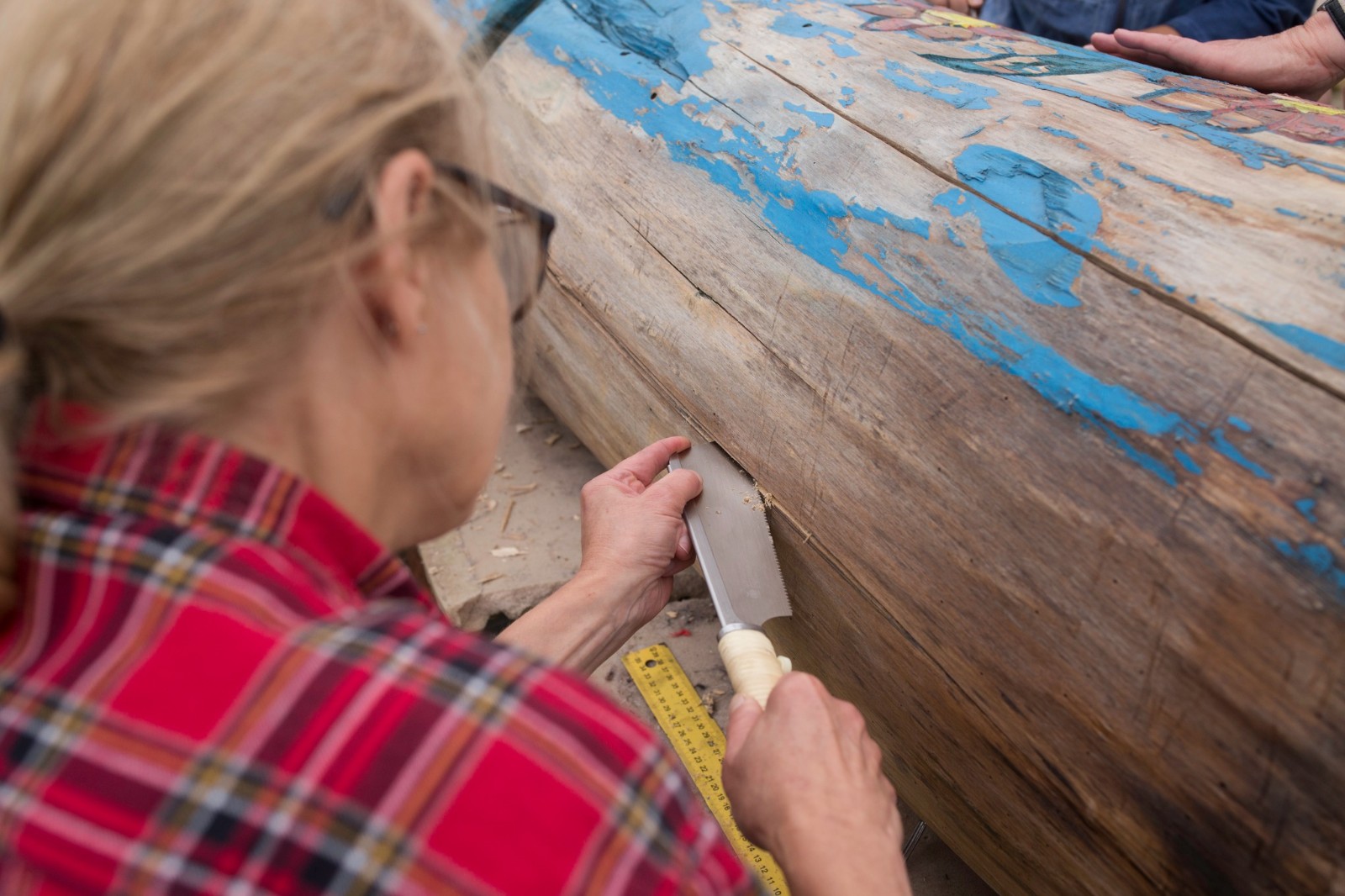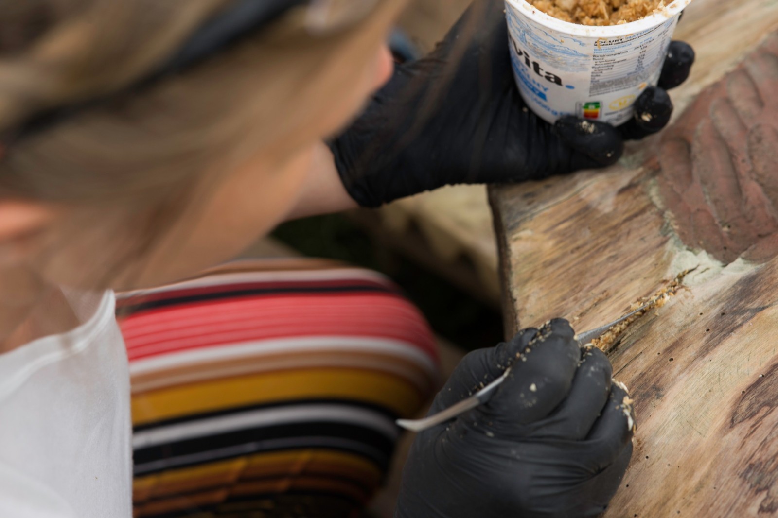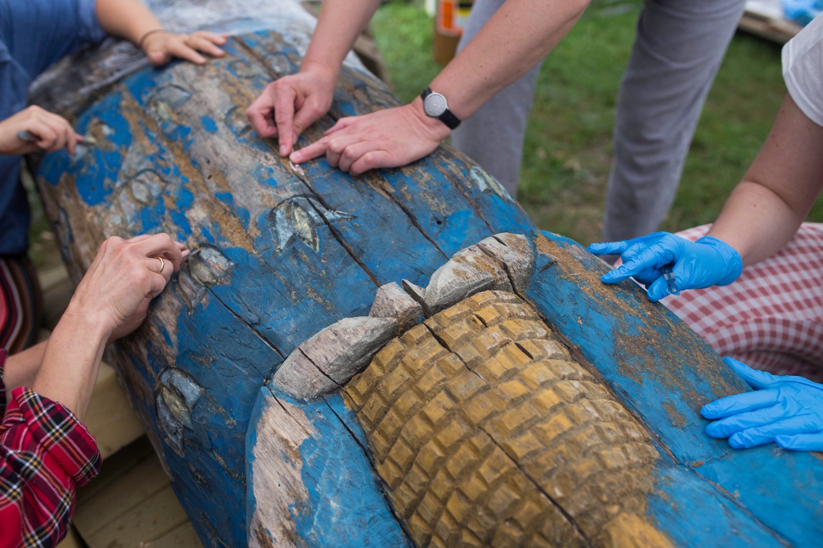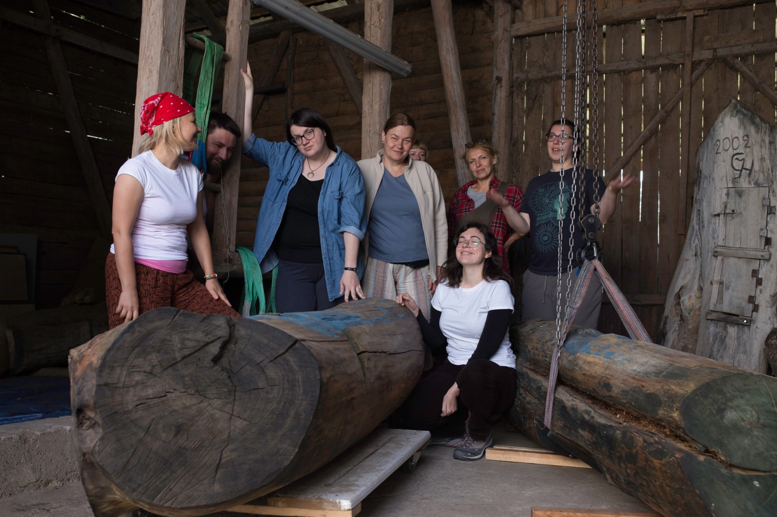 Tym razem wolontariuszki, które zgłosiły się do podjęcia prac konserwatorskich, miały za zadanie oczyścić i zabezpieczyć dwie figuralne, drewniane rzeźby - ule przedstawiające Panią z koszką i Panią ze słowikiem. Ponadto na warsztat wzięto glinianą donicę z malunkami Chełmowskiego. Konserwatorki działały pod czujnym okiem instruktorów. Pracy było sporo, a efekty można podziwiać w skansenie w Brusach - Jagliach.