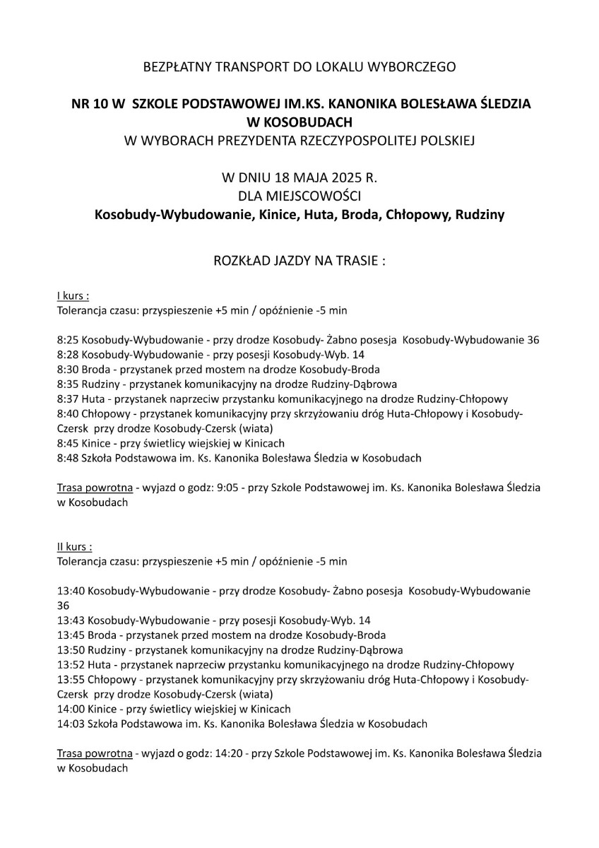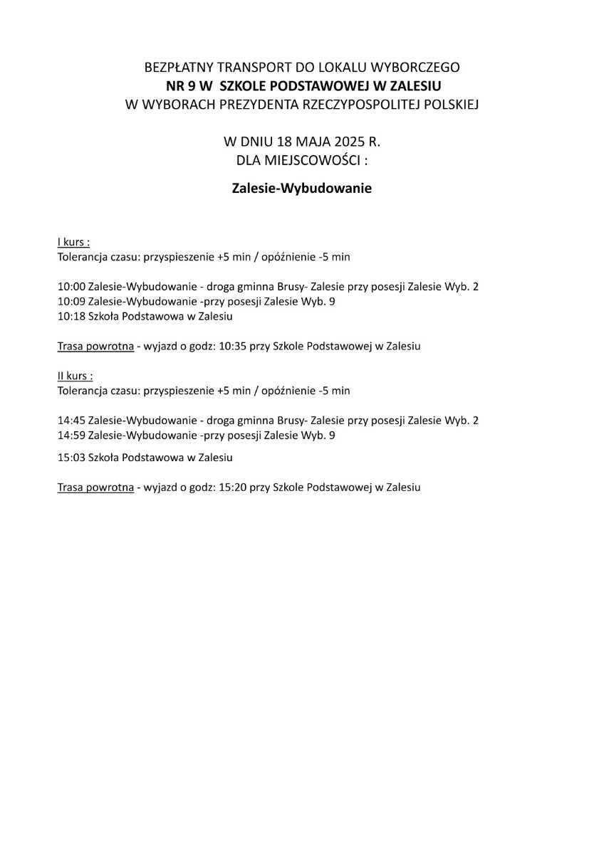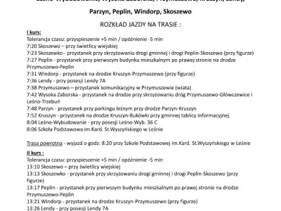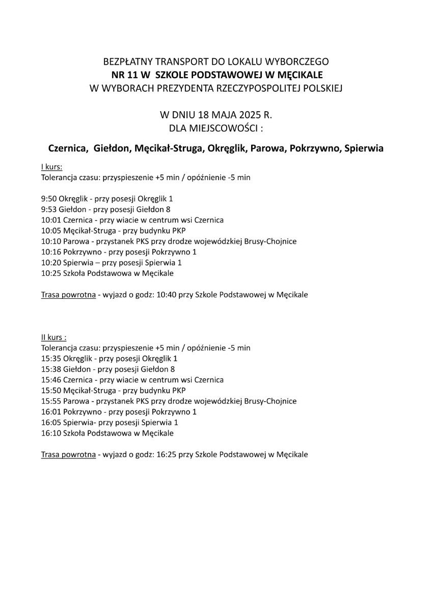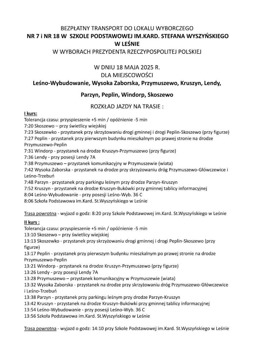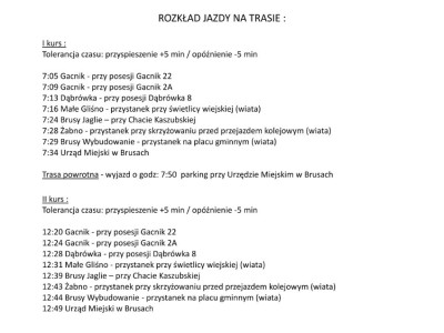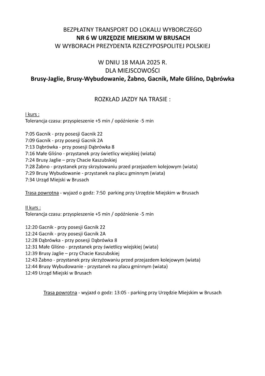 Poniżej zamieszczamy rozkłady jazdy dotyczące bezpłatnego transportu do poszczególnych lokali wyborczych na terenie gminy Brusy.