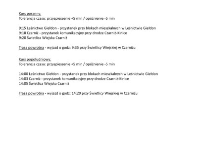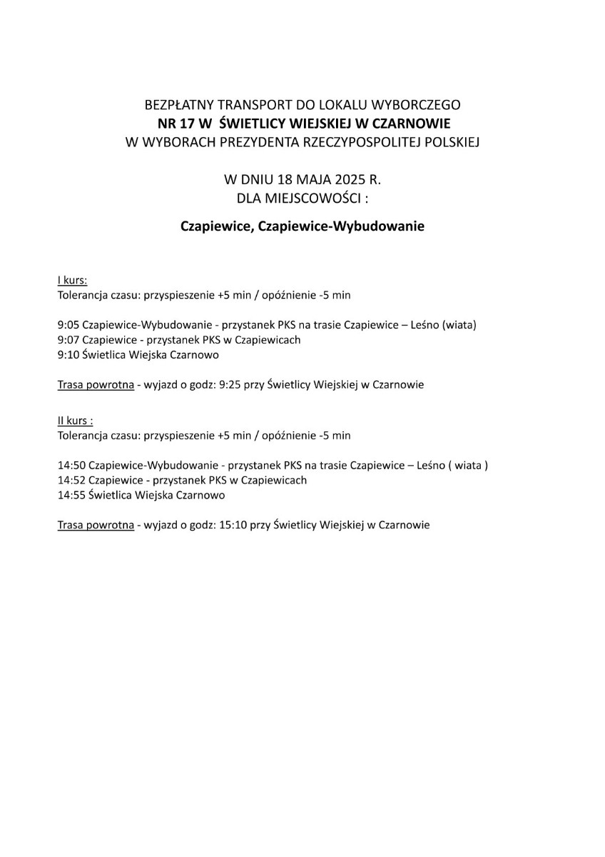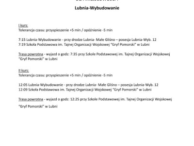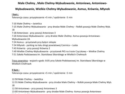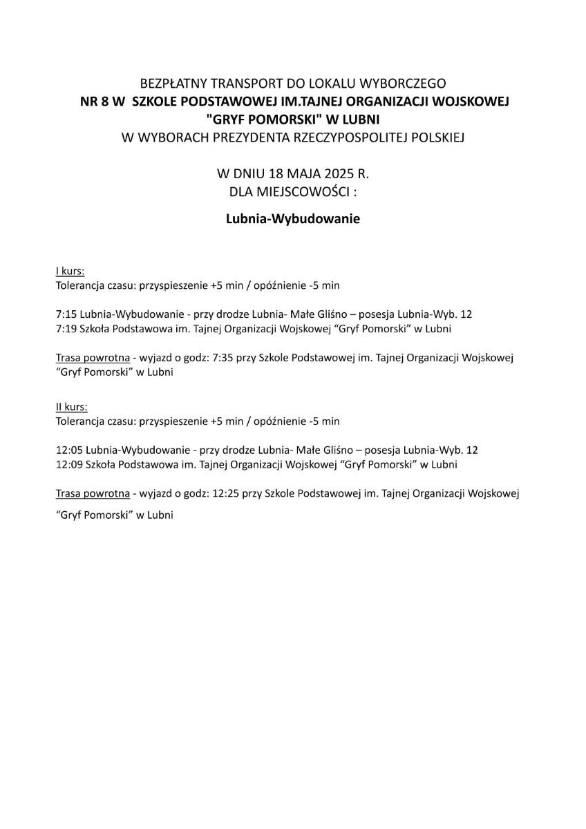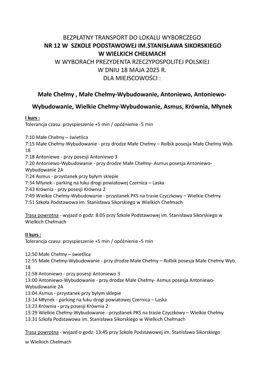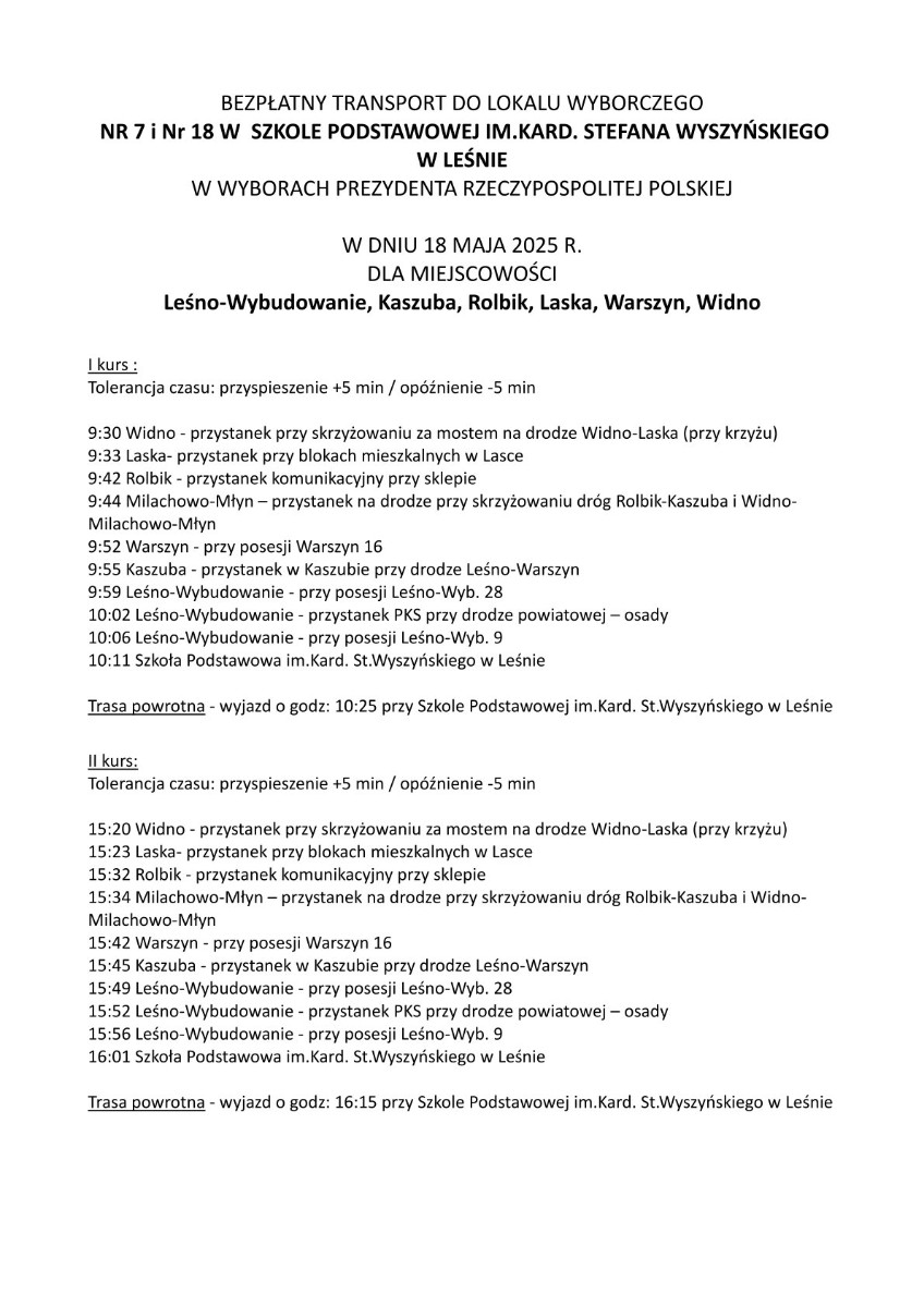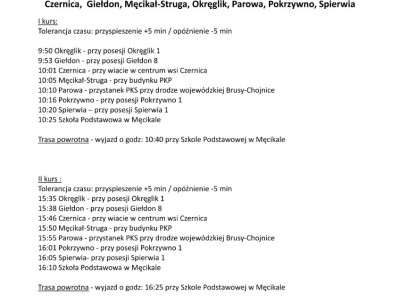 Poniżej zamieszczamy rozkłady jazdy dotyczące bezpłatnego transportu do poszczególnych lokali wyborczych na terenie gminy Brusy.