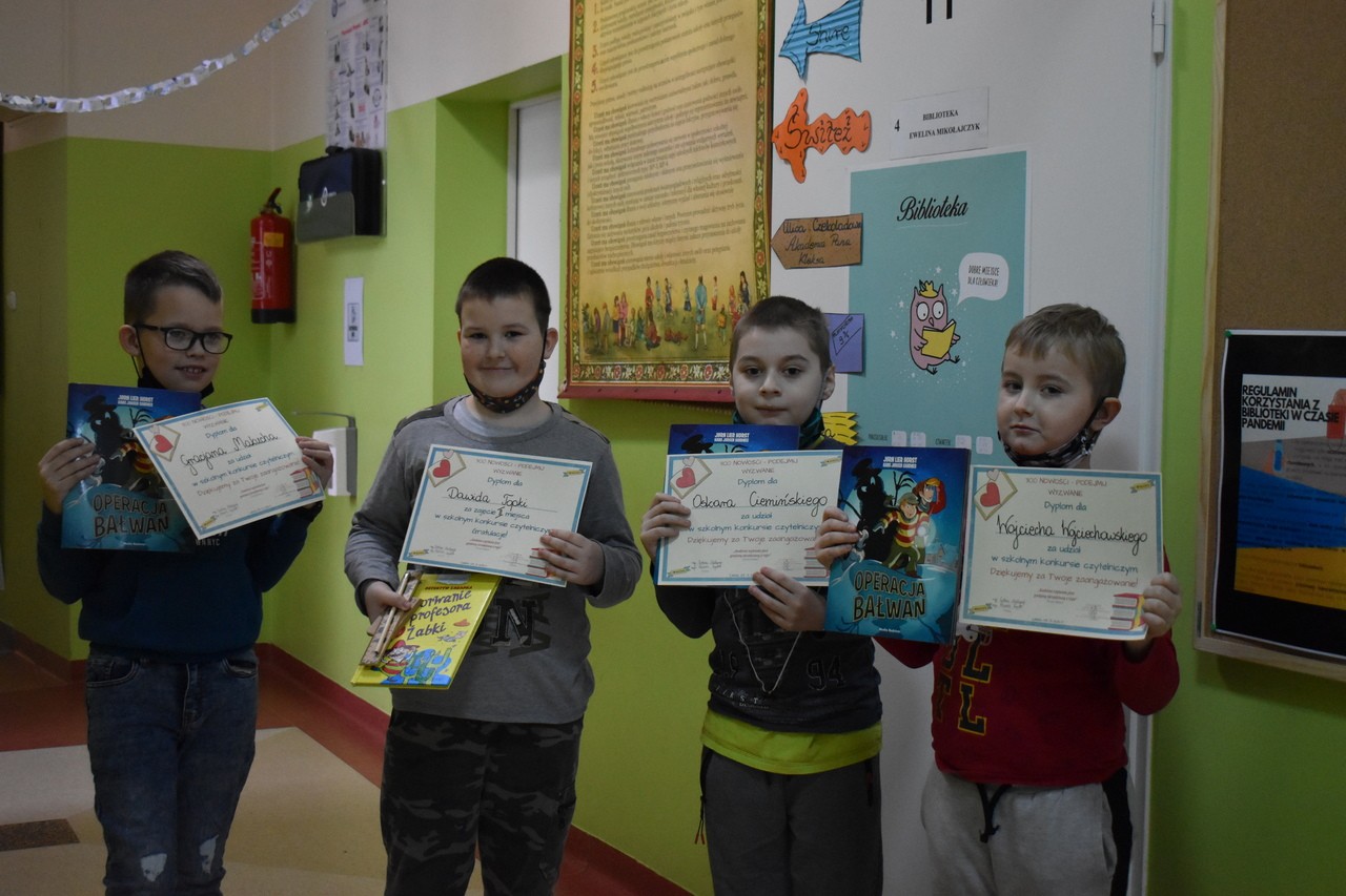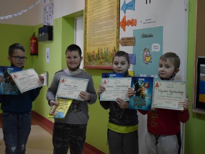 W konkursie wzięło udział łącznie 10 najmłodszych uczniów naszej szkoły, zaś pięknie prace oceniały panie: bibliotekarka Ewelina Mikołajczyk oraz pedagog Paulina Szymlek. Zaangażowanie dzieci okazało się niesamowite i wszystkie prace zasługują na uznanie. Natomiast przeczytane przez nich książki zmotywowały kolejnych uczniów do odwiedzania biblioteki. Wyniki czytelniczych zmagań prezentują się następująco: