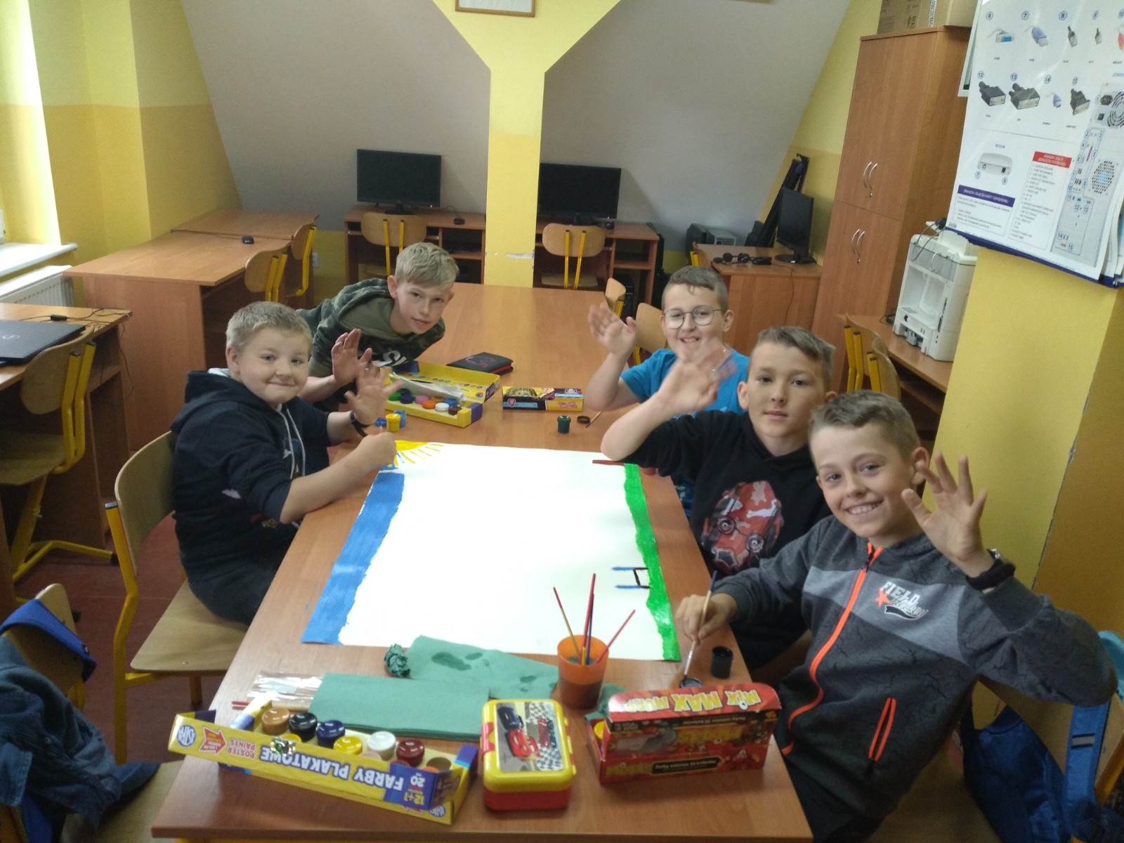 Już od rana uczniowie przybywali do szkoły z nadzieją na dobrą zabawę i wspaniałe wrażenia. Niestety pogoda początkowo nie dopisała i pierwsze zajęcia musiały odbyć się pod dachem. Na wstępie uczniowie podzieleni na grupy wzięli udział w konkursie plastycznym, którego celem było zaprojektowanie i wykonanie plakatu – starsi o tematyce profilaktycznej związanej z używkami, natomiast młodsze dzieci – na temat sportowego stylu życia.