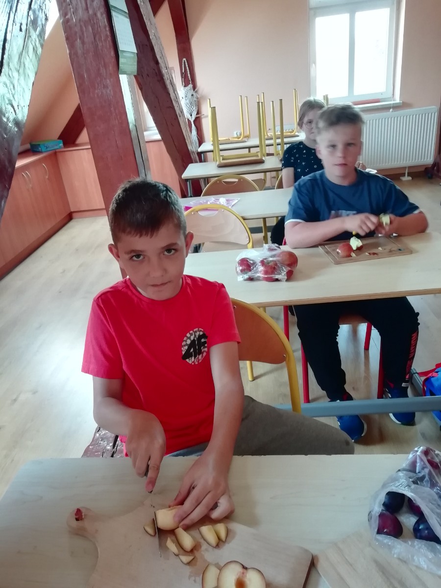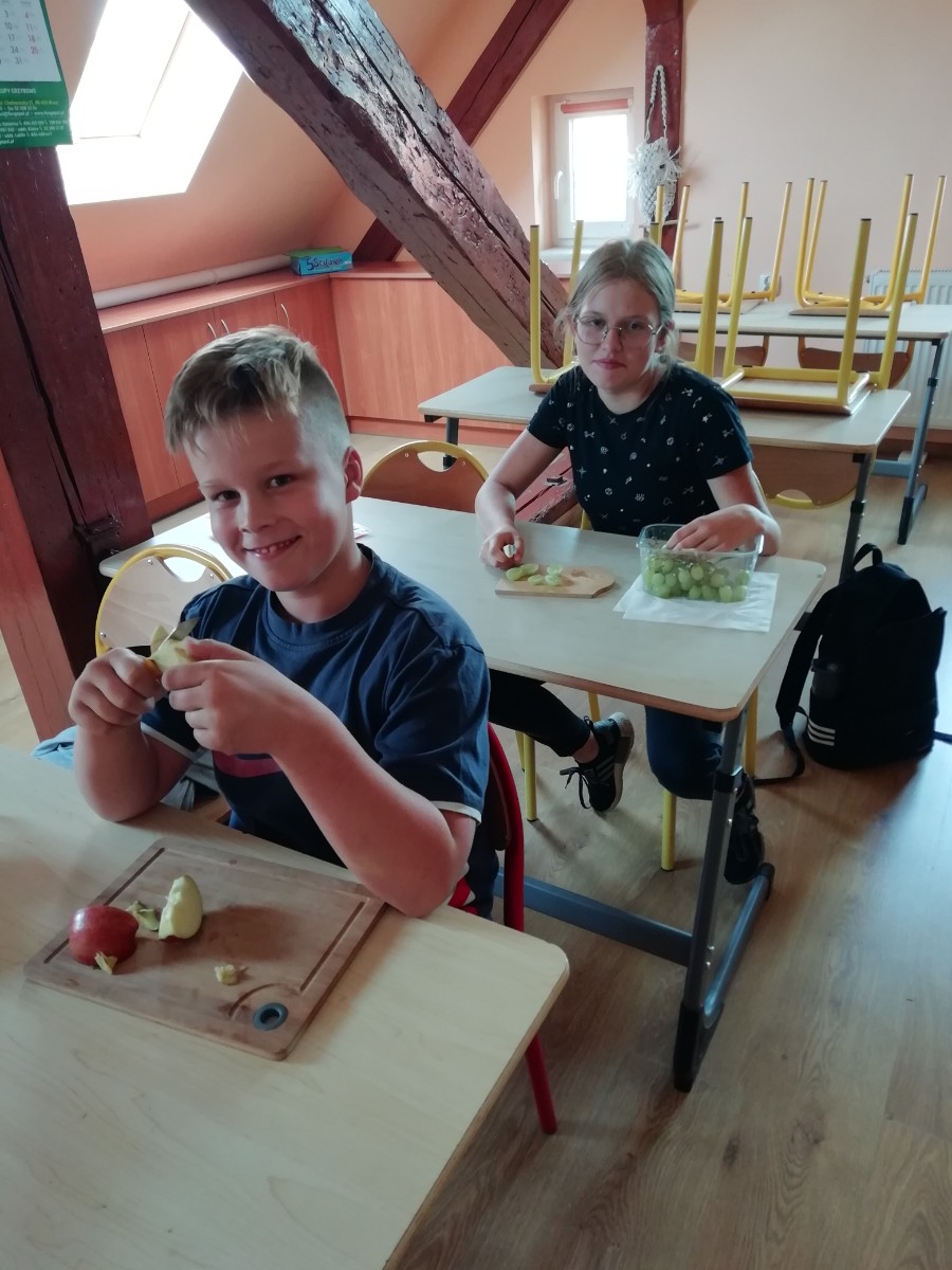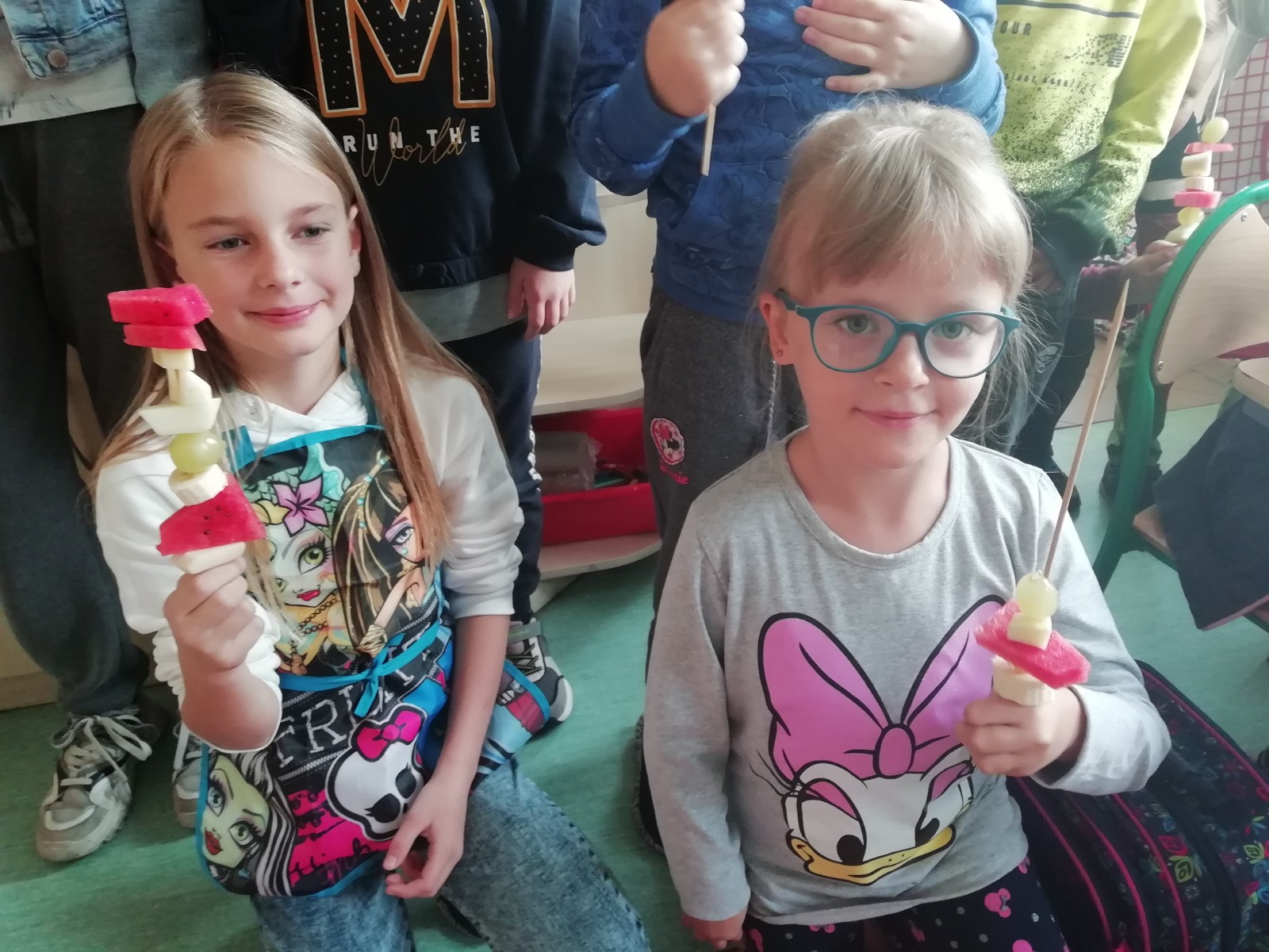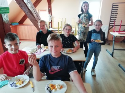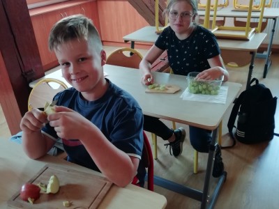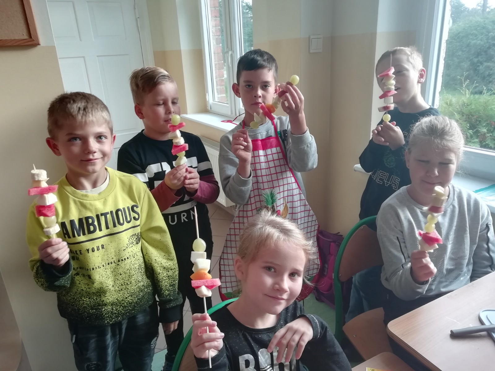 Brzôd i ògardowizna – te tajemniczo brzmiące słowa, to po prostu w języku kaszubskim owoce oraz warzywa i właśnie takim tematem zajmowaliśmy się na kilku lekcjach języka kaszubskiego. Najpierw uczniowie poznali nazwy różnych owoców i warzyw, żeby później zrobić z nich smakołyki. Dzieci z grupy młodszej robiły szaszłyki owocowe zaś z grupa starsza zrobiła sałatkę owocową oraz pyszne, pachnące rogaliki marchewkowe, na które przepis był oczywiście w języku kaszubskim.