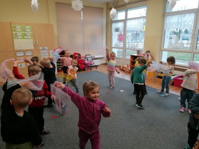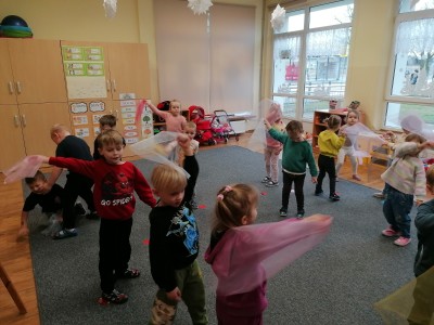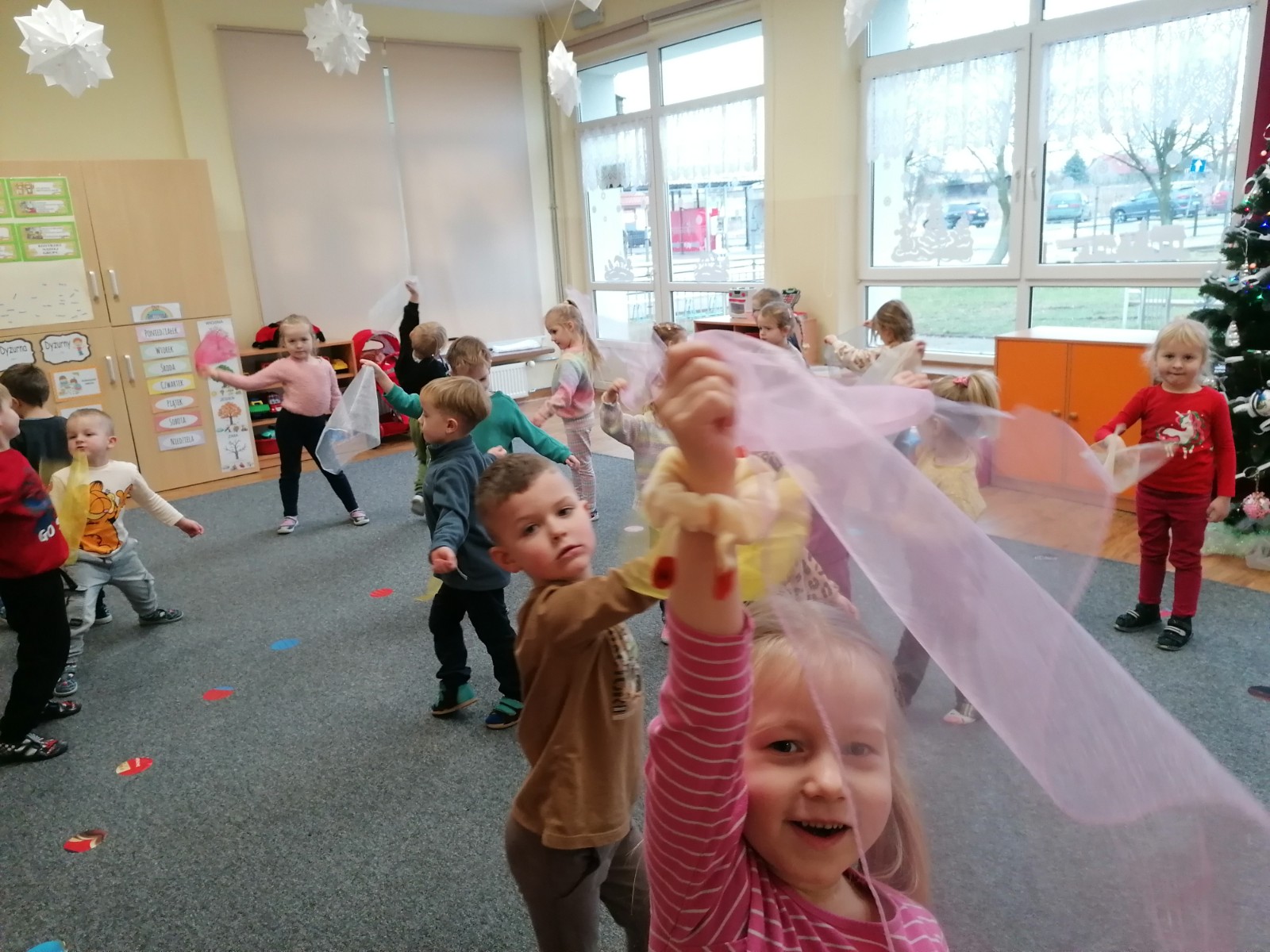Zajęcia ruchowe mogą być ciekawe i inspirujące, a szczególnie wtedy gdy połączymy je z muzyką. Na zajęciach w ramach programu "Gmina Brusy stawia na przedszkolaka", Biedronki tańczyły z chustami do muzyki poważnej, wyrażając siebie i prezentując swoją ekspresję.
