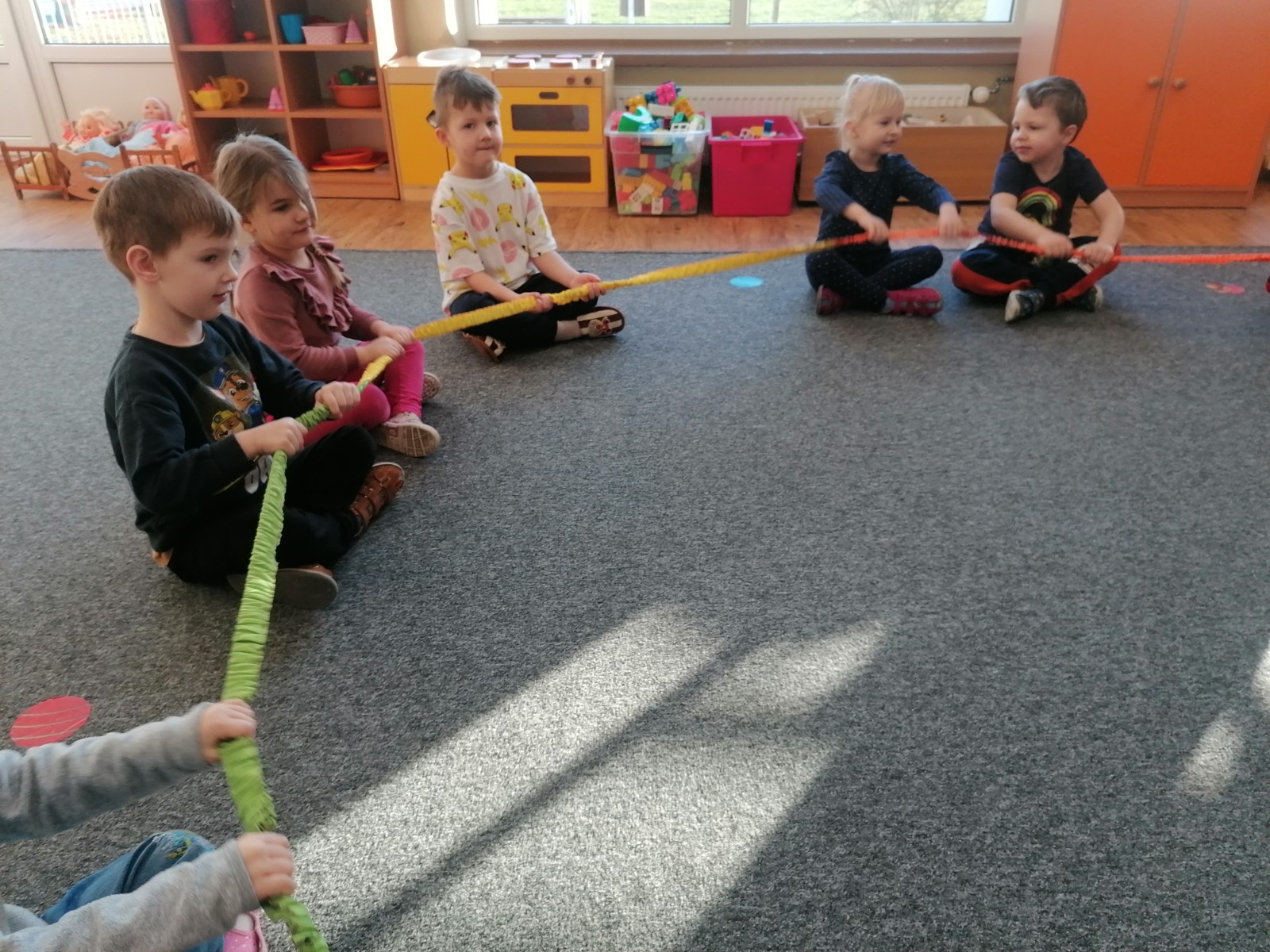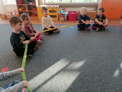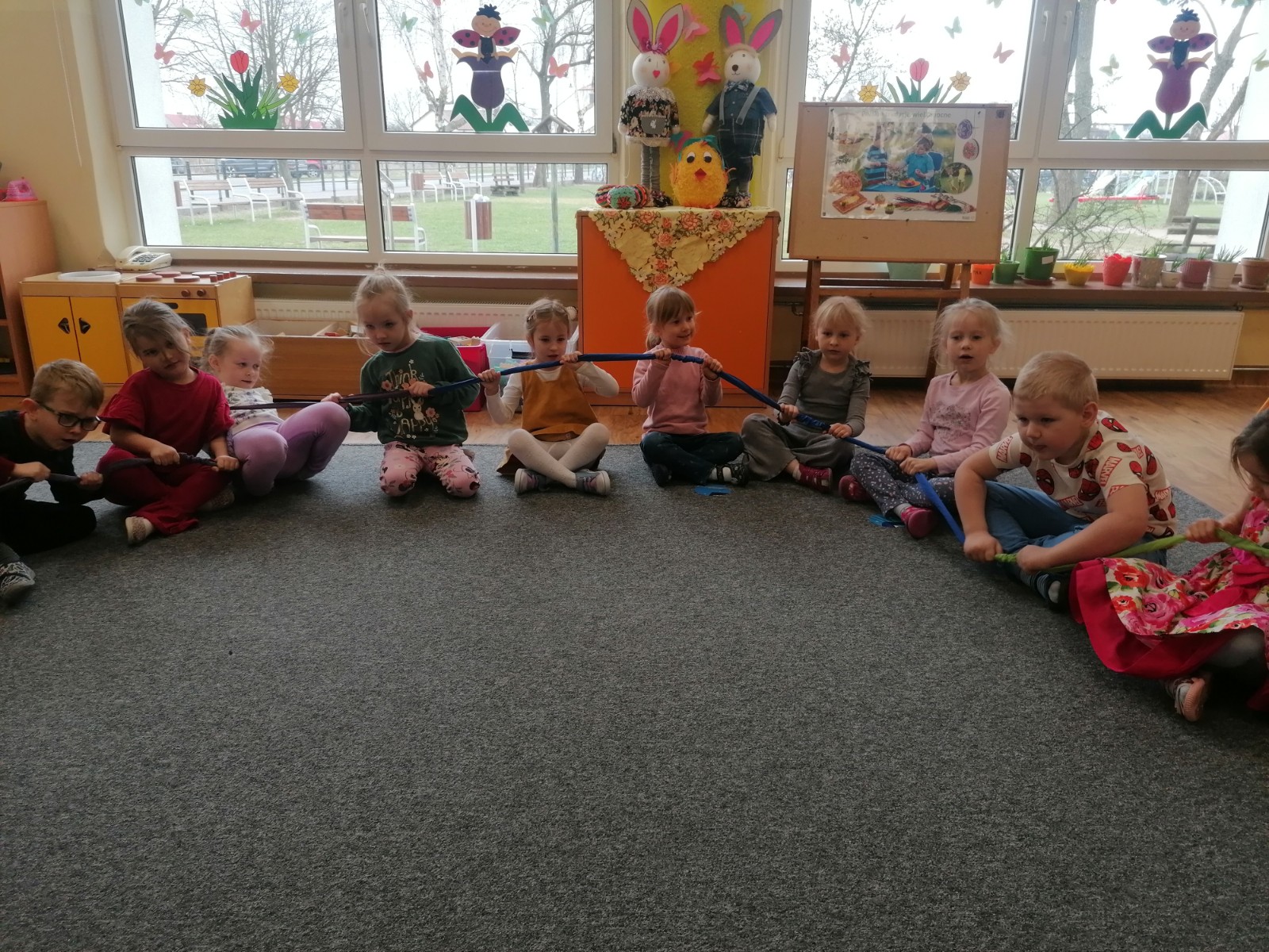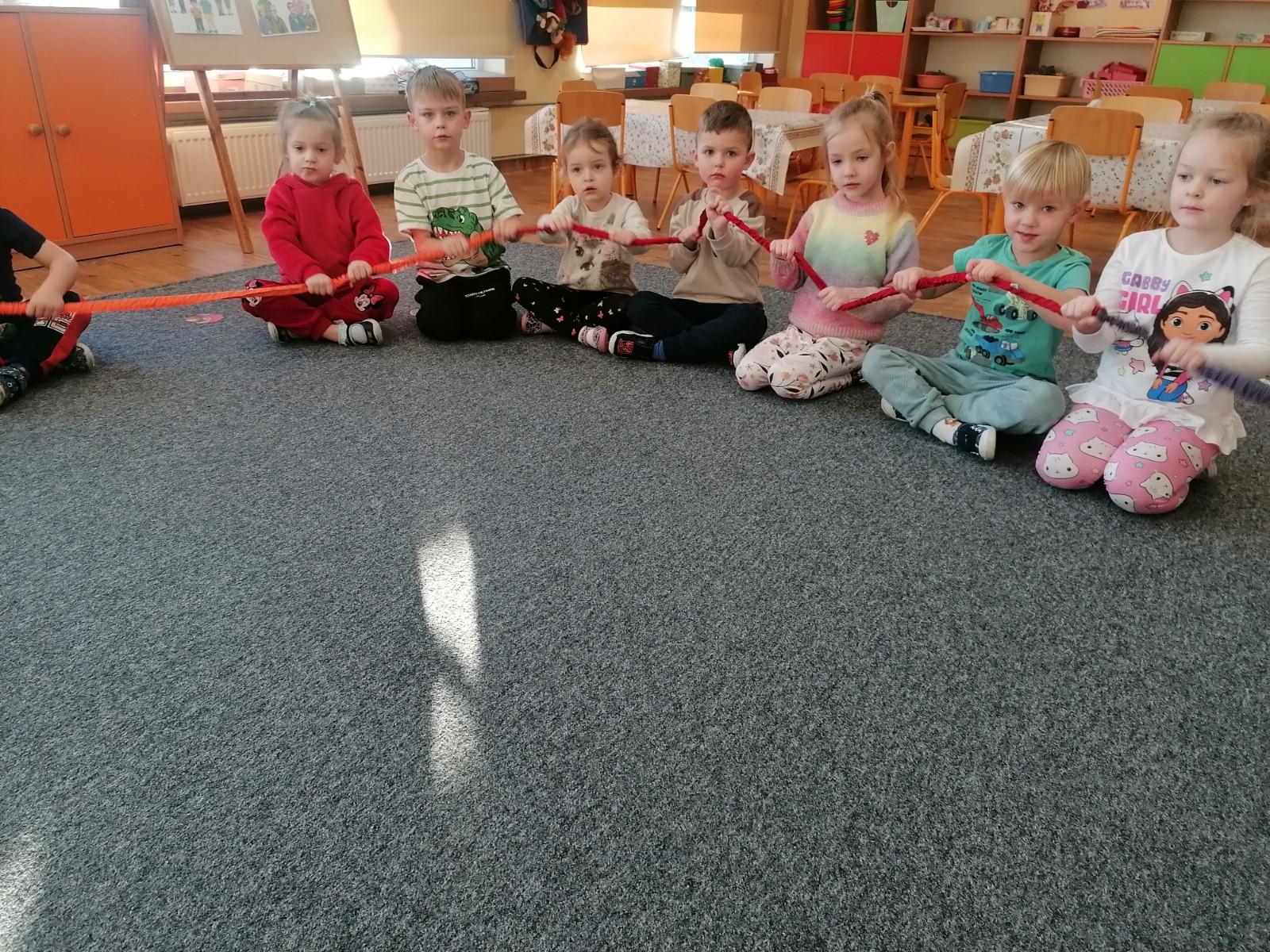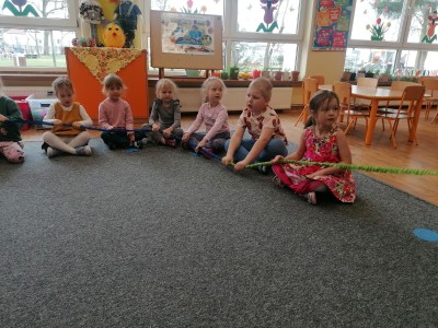 Zabawy ruchowe z wykorzystaniem gumy sensorycznej w ramach zajęć "Gmina Brusy stawia na przedszkolaków" , to dla dzieci miła forma zabaw przy muzyce. Dodatkowo zabawa uczy szybkiej reakcji na zmianę muzyki i reagowania na prezentowanie zalecanych aktywności.