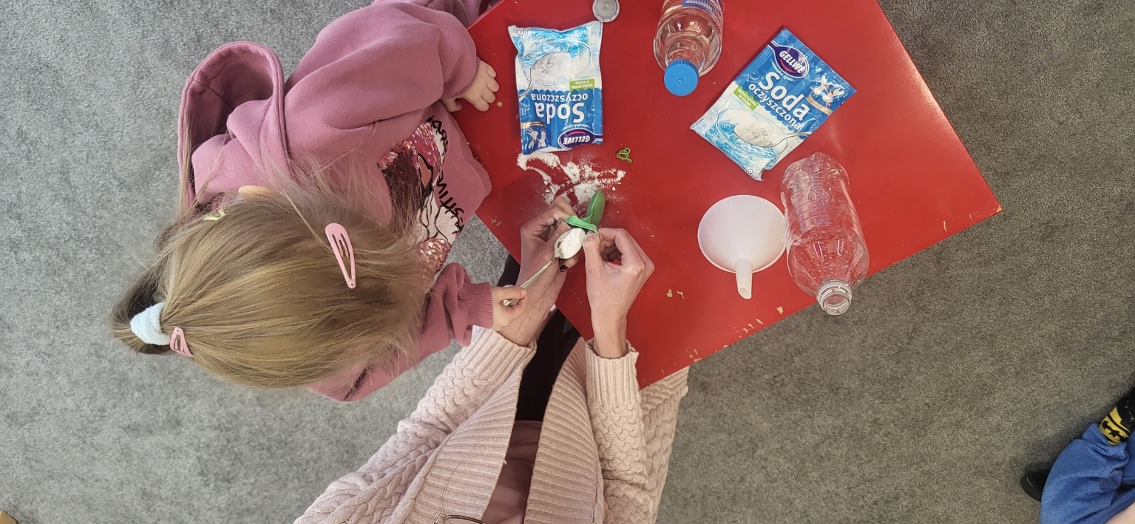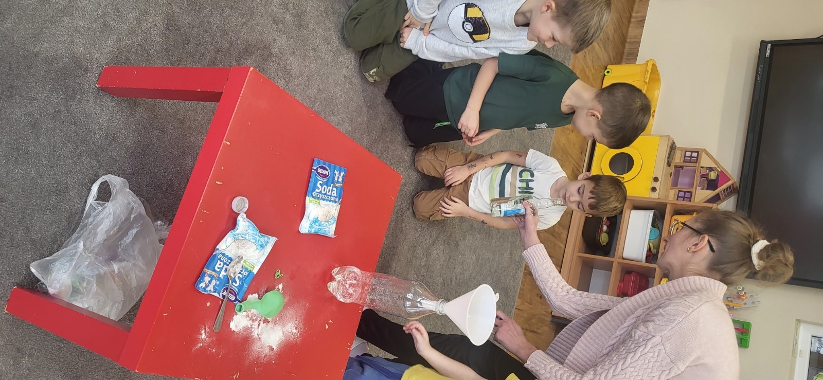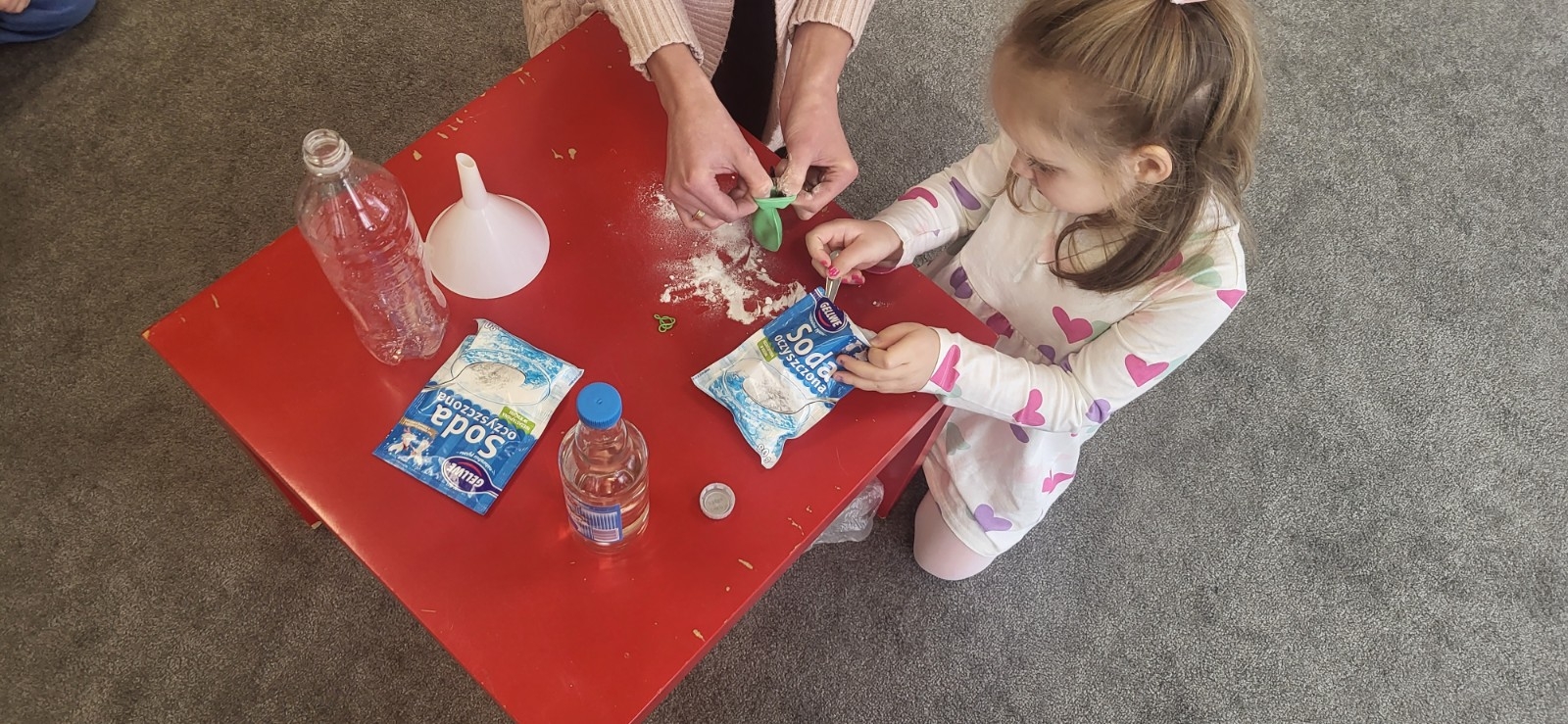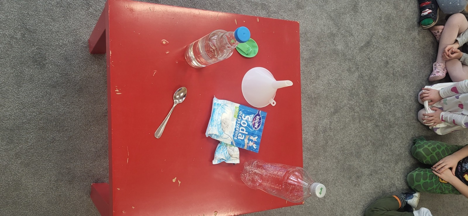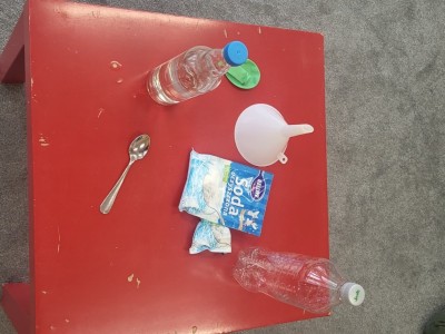 Do eksperymentu potrzebowaliśmy: octu, sody oczyszczonej, balonu, pustej butelki, lejka i małej łyżeczki do napełnienia bolonika.