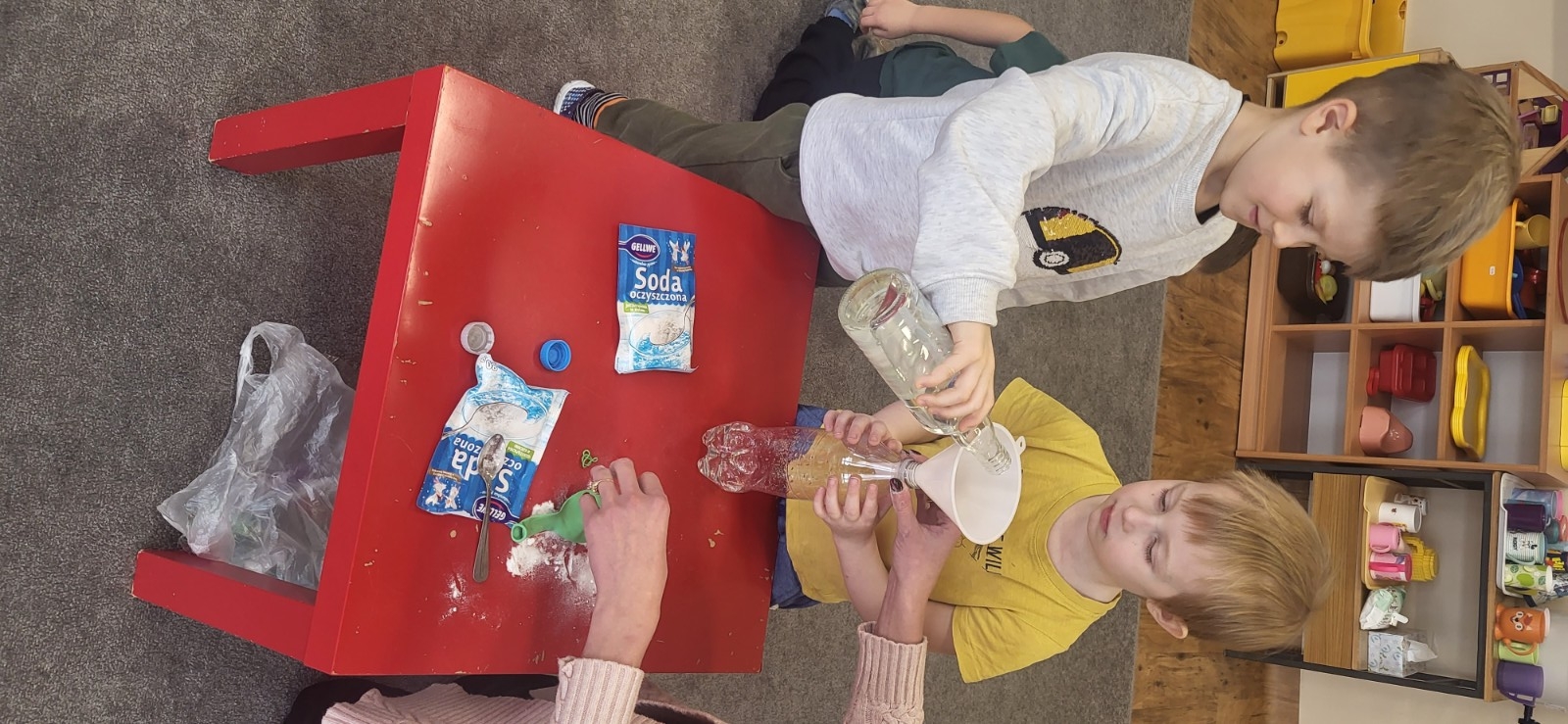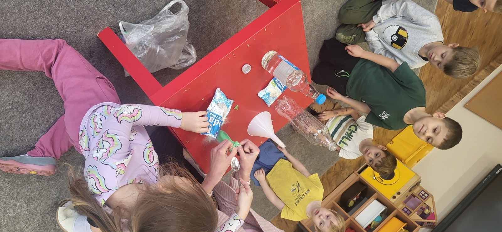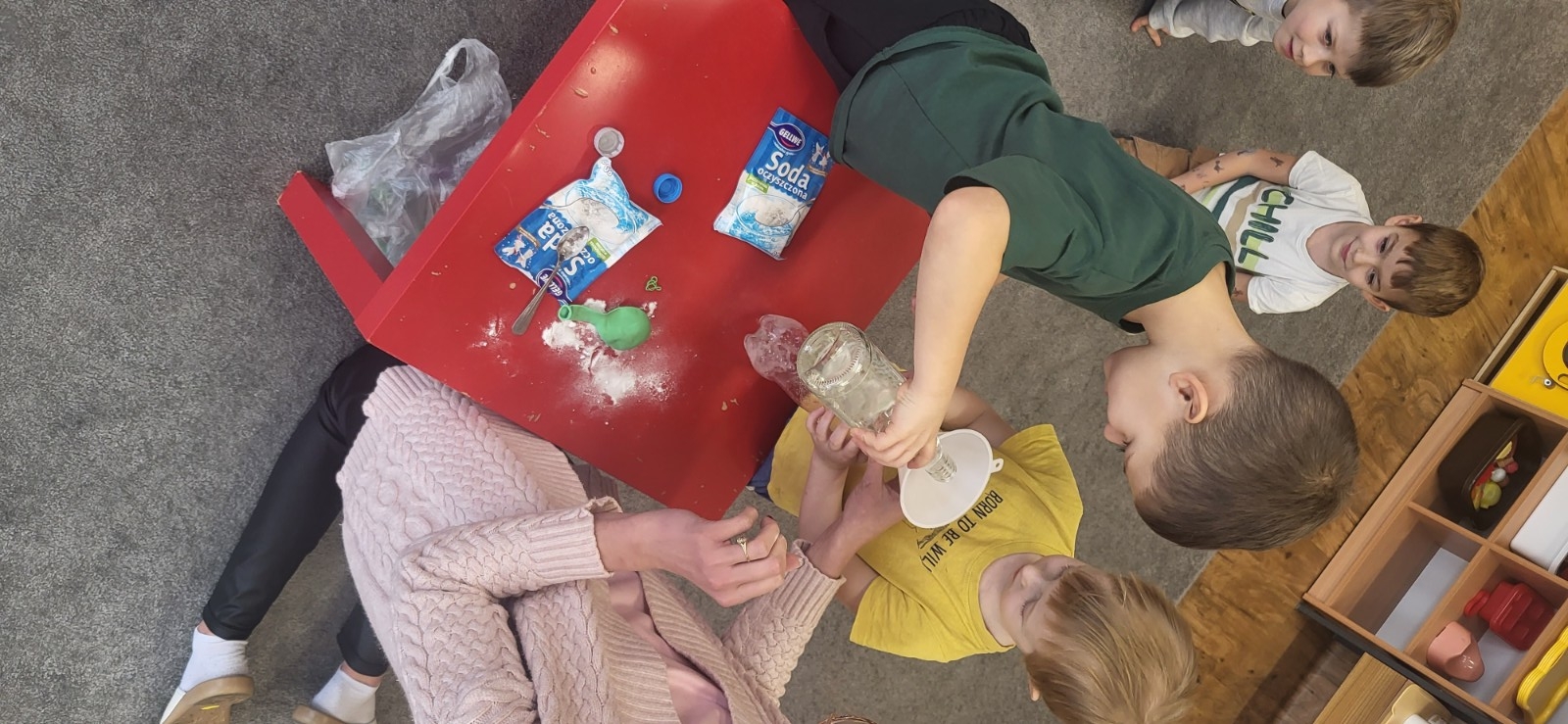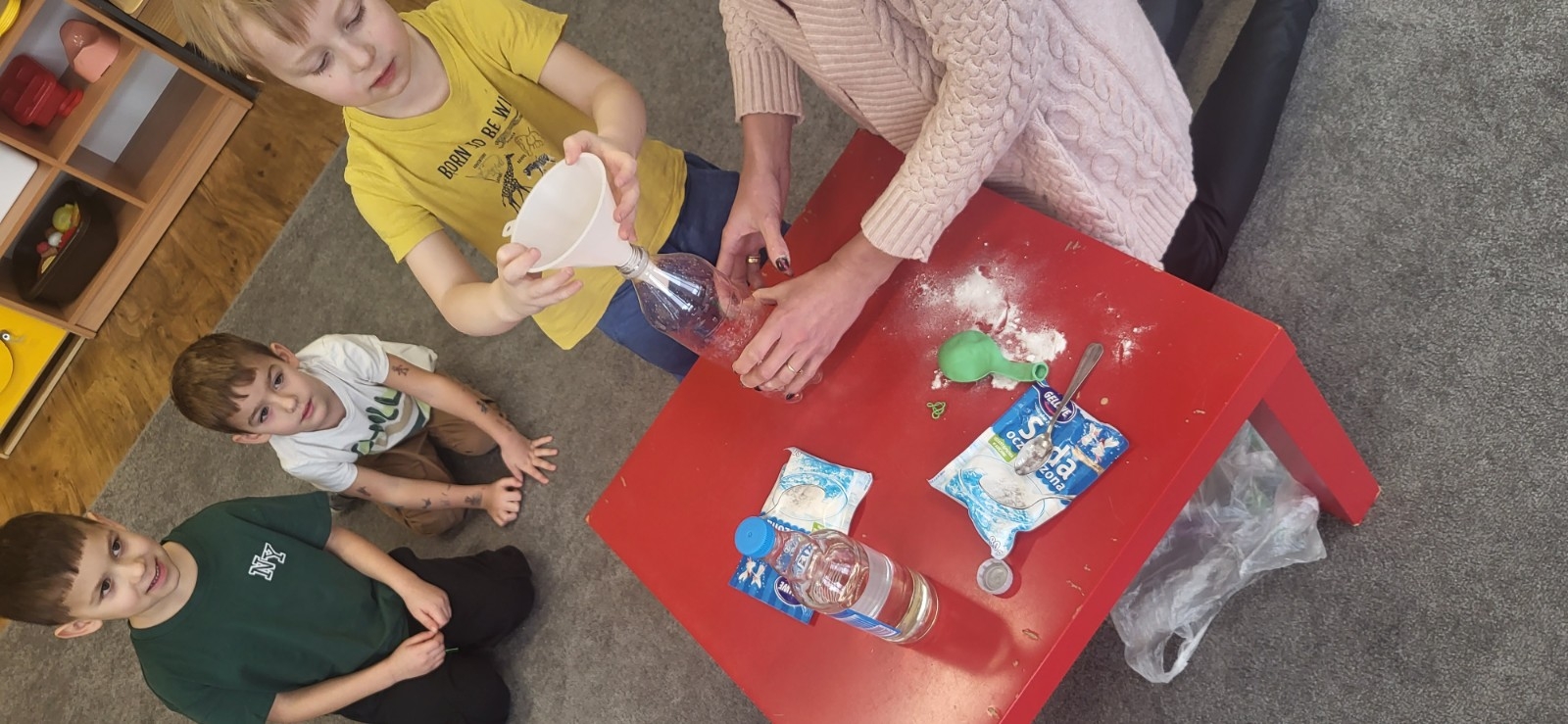 Wykonywanie eksperymentów podczas zajęć sprzyja pracy zespołowej. Przedszkolaki uczą się w ten sposób współpracy, słuchania poleceń nauczyciela, ale przede wszystkim świetnie się przy tym bawią.