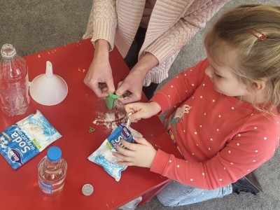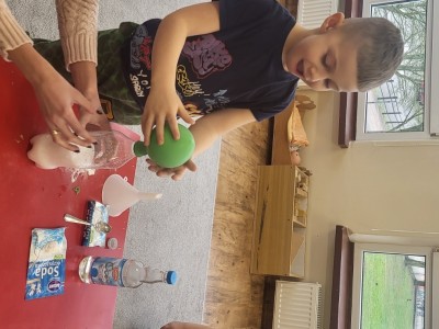 Żabki z podekscytowaniem wykonywały kolejne etapy doświadczenia. Z zachwytem obserwowały, unoszący się pod wpływem wypełnienia gazem (CO2), balon.