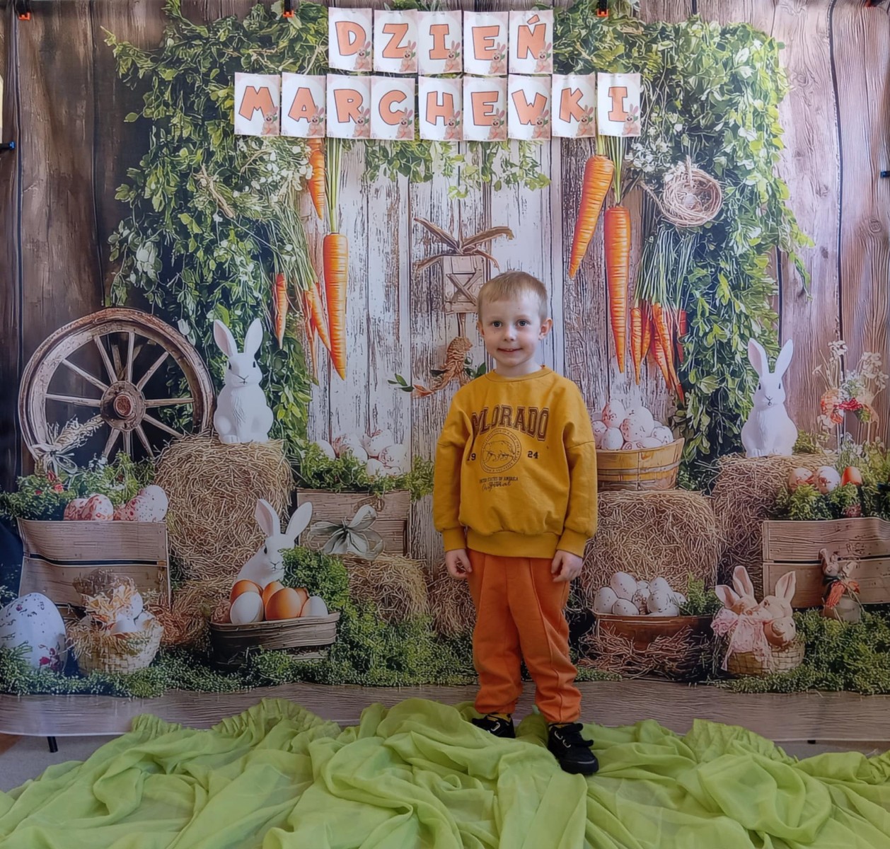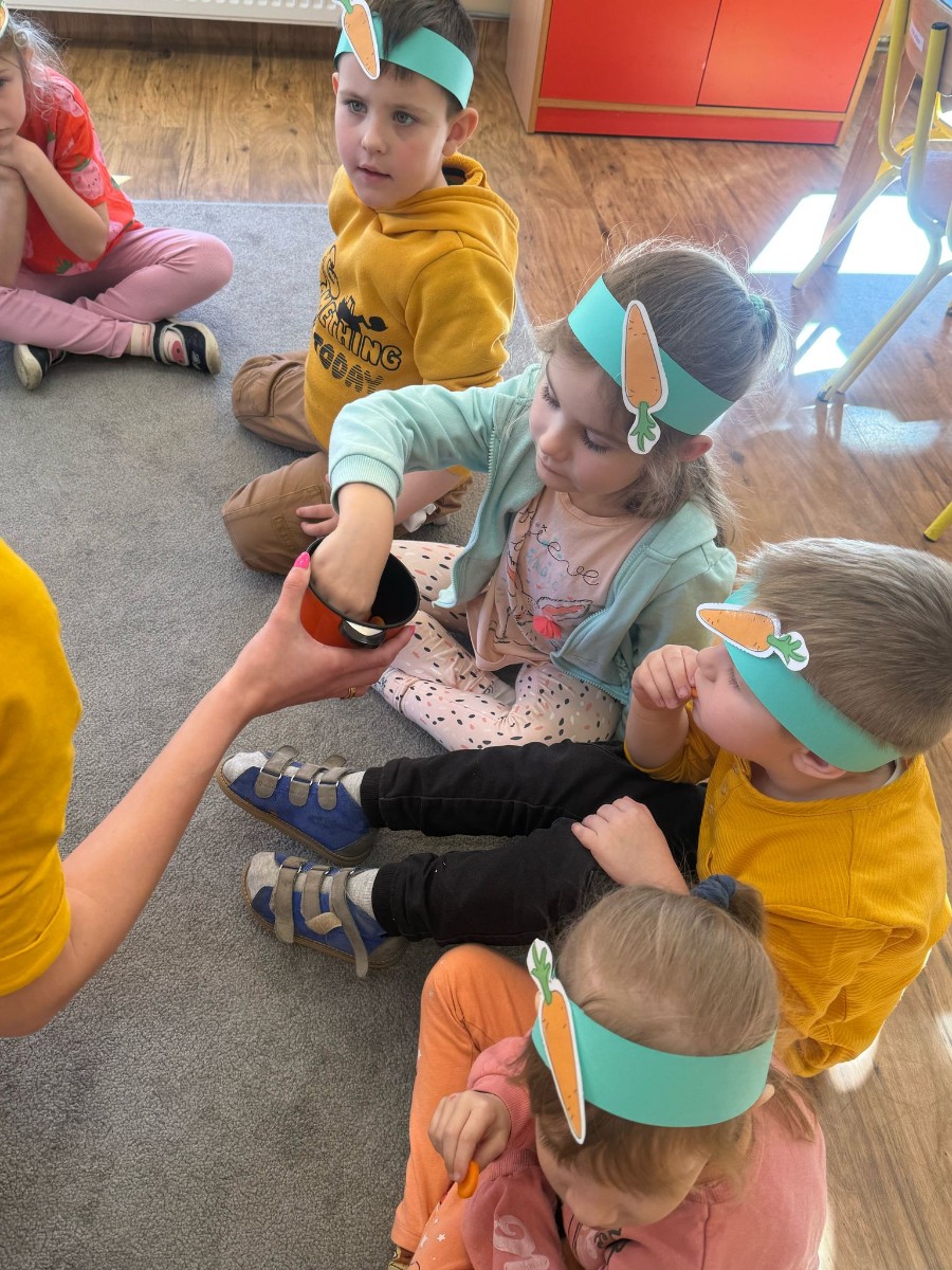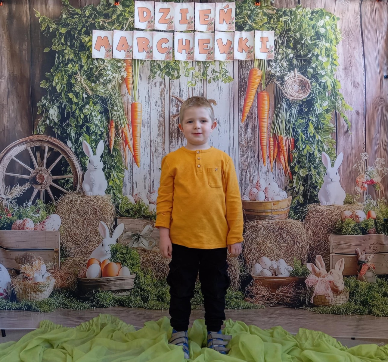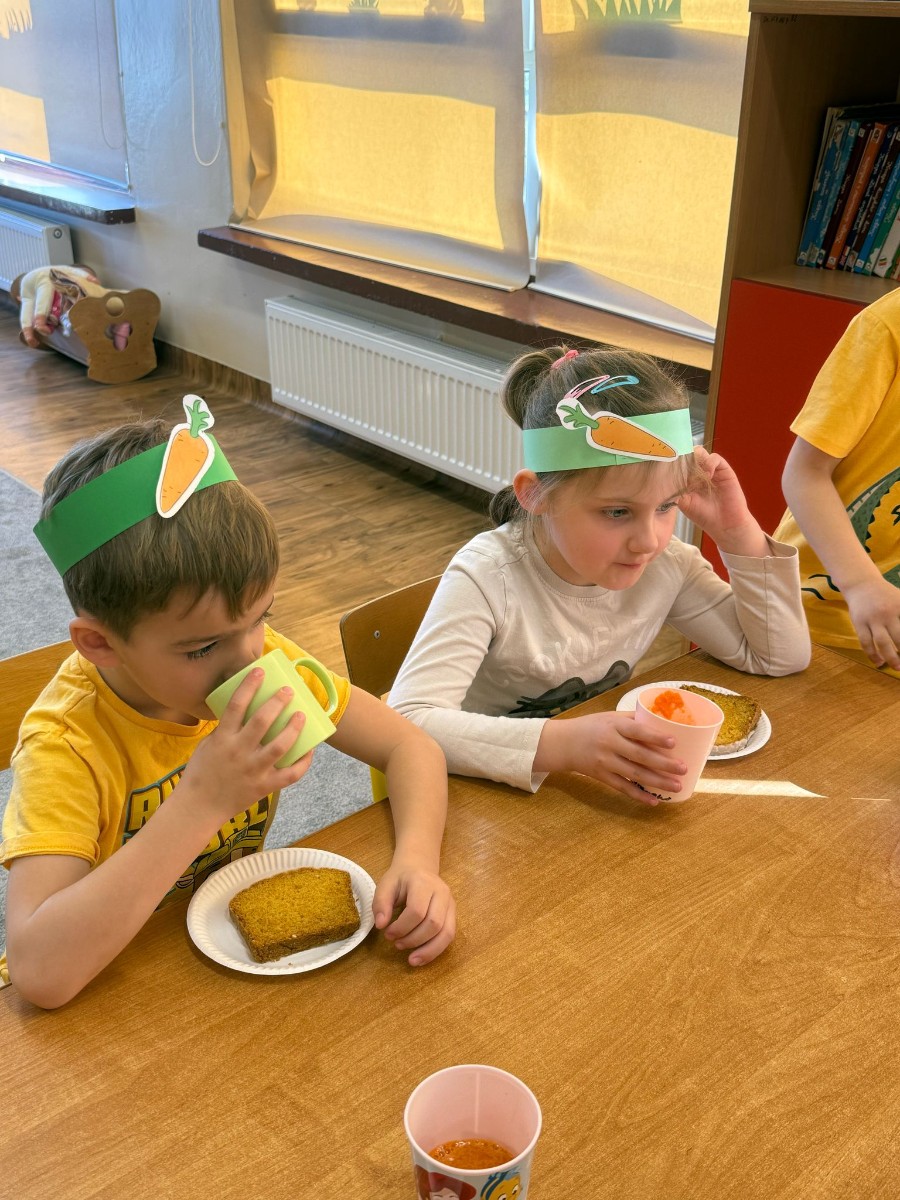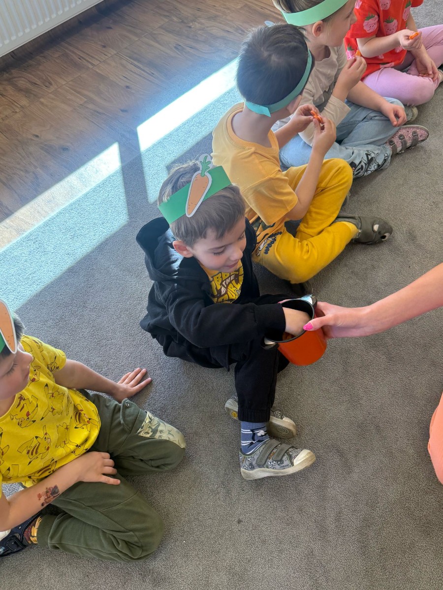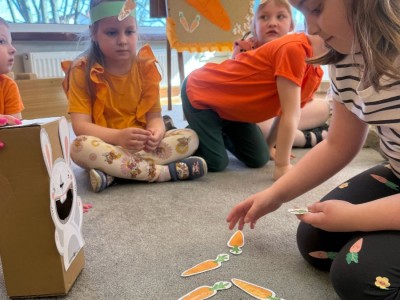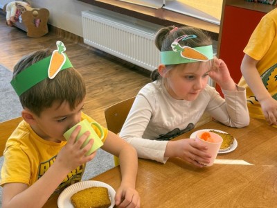 Międzynarodowy Dzień Marchewki obchodzony jest każdego roku 4 kwietnia. Celem Dnia Marchewki jest rozpowszechnianie wiedzy o tych warzywach i o zdrowym stylu życia. Tego dnia również dzieci z naszego przedszkola celebrowały to Święto. Nie zabrakło licznych gier i zabaw o tematyce marchewkowej, ale też strojów w kolorze pomarańczowym. Żabki chętnie słuchały informacji dotyczących pochodzenia święta, "karmiły królika Benia", przeliczały marchewki, smakowały surowego warzywa, wykonywały sok marchewkowo-jabłkowy, by na koniec delektować się nim, zajadając marchewkowe ciasto.