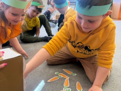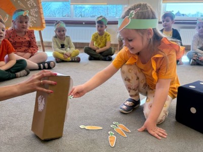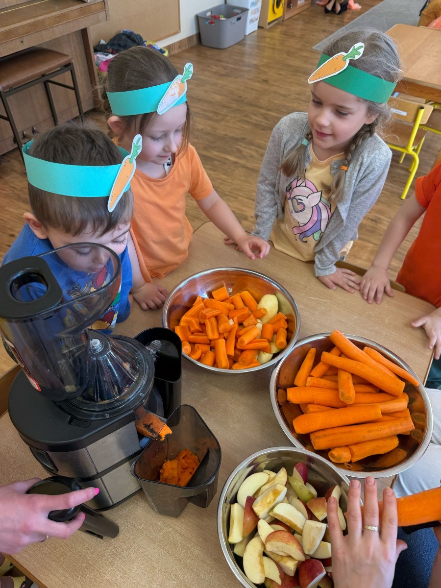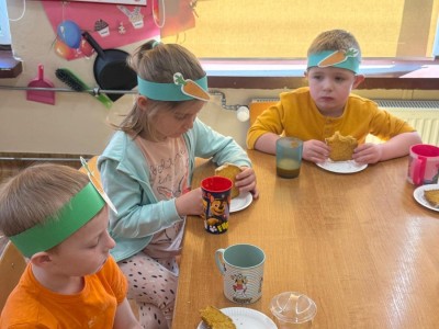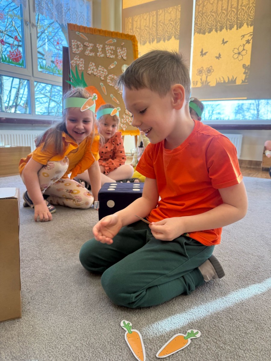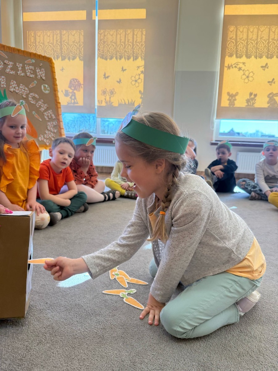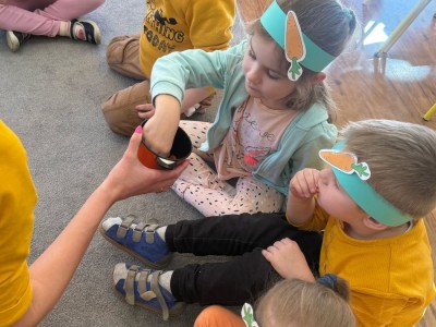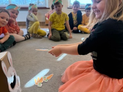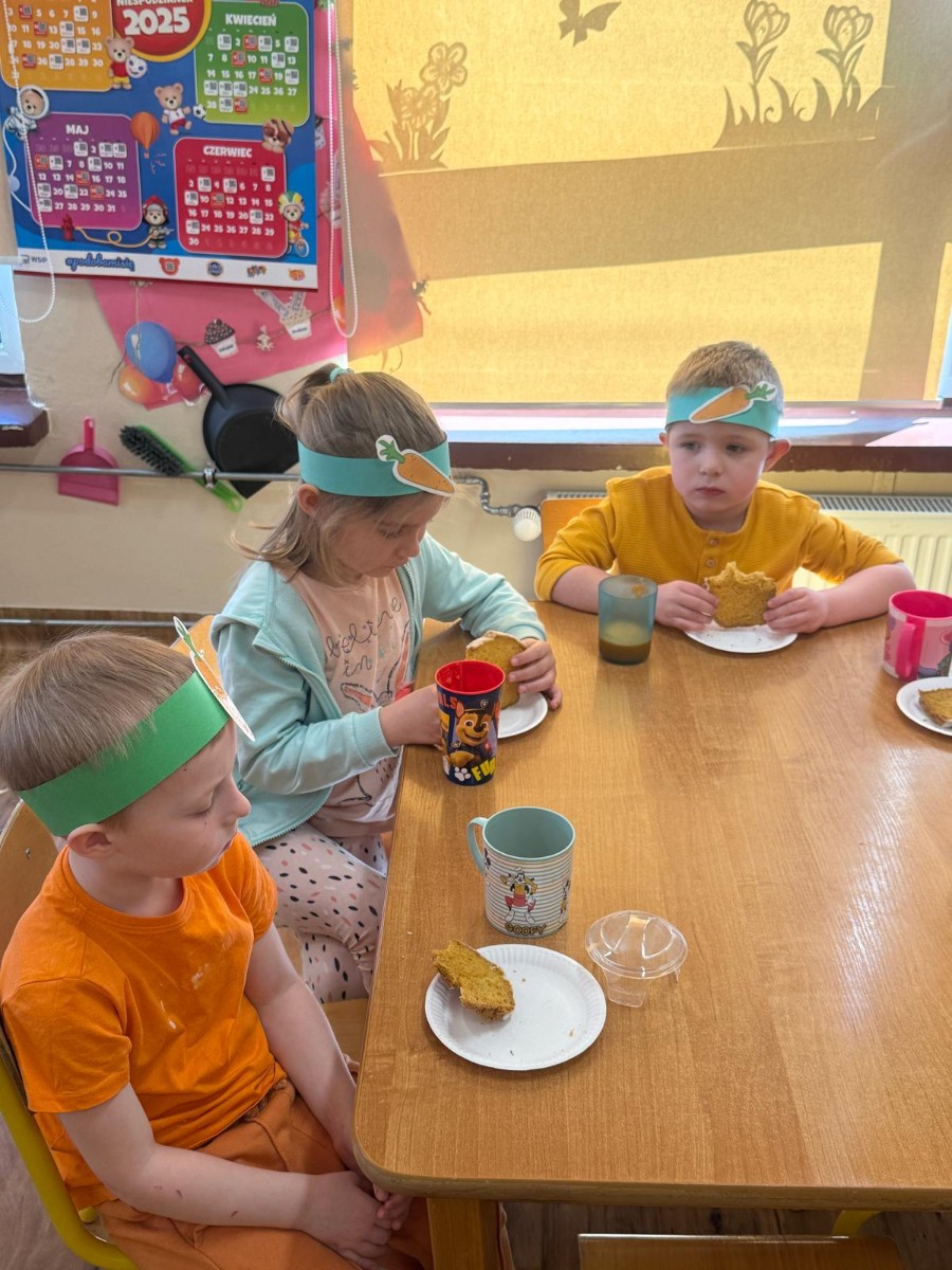 Międzynarodowy Dzień Marchewki obchodzony jest każdego roku 4 kwietnia. Celem Dnia Marchewki jest rozpowszechnianie wiedzy o tych warzywach i o zdrowym stylu życia. Tego dnia również dzieci z naszego przedszkola celebrowały to Święto. Nie zabrakło licznych gier i zabaw o tematyce marchewkowej, ale też strojów w kolorze pomarańczowym. Żabki chętnie słuchały informacji dotyczących pochodzenia święta, "karmiły królika Benia", przeliczały marchewki, smakowały surowego warzywa, wykonywały sok marchewkowo-jabłkowy, by na koniec delektować się nim, zajadając marchewkowe ciasto.