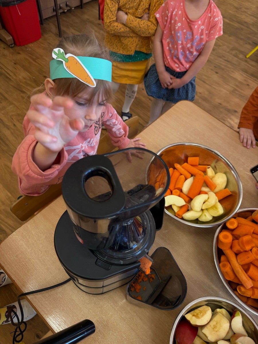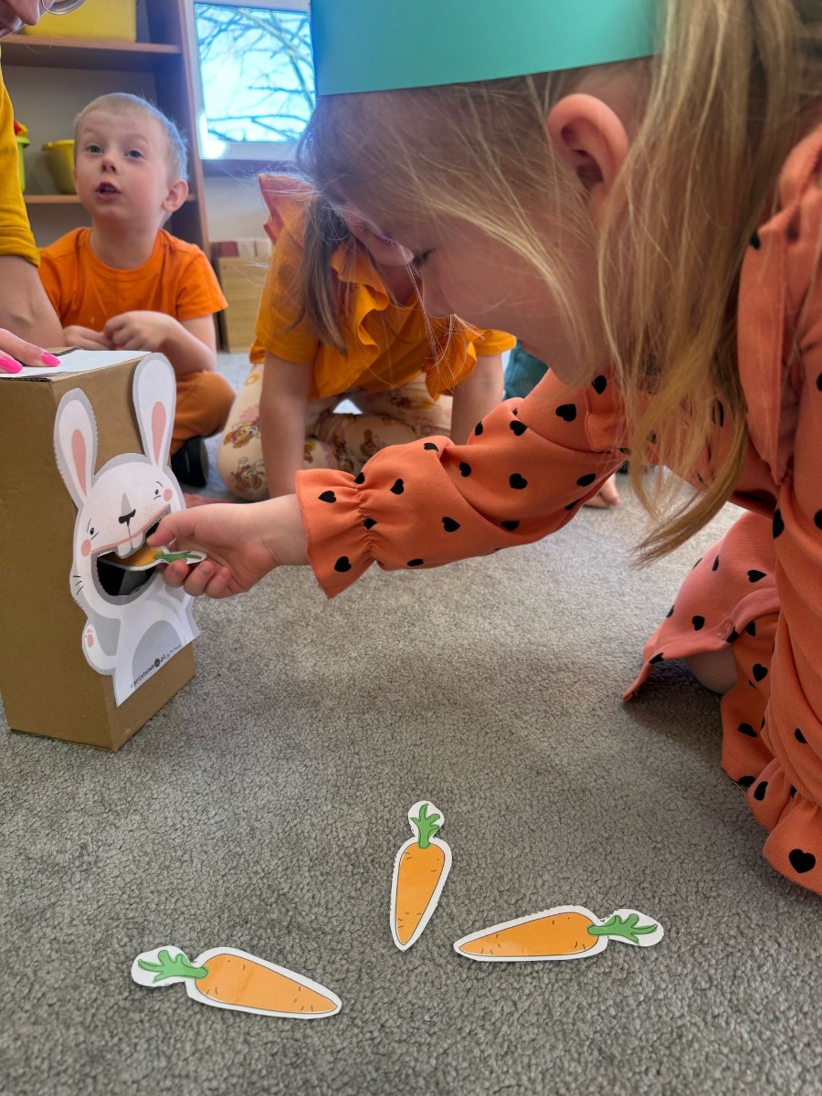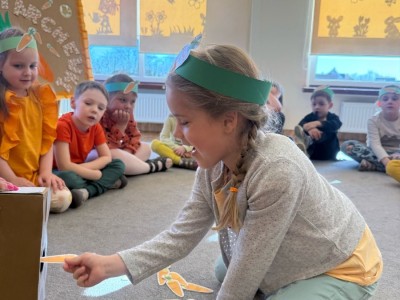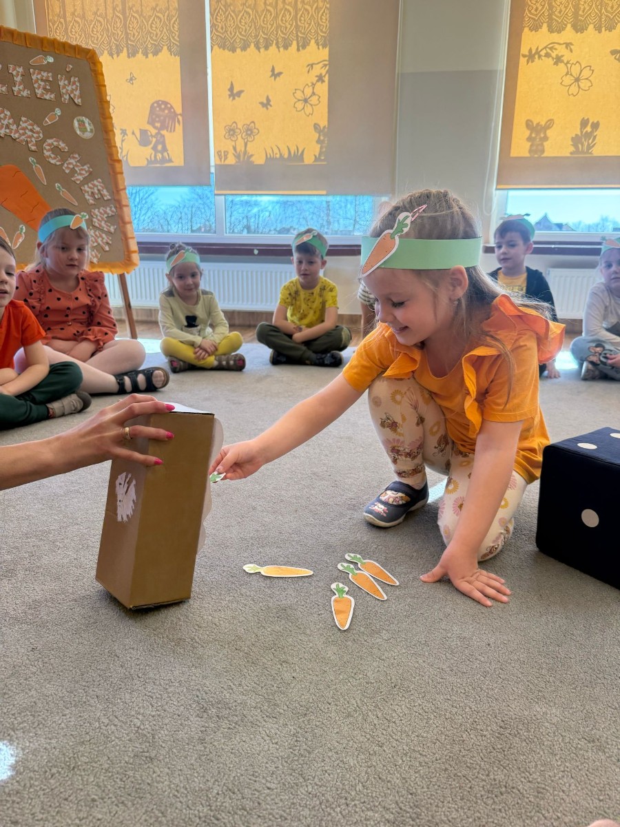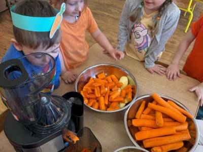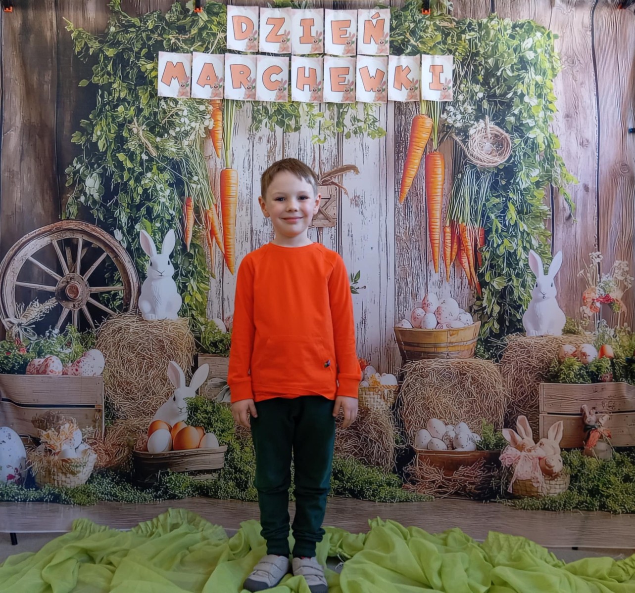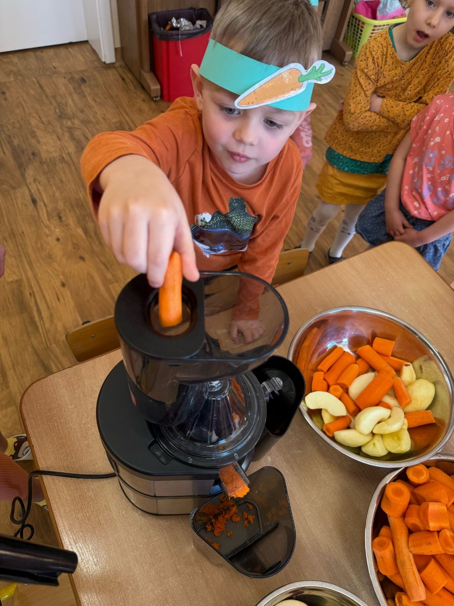 Międzynarodowy Dzień Marchewki obchodzony jest każdego roku 4 kwietnia. Celem Dnia Marchewki jest rozpowszechnianie wiedzy o tych warzywach i o zdrowym stylu życia. Tego dnia również dzieci z naszego przedszkola celebrowały to Święto. Nie zabrakło licznych gier i zabaw o tematyce marchewkowej, ale też strojów w kolorze pomarańczowym. Żabki chętnie słuchały informacji dotyczących pochodzenia święta, "karmiły królika Benia", przeliczały marchewki, smakowały surowego warzywa, wykonywały sok marchewkowo-jabłkowy, by na koniec delektować się nim, zajadając marchewkowe ciasto.
