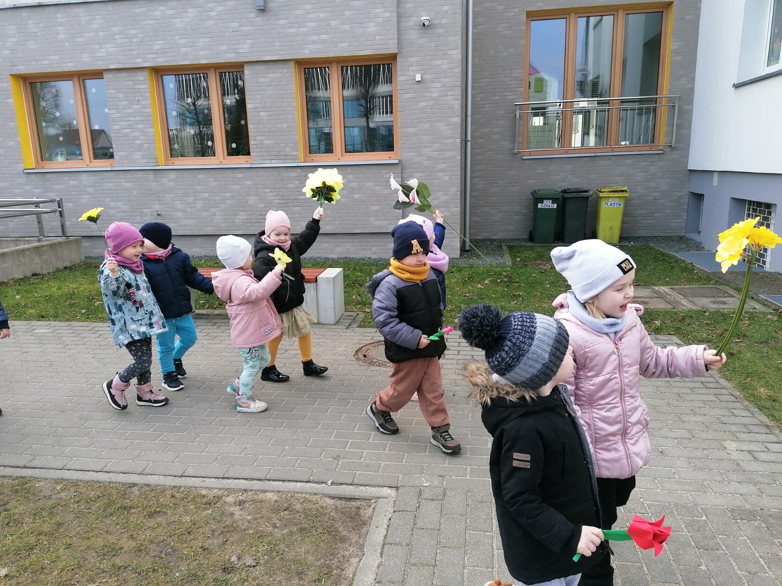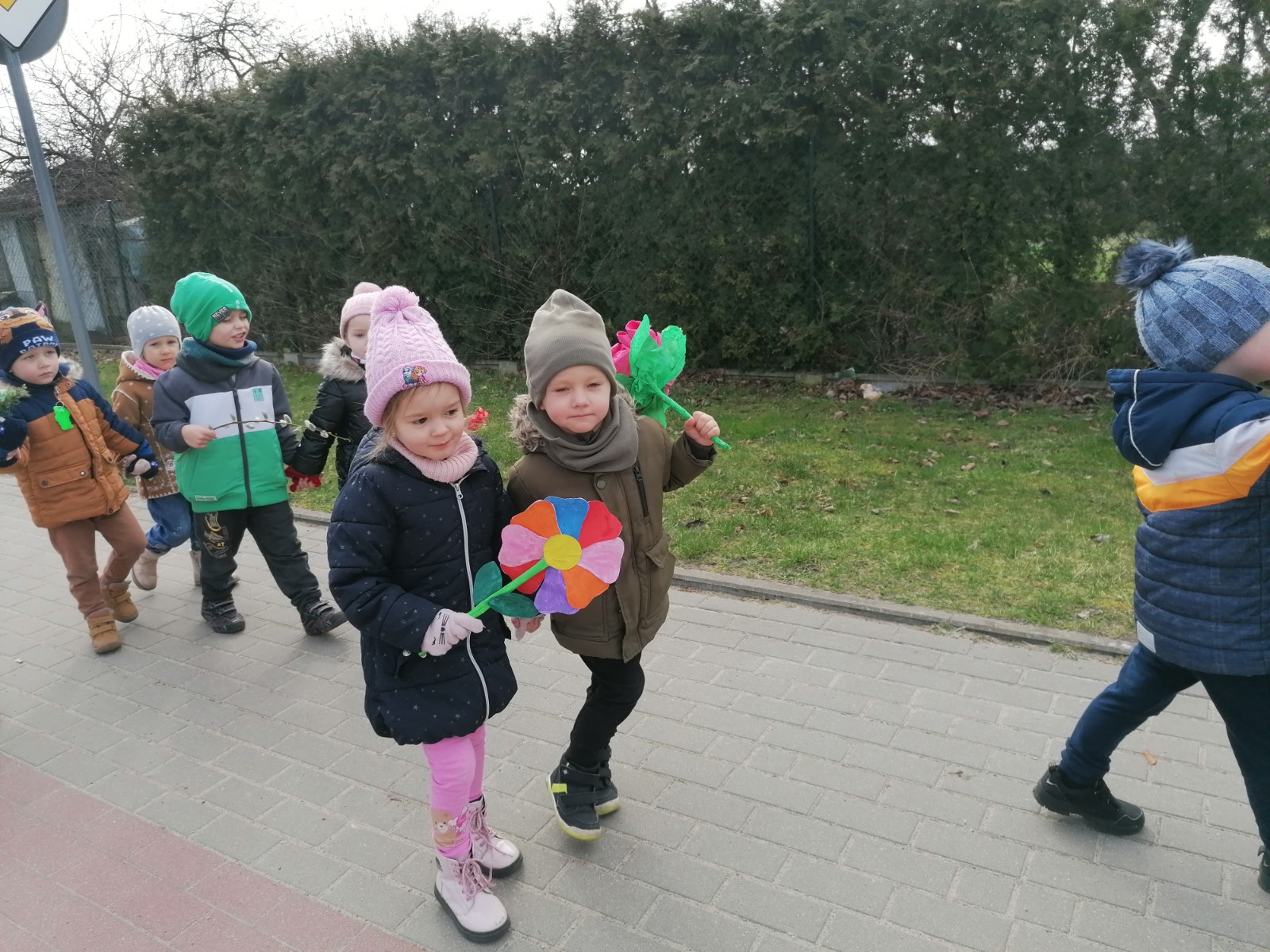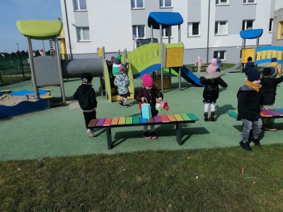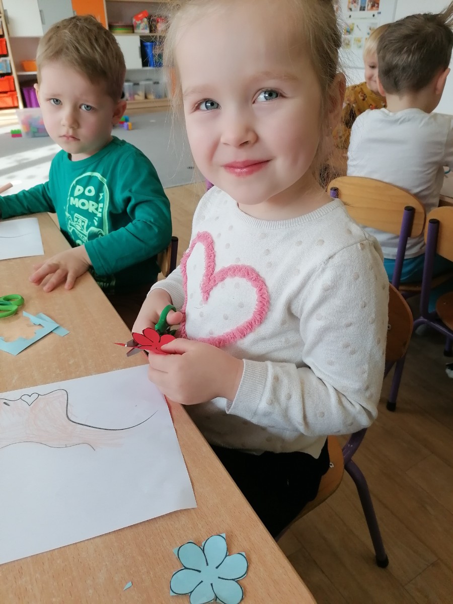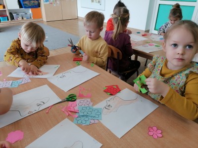 Na przywołanie "Wiosny" dzieci wybrały się na spacer z kolorowymi kwiatkami, aby wywołać z cienia zimy długo wyczekiwaną wiosnę. Kwiatki, które dzieci przyniosły z domu, wykonały wspólnie z Rodzicami. Podczas spaceru dzieci chętnie wywoływały wiosnę oraz śpiewały poznaną piosenkę "Kiedy wiosna przyjdzie do nas". Czas tego dnia zagospodarowaliśmy na wykonanie tematycznej pracy plastycznej.