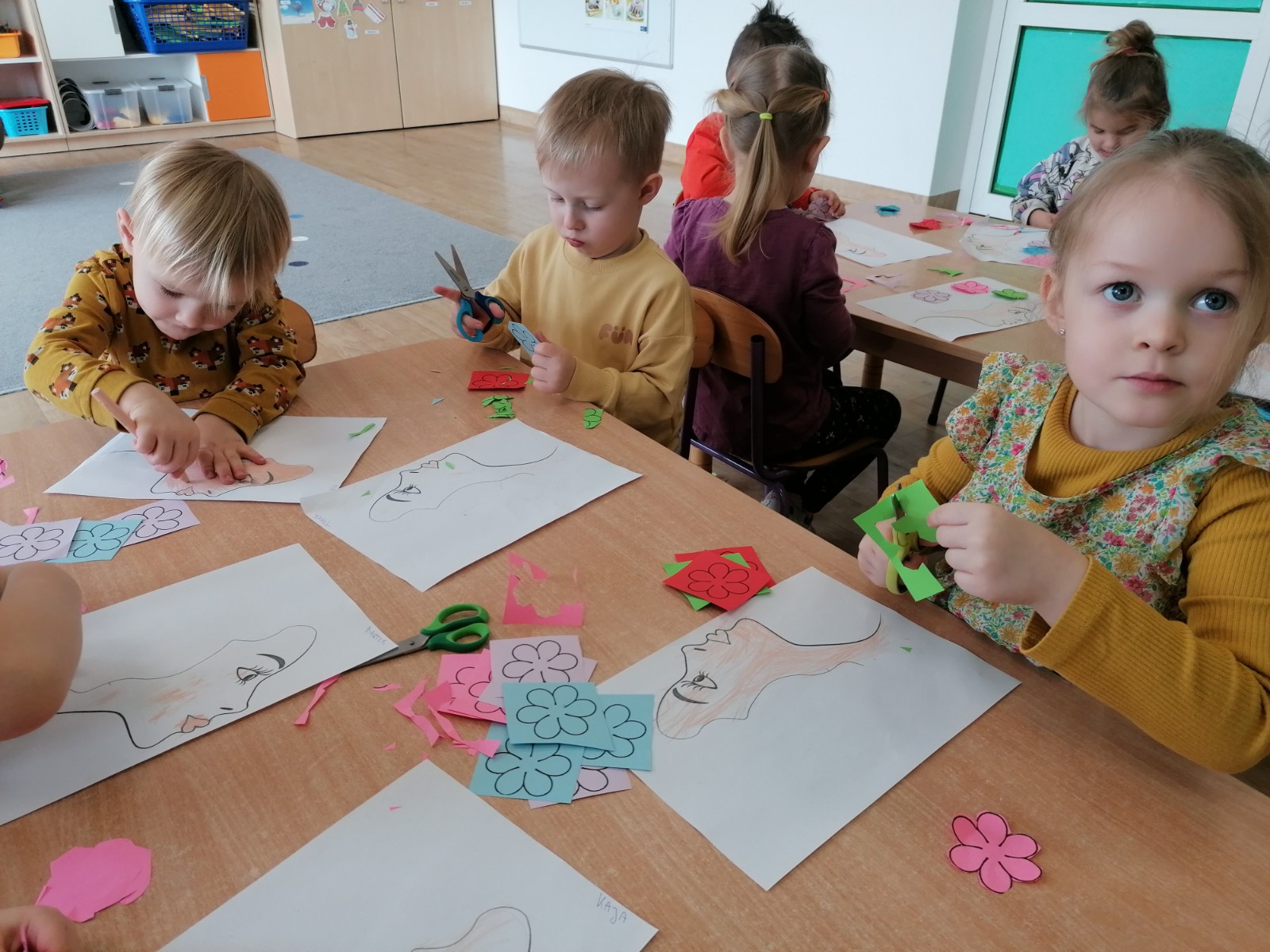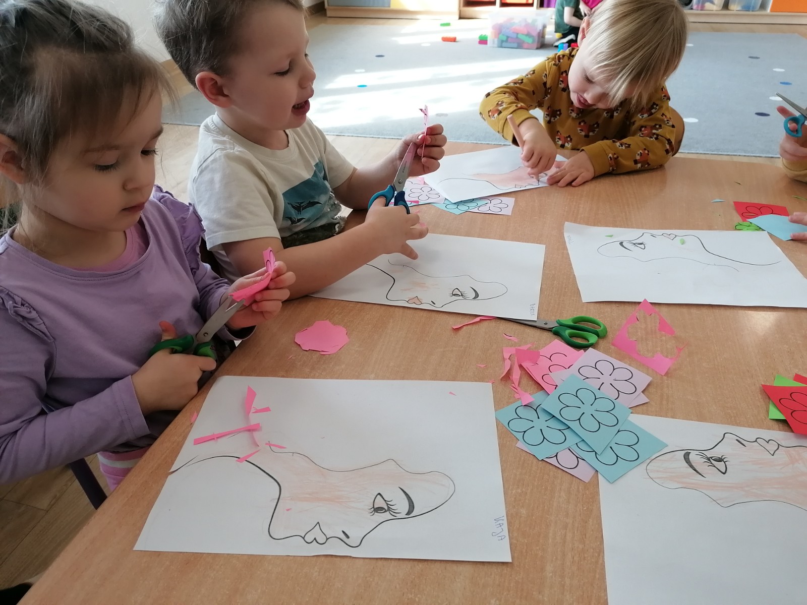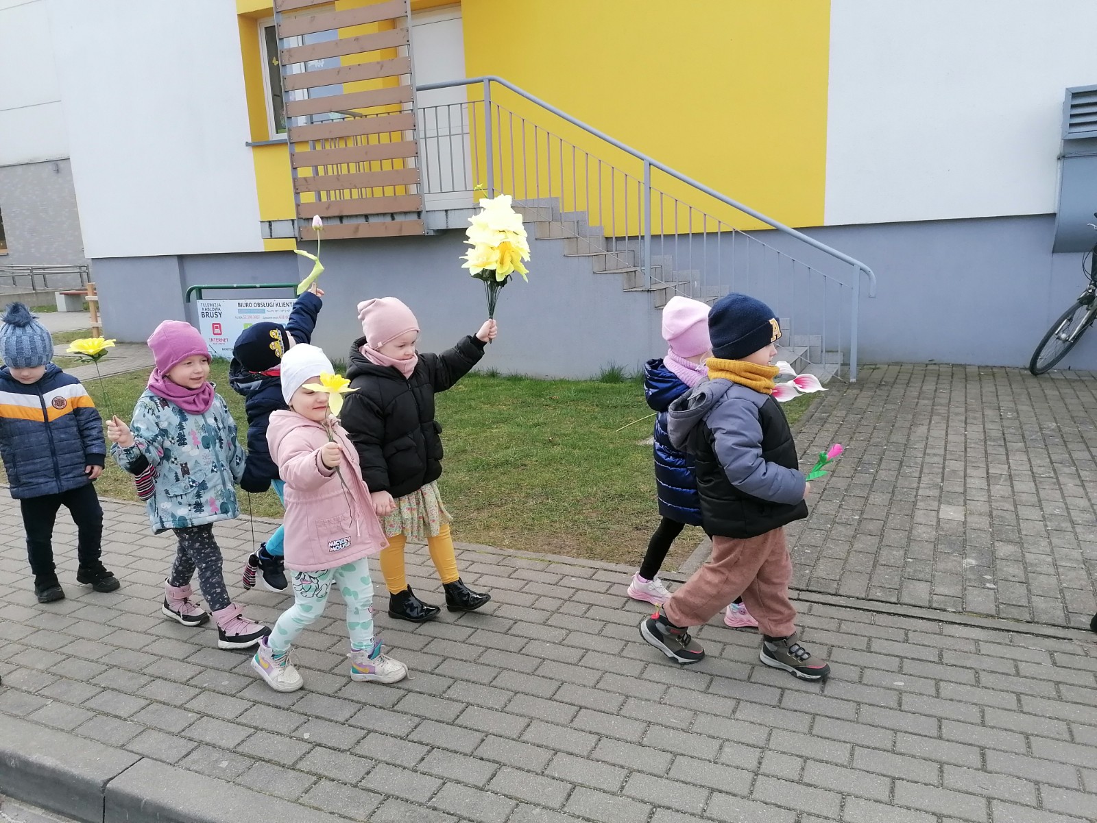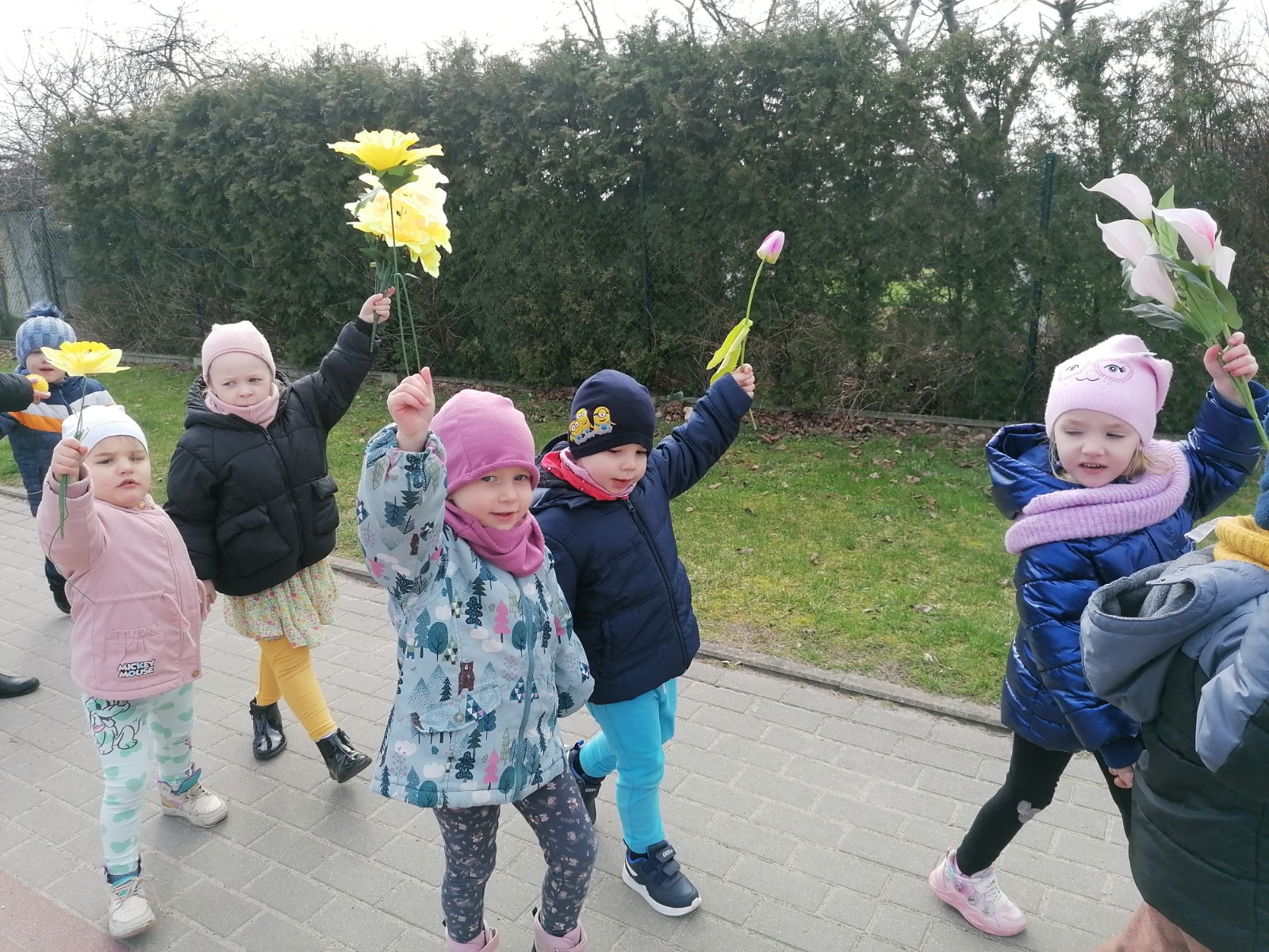 Na przywołanie "Wiosny" dzieci wybrały się na spacer z kolorowymi kwiatkami, aby wywołać z cienia zimy długo wyczekiwaną wiosnę. Kwiatki, które dzieci przyniosły z domu, wykonały wspólnie z Rodzicami. Podczas spaceru dzieci chętnie wywoływały wiosnę oraz śpiewały poznaną piosenkę "Kiedy wiosna przyjdzie do nas". Czas tego dnia zagospodarowaliśmy na wykonanie tematycznej pracy plastycznej.