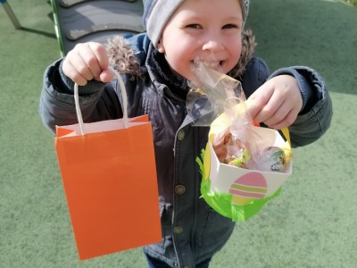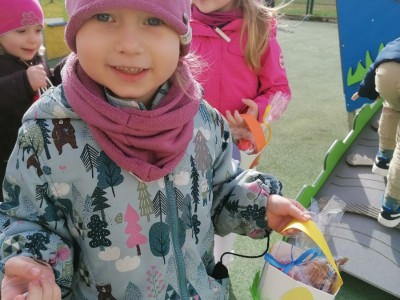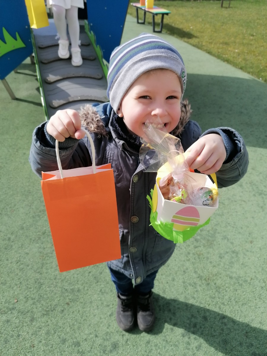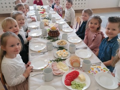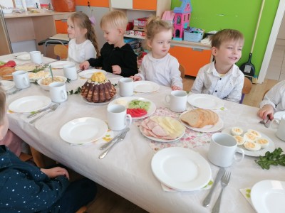 W Wielka Środę w grupie Jeżyki odbyło się odświętne śniadanie. Uroczystość zaczęliśmy od składania sobie życzeń, a następnie zasiedliśmy do wspólnego spożywania posiłku. Rodzice przygotowali całe śniadanie, a pysznych i tradycyjnych potraw dzieci chętnie próbowały. Po śniadaniu poszliśmy szukać zajączka.