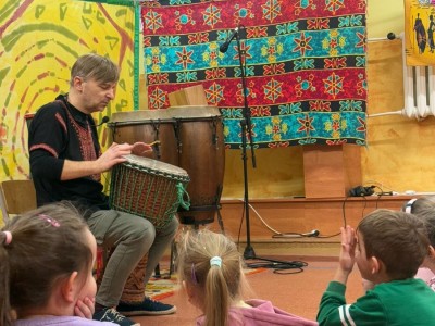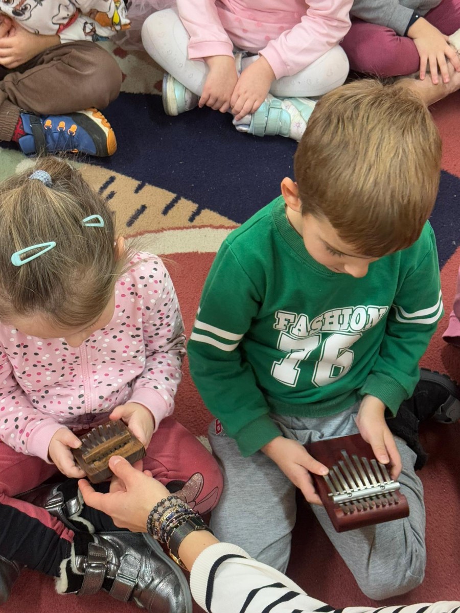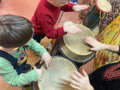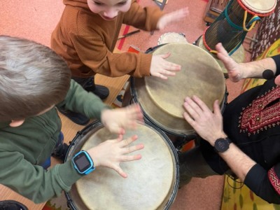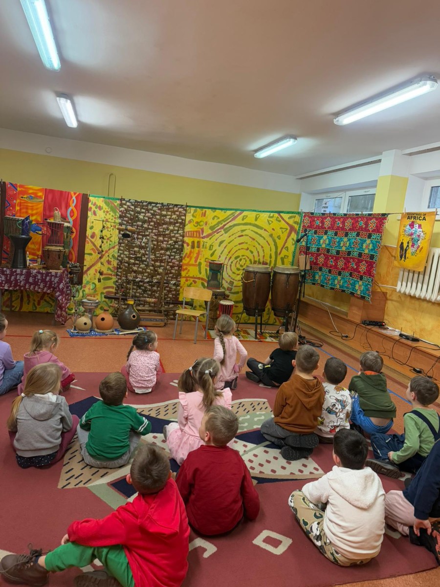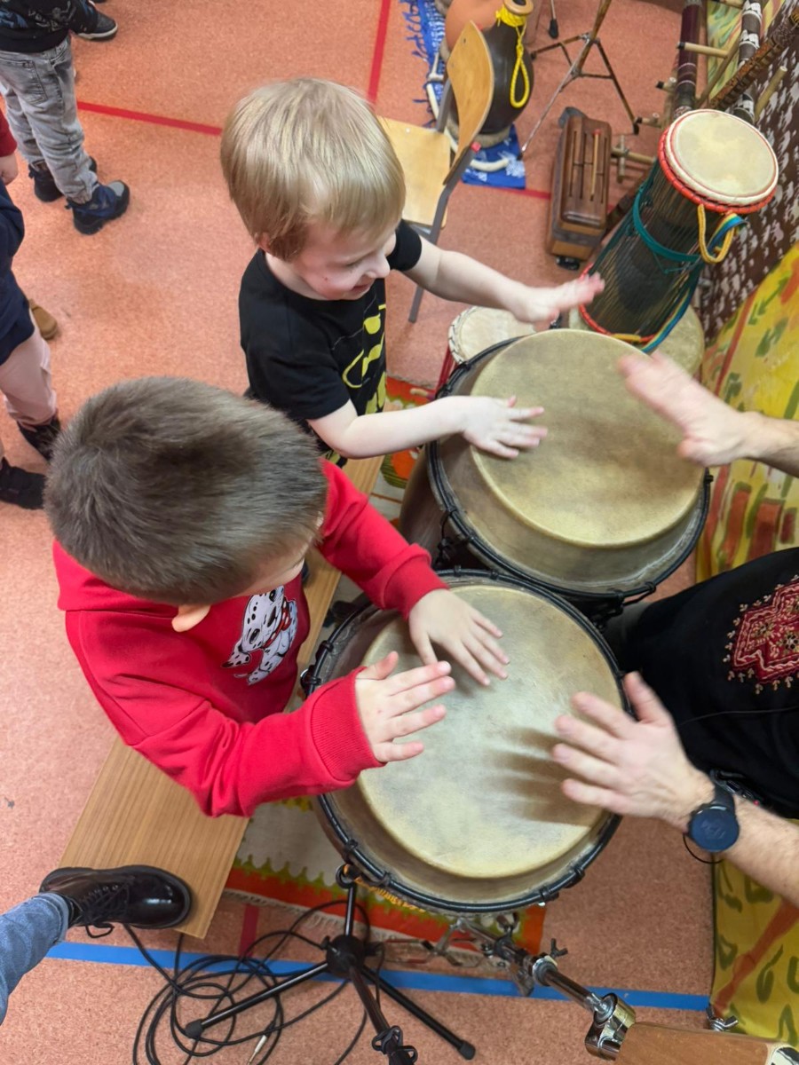 Podczas warsztatów rytmiczno – muzycznych przedszkolaki poznały budowę, nazwę i usłyszały brzmienie nieznanych im dotąd instrumentów. Dzieci mogły wysłuchać dźwięków granych na: bębnach, tubach, piszczałkach, dzwoneczkach, okarynach czy kalimbach. Żabki miały okazję "rysować" muzyczny obraz oczami wyobraźni. Największą atrakcją okazała się próba samodzielnej gry na afrykańskich bębnach Conga.