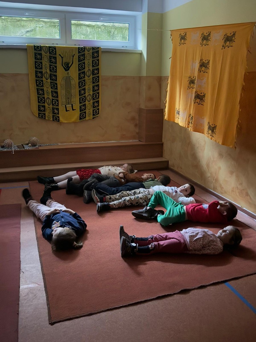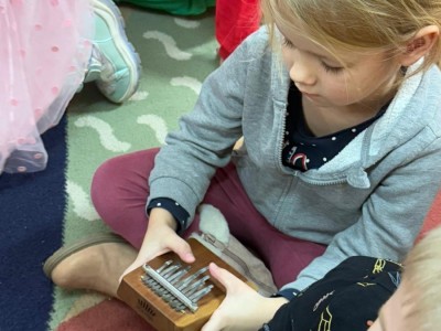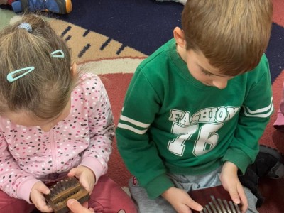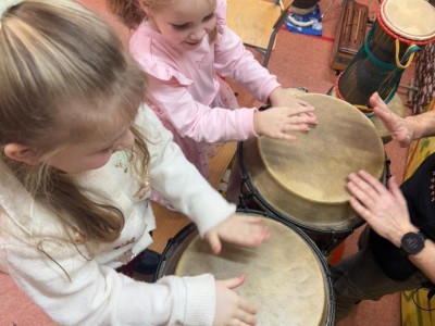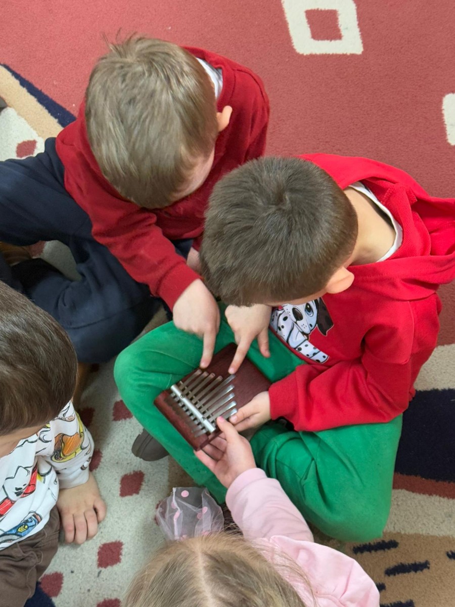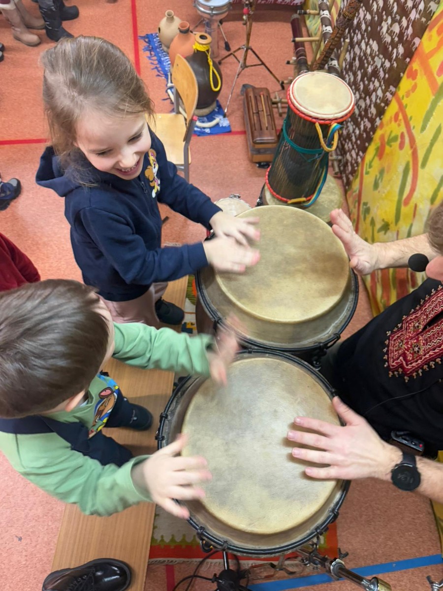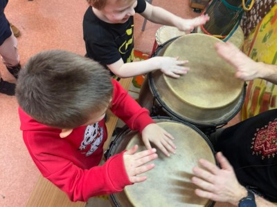 Podczas warsztatów rytmiczno – muzycznych przedszkolaki poznały budowę, nazwę i usłyszały brzmienie nieznanych im dotąd instrumentów. Dzieci mogły wysłuchać dźwięków granych na: bębnach, tubach, piszczałkach, dzwoneczkach, okarynach czy kalimbach. Żabki miały okazję "rysować" muzyczny obraz oczami wyobraźni. Największą atrakcją okazała się próba samodzielnej gry na afrykańskich bębnach Conga.
