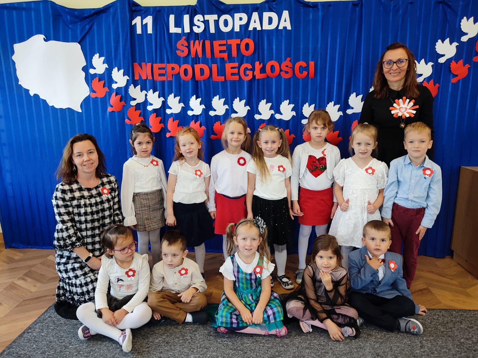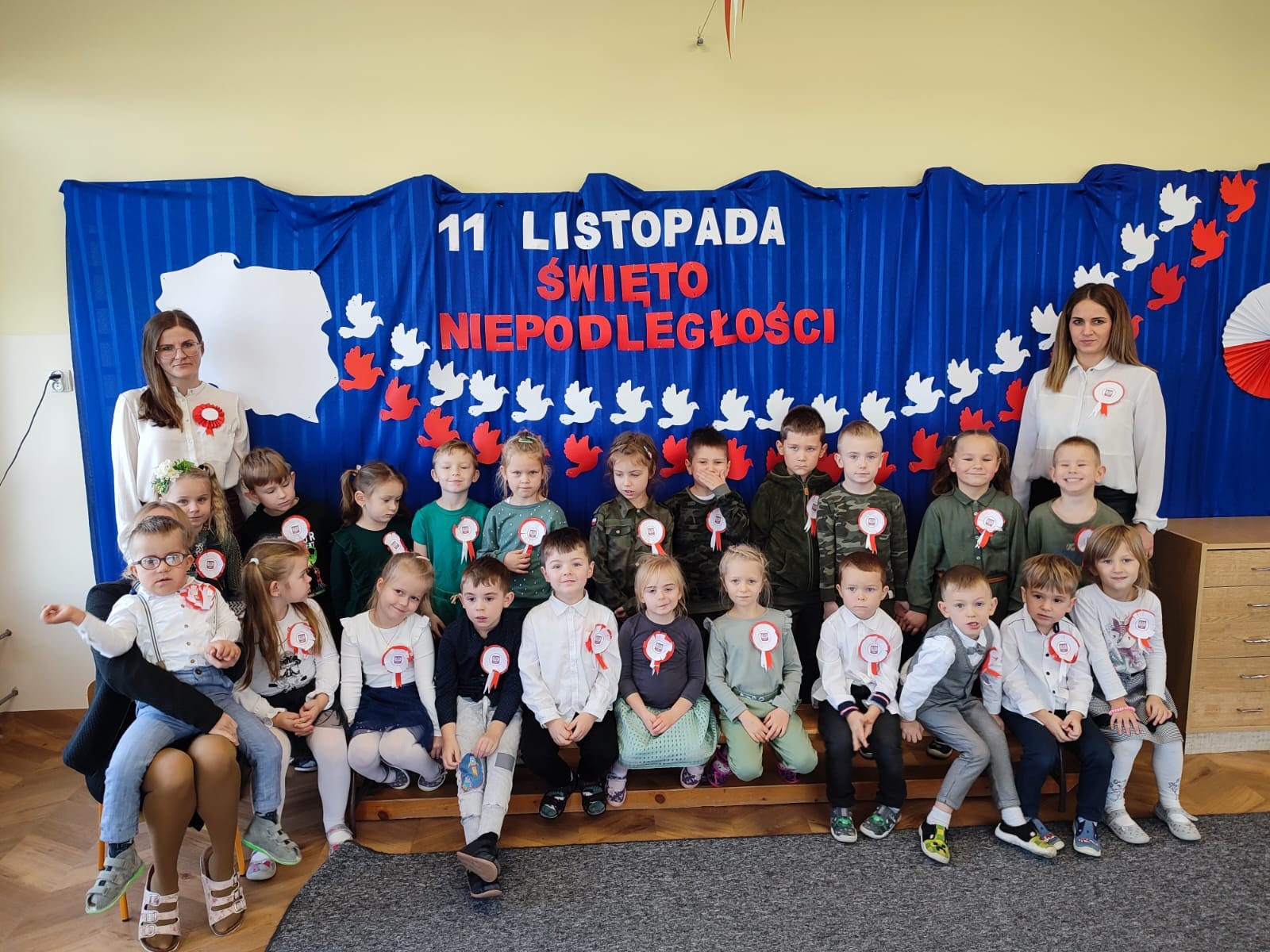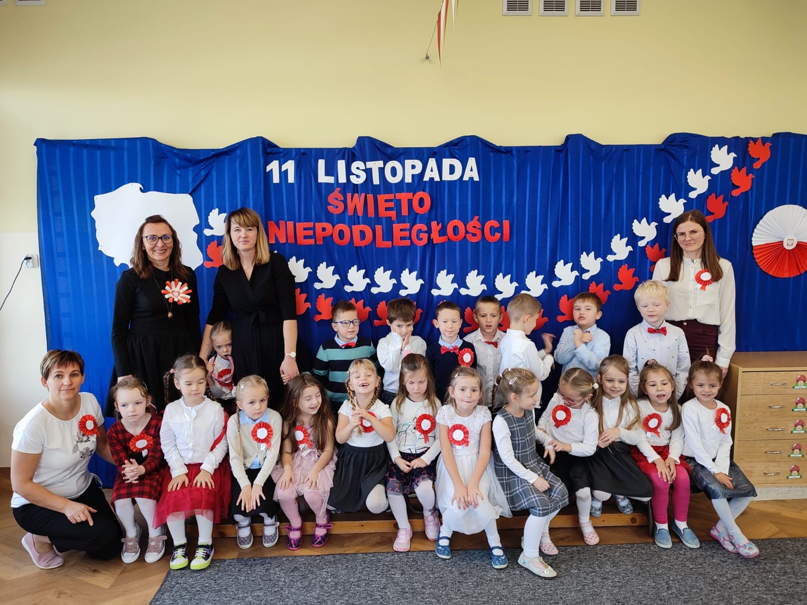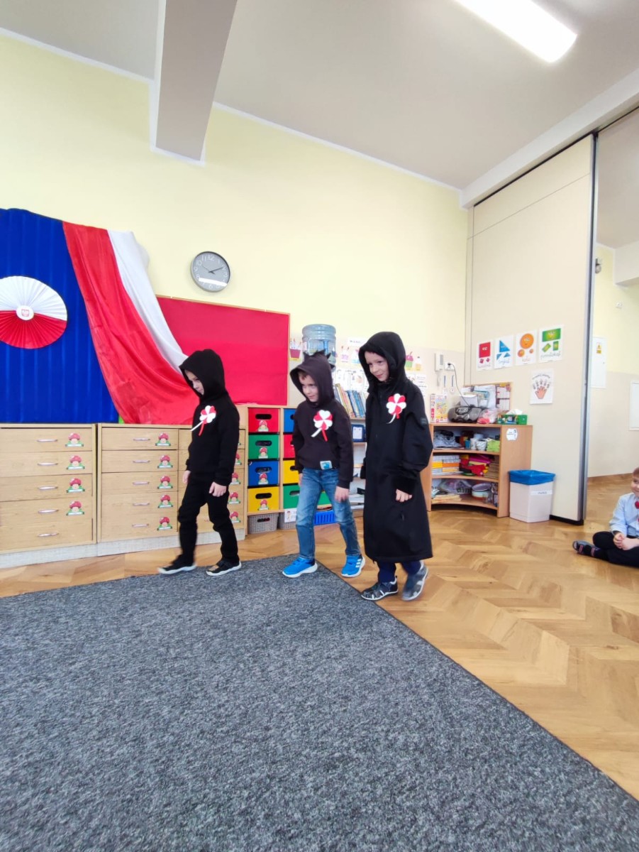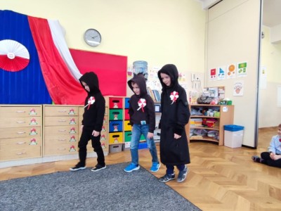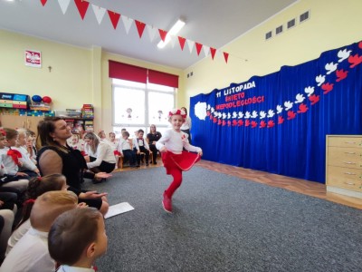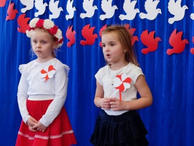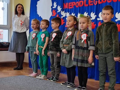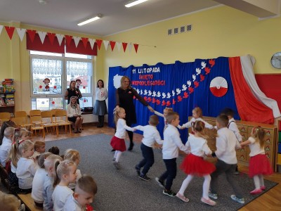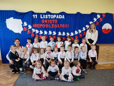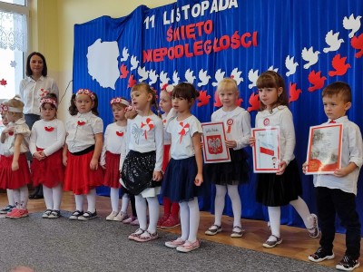 W piątek 10 listopada cała społeczność przedszkolna zaangażowała się w obchody Święta Niepodległości. Z tej okazji wszystkie grupy przedszkolne spotkały się na holu przedszkola aby obejrzeć przedstawienie patriotyczne przygotowane przez dzieci z poszczególnych grup. Podczas przedstawienia dzieci miały okazję zobaczyć jak trzej Zaborcy- Rosja, Austria i Prusy zagrabili naszą Ojczyznę. W wielkim skupieniu przedszkolacy słuchali opowieści swoich kolegów i koleżanek o tym jak po latach niewoli Polska znowu odzyskała wolność. Każda z grup przybyła na uroczystość w odświętnych strojach oraz z biało czerwonymi kotylionami na piersi. W całym przedszkolu rozbrzmiewał śpiew Mazurka Dąbrowskiego. Było to niezwykłe spotkanie, które pomogło najmłodszym zrozumieć sens wielkiego święta Polski.