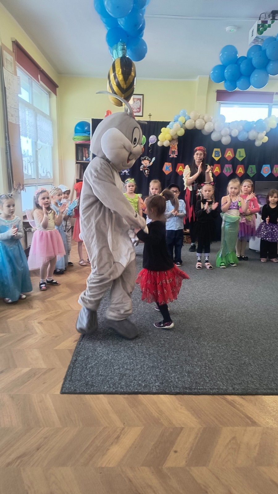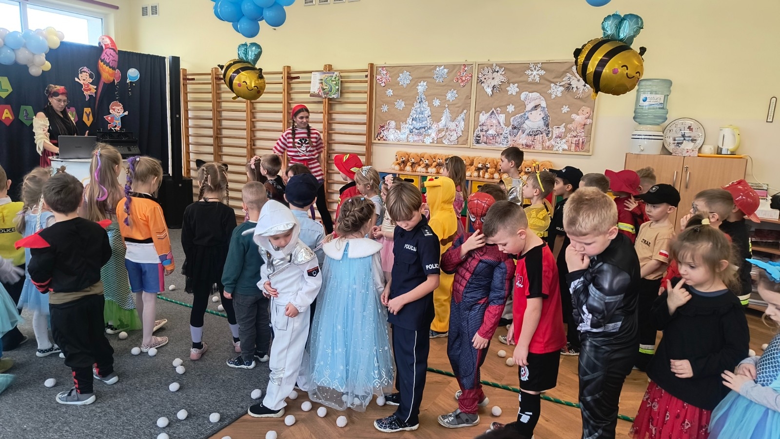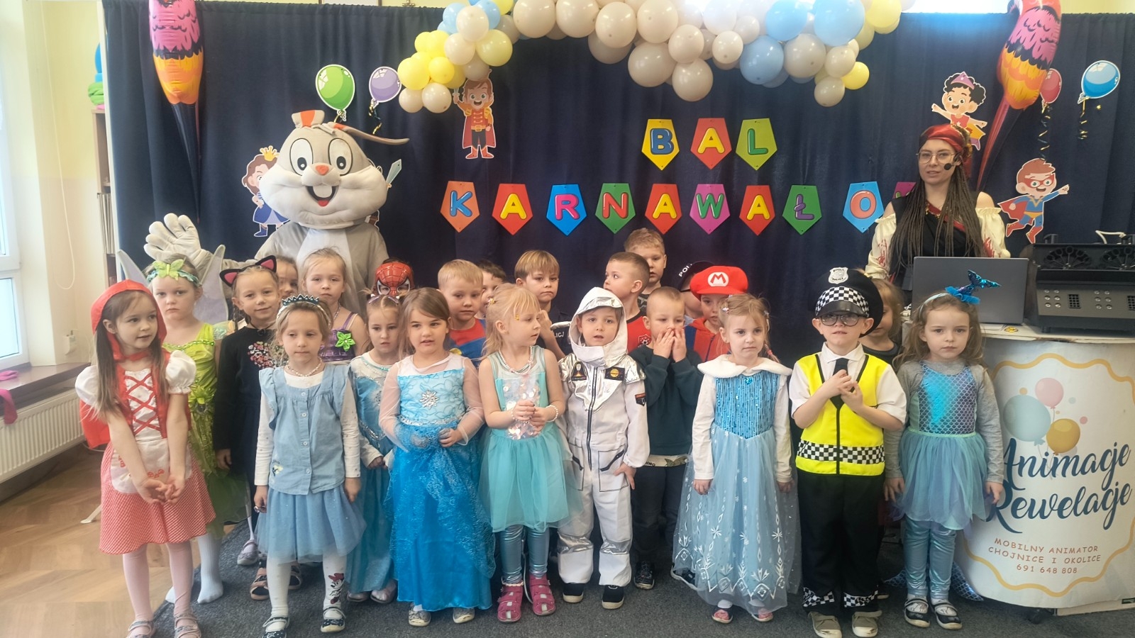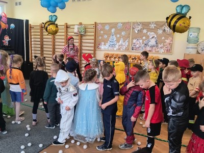Wyjątkową atrakcją balu były animacje poprowadzone przez Panią z firmy Animacje Relacje, która przygotowała wiele ciekawych i angażujących zabaw. Wśród nich znalazło się m.in. przekazywanie „skarbu” nad głowami uczestników oraz łowienie i przerzucanie pereł do przeciwnej drużyny. Zabawy te rozwijały współpracę, sprawność ruchową i dostarczyły dzieciom mnóstwo radości. Bal Karnawałowy upłynął w wesołej, pełnej muzyki i uśmiechów atmosferze i na długo pozostanie w pamięci uczestników.