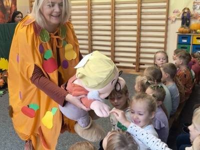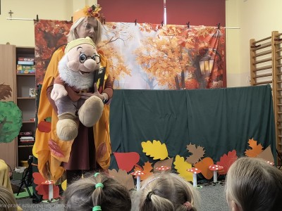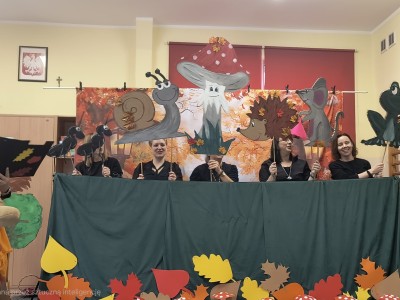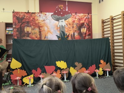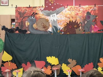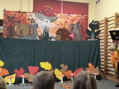 W październiku dzieci z Przedszkola nr 1 w Brusach mogły obejrzeć wyjątkowe przedstawienie "Dom pod Muchomorkiem" . Postaciom występującym w spektaklu głosu użyczyły nauczycielki, które od samego początku ukryte były za dekoracją. Jedyną osobą, która witała dzieci i była jednocześnie narratorem była pani Brygida. To właśnie ona wspólnie z Krasnalem rozpoczęła opowieść o przyjaźni pomiędzy mieszkańcami lasu. Na występ zaproszone zostały wszystkie grupy z przedszkola oraz uczestnicy Środowiskowego Domu Samopomocy w Brusach. Sądząc po minach gości i gromkich brawach jesteśmy pewni, że przedstawienie się spodobało.