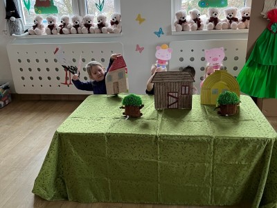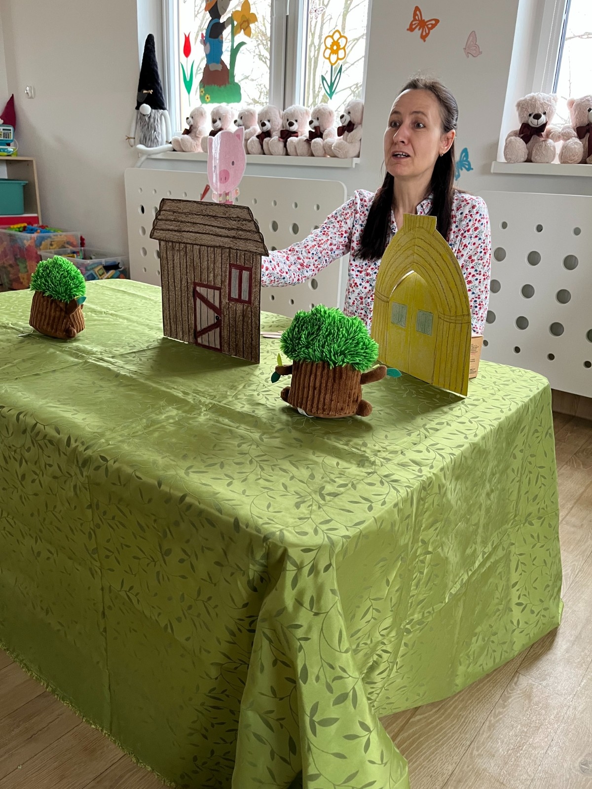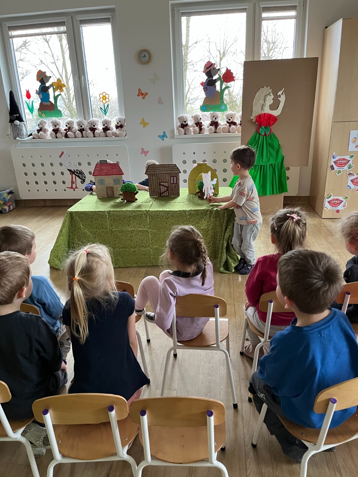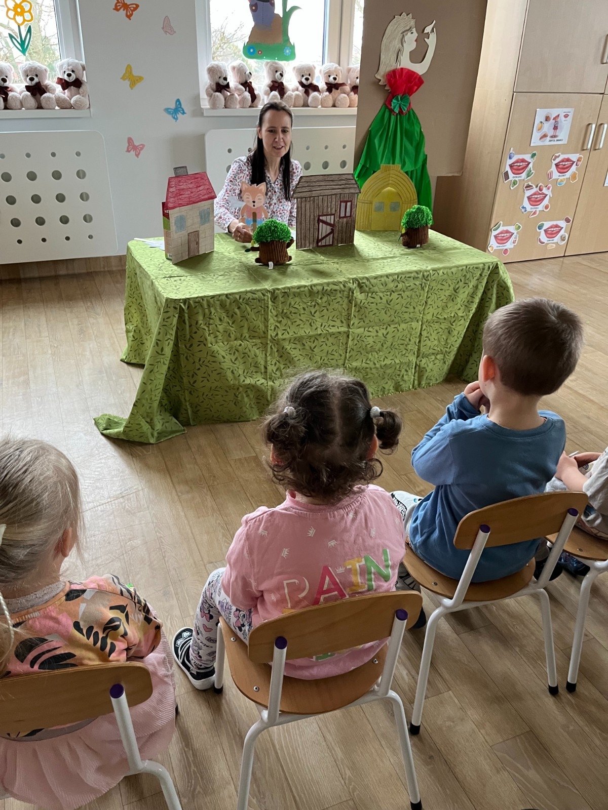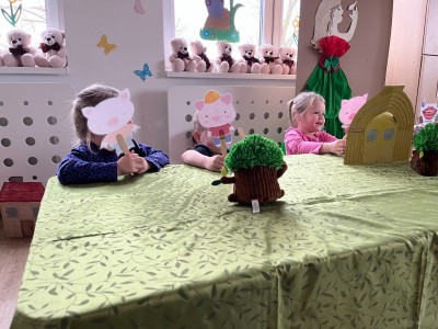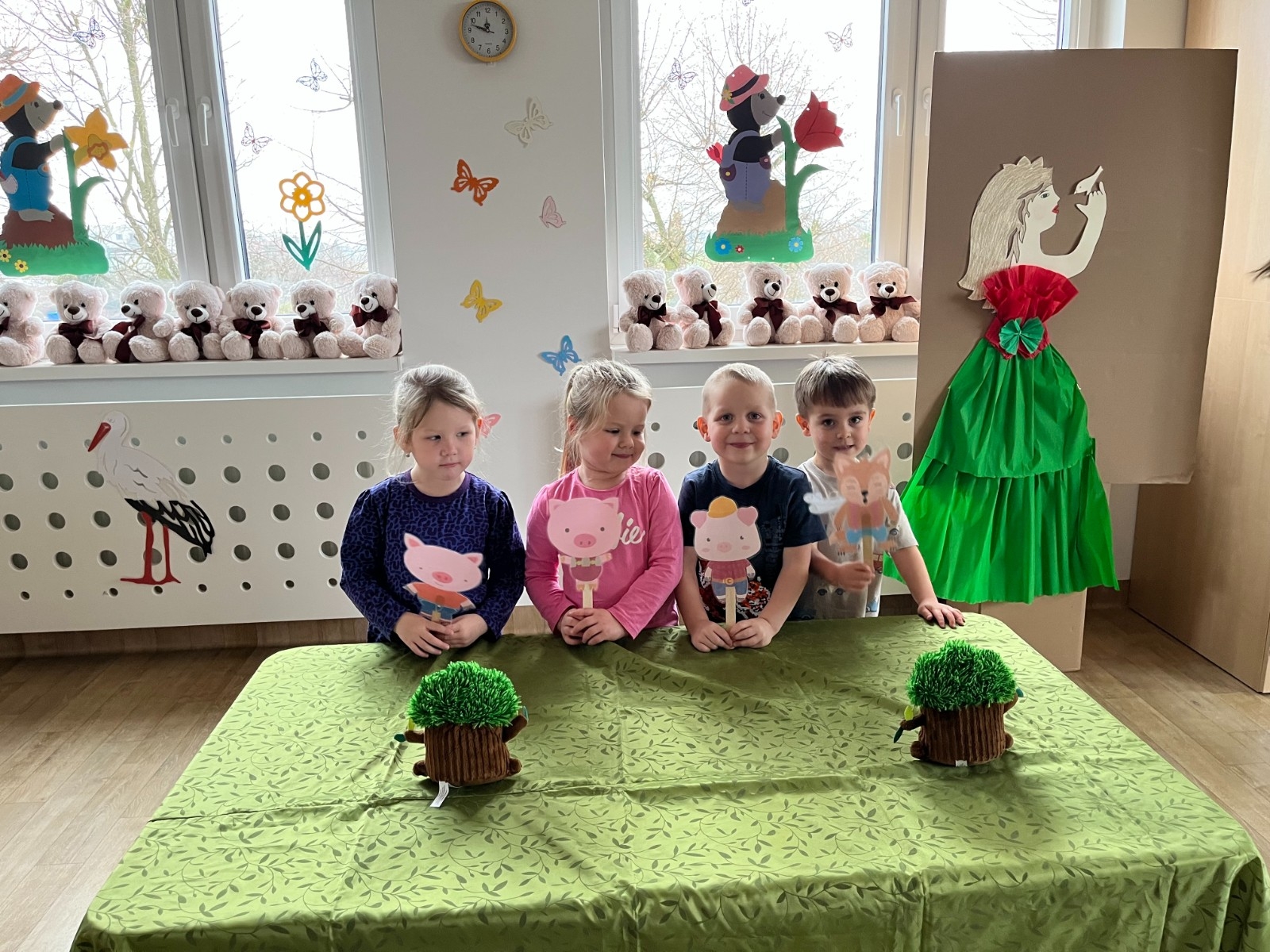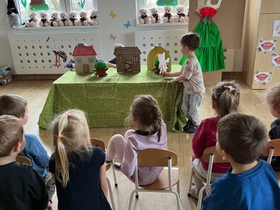 Podczas marcowych zajęć teatralnych, realizowanych w ramach projektu Gmina Brusy stawia na przedszkolaków, Krasnoludki z Przedszkola nr 1 w Brusach obejrzały teatrzyk pt. Trzy świnki w wykonaniu nauczycielki. Po przedstawieniu dzieci bawiły się przygotowanymi przez nauczycielkę pacynkami wcielając się w rolę postaci z obejrzanej bajki. Zabawy w teatrze sprawiają dzieciom dużą frajdę. Dzieci mogły także same przygotować paluszkowe pacynki do zabaw w domu.