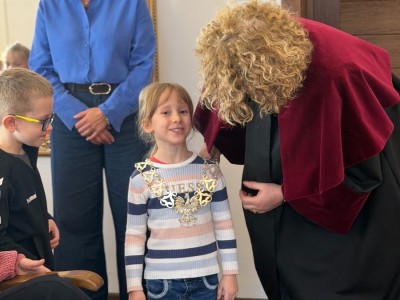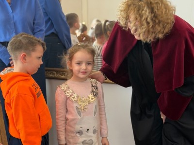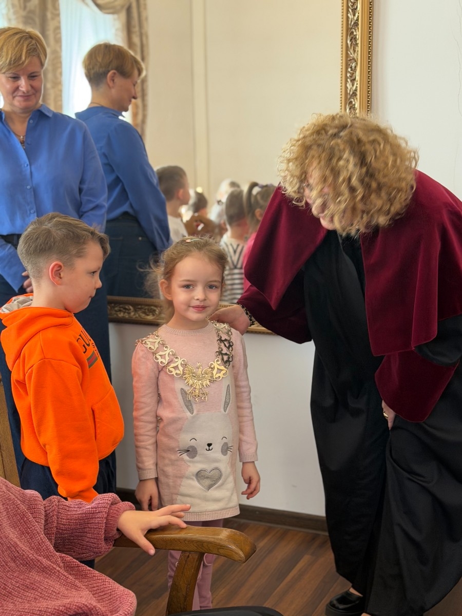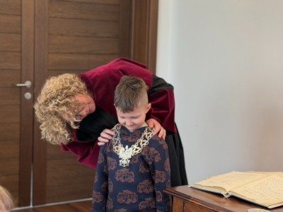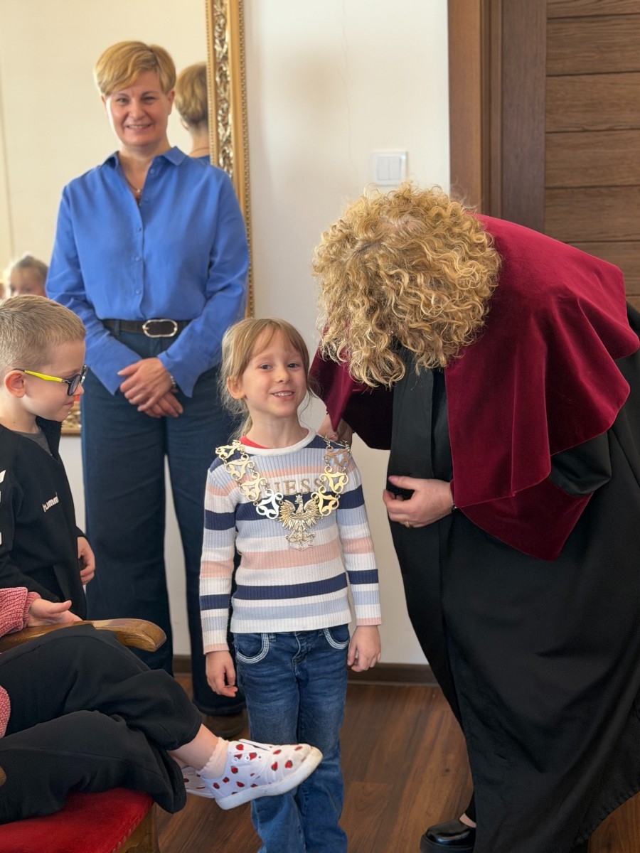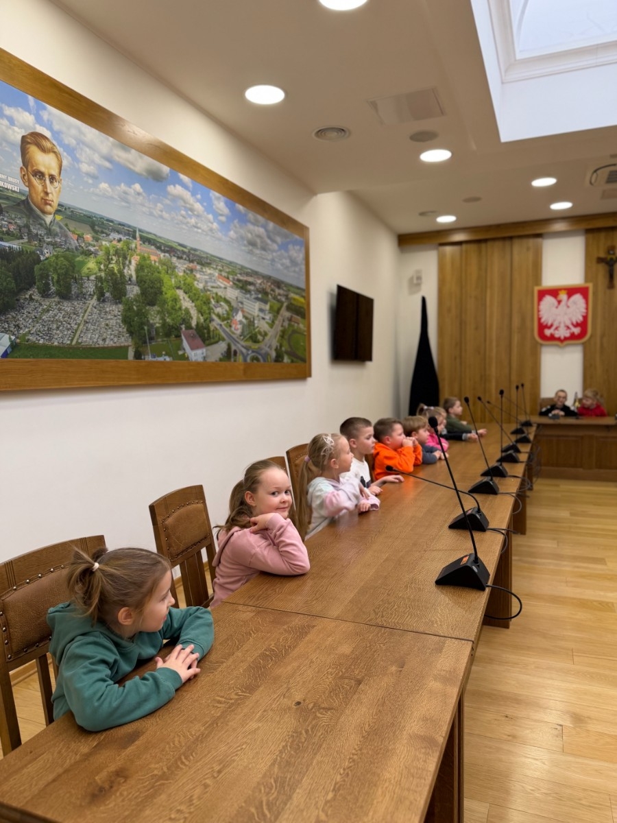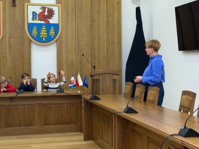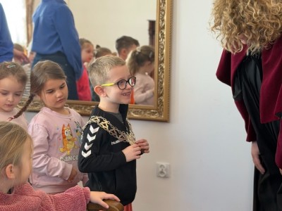 Na początku serdecznie przywitała nas Pani Mariola Rodzeń – Sekretarz Gminy, która oprowadziła dzieci po urzędzie i w interesujący sposób opowiedziała o jego działalności. Przedszkolaki miały możliwość usiąść na miejscach radnych i poczuć się jak podczas prawdziwej sesji Rady Miejskiej, a także poznać historię ks. Jankowskiego. Dzieci zwiedziły również Urząd Stanu Cywilnego, gdzie mogły zobaczyć, jak wygląda miejsce zawierania ślubów oraz przymierzyć uroczysty łańcuch Kierownika Urzędu Stanu Cywilnego.