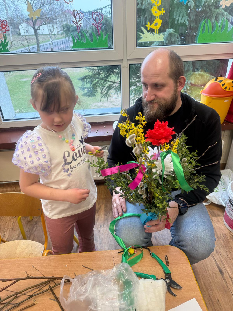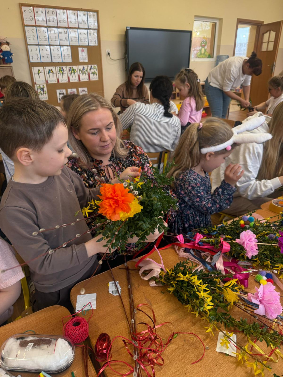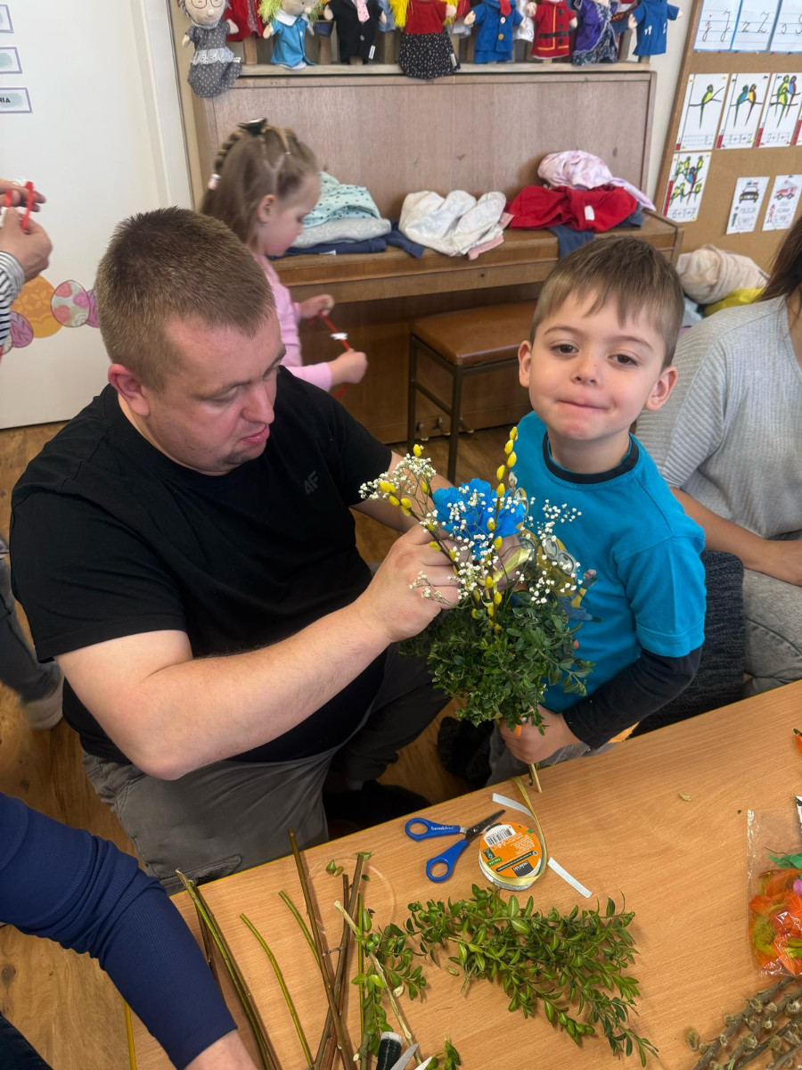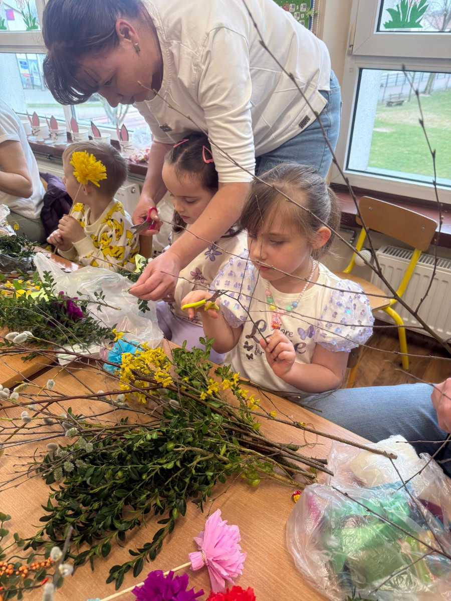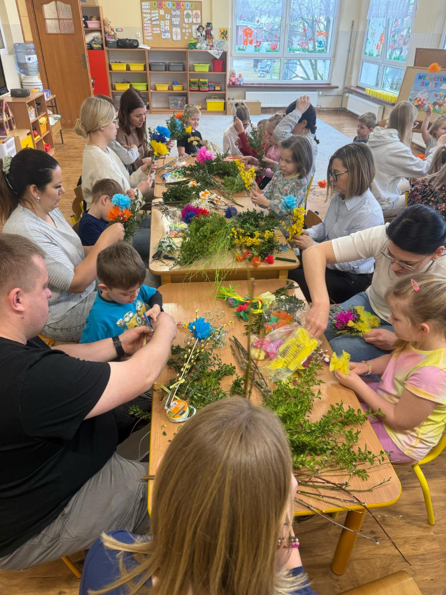 W piątek 14. kwietnia, w grupie Żabek odbyły się wyjątkowe Warsztaty Wielkanocne z udziałem rodziców. Dzieci wspólnie z najbliższymi tworzyły tradycyjne palmy wielkanocne oraz siały rzeżuchę. Sala przedszkolna zamieniła się w kolorową pracownię – stoły zostały udekorowane bibułą, gałązkami bukszpanu, kolorowymi kwiatami, elementami dekoracyjnymi i wstążkami. Pod okiem nauczycieli oraz z pomocą rodziców, dzieci z zapałem skręcały, wiązały i ozdabiały swoje palmy. Wspólna praca była doskonałą okazją do integracji grupowej. To było niezwykle ciepłe i rodzinne spotkanie, które na długo zostanie w naszej pamięci. Wszystkim uczestnikom spotkania dziękujemy za udział i zaangażowanie oraz mile spędzony czas. :)