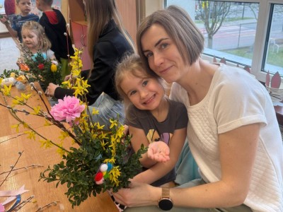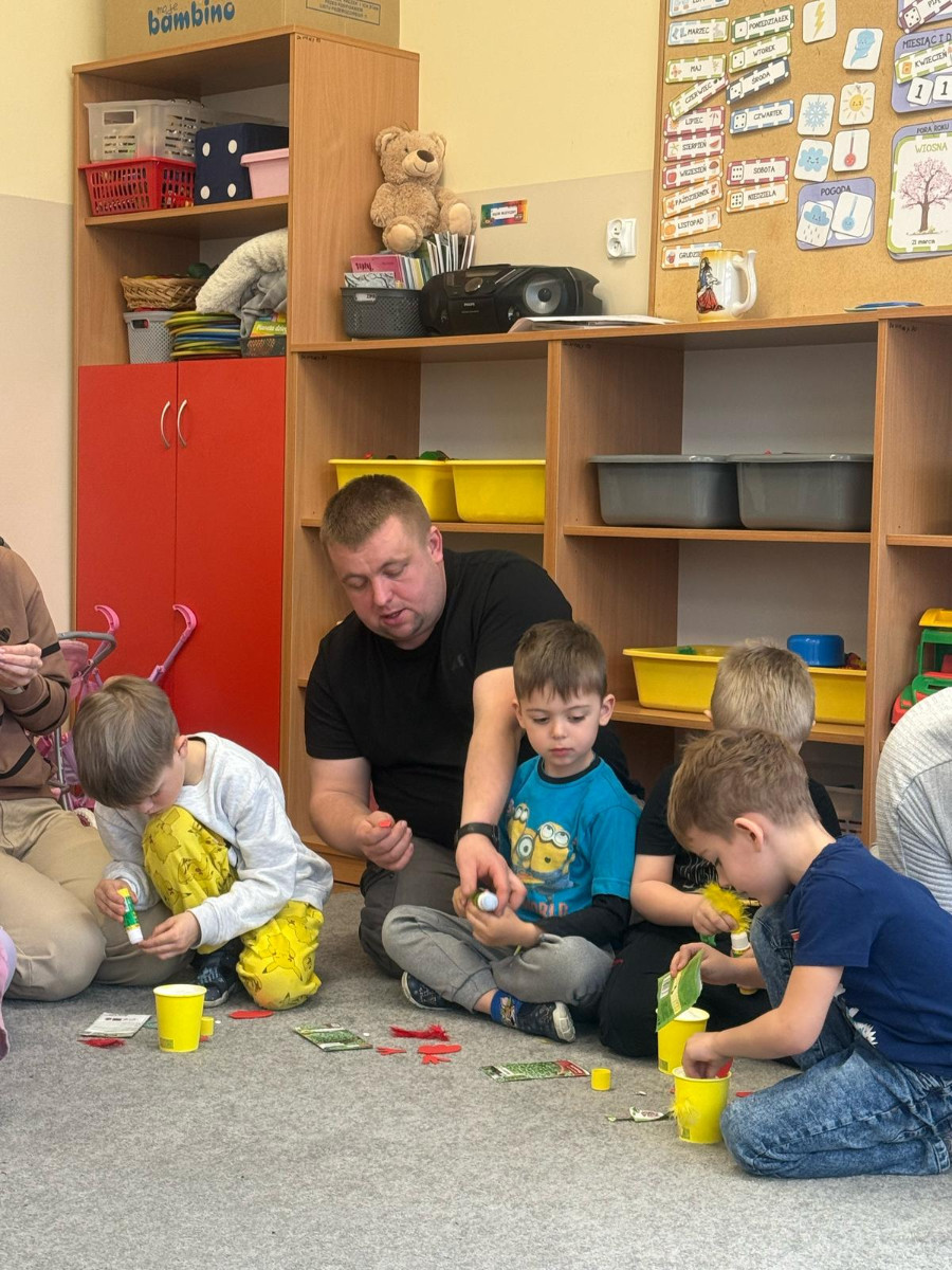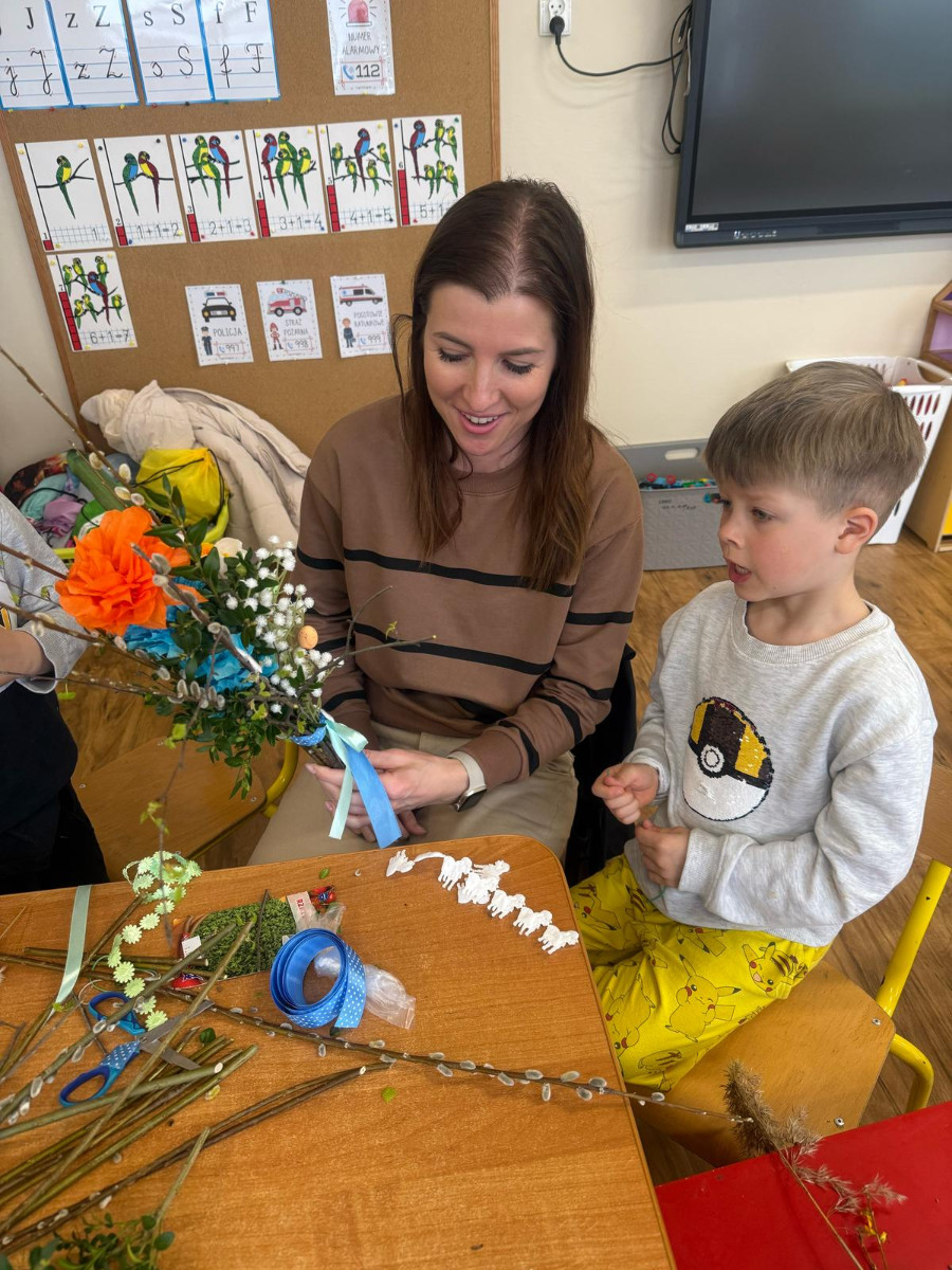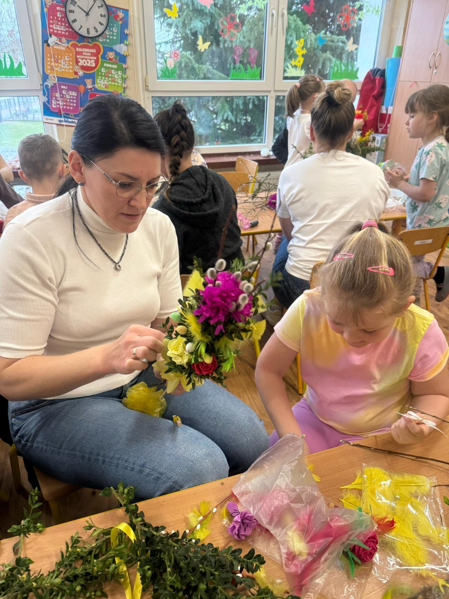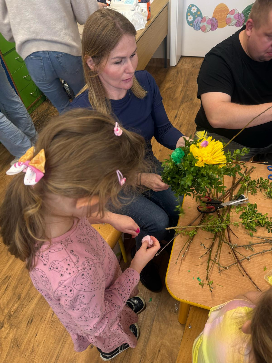 W piątek 14. kwietnia, w grupie Żabek odbyły się wyjątkowe Warsztaty Wielkanocne z udziałem rodziców. Dzieci wspólnie z najbliższymi tworzyły tradycyjne palmy wielkanocne oraz siały rzeżuchę. Sala przedszkolna zamieniła się w kolorową pracownię – stoły zostały udekorowane bibułą, gałązkami bukszpanu, kolorowymi kwiatami, elementami dekoracyjnymi i wstążkami. Pod okiem nauczycieli oraz z pomocą rodziców, dzieci z zapałem skręcały, wiązały i ozdabiały swoje palmy. Wspólna praca była doskonałą okazją do integracji grupowej. To było niezwykle ciepłe i rodzinne spotkanie, które na długo zostanie w naszej pamięci. Wszystkim uczestnikom spotkania dziękujemy za udział i zaangażowanie oraz mile spędzony czas. :)