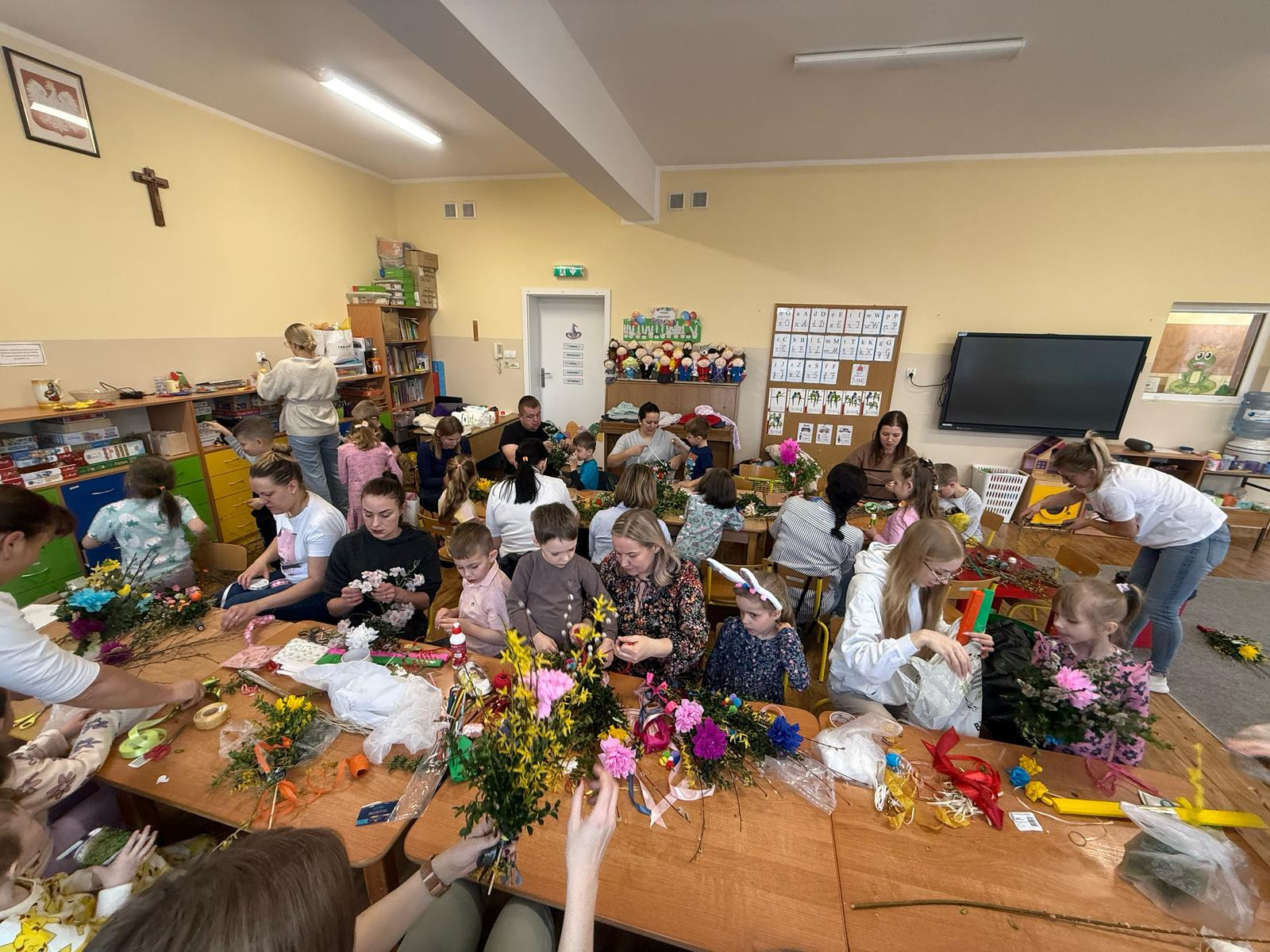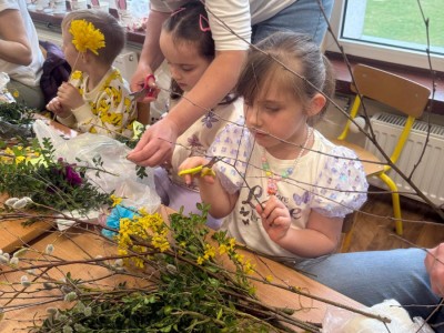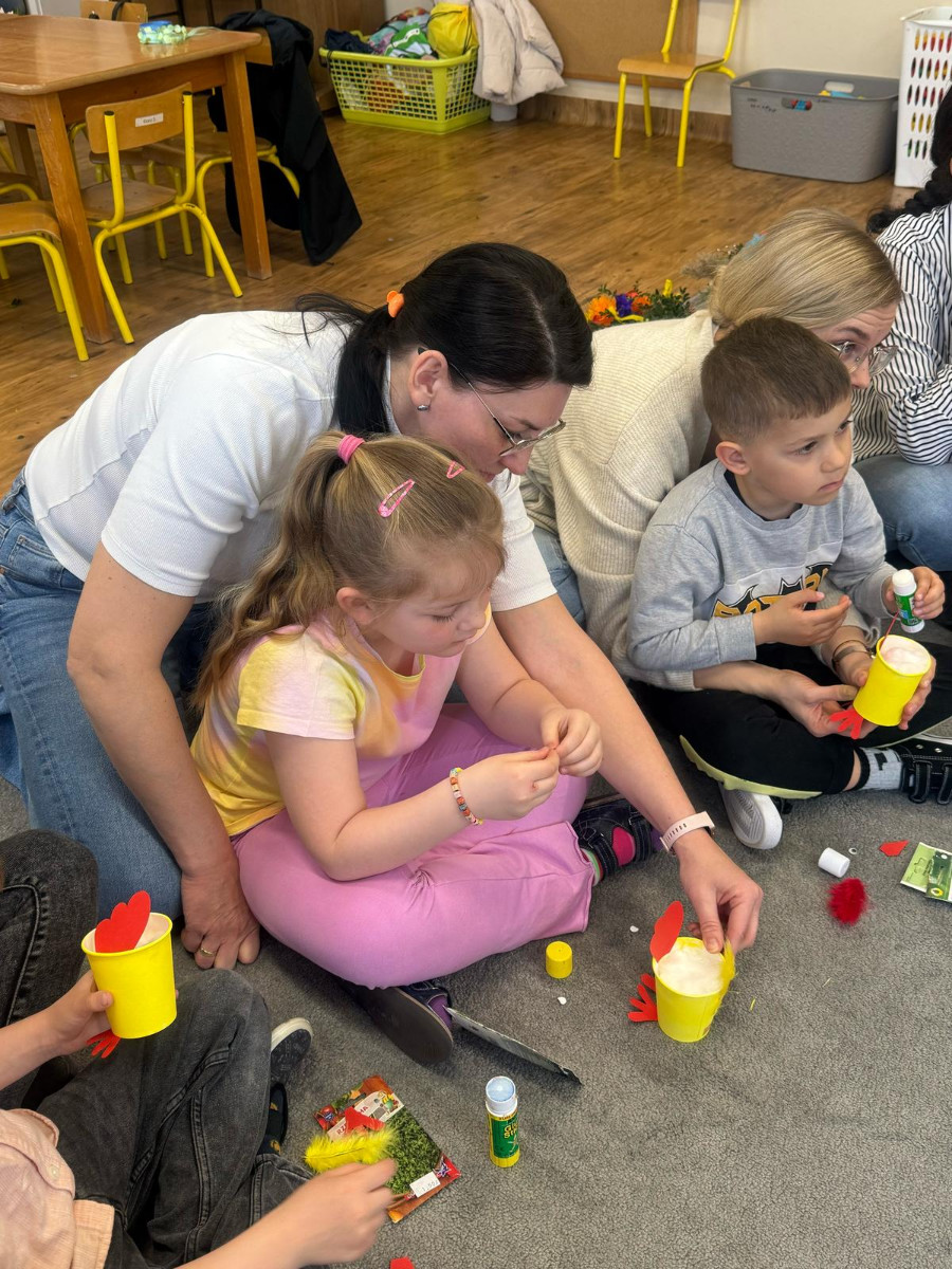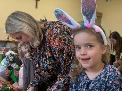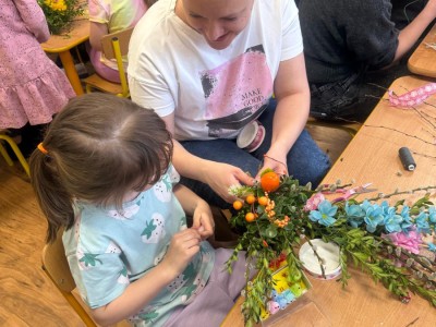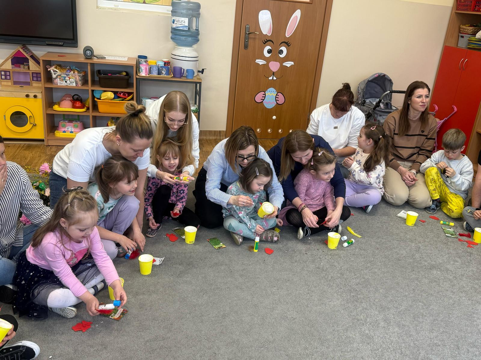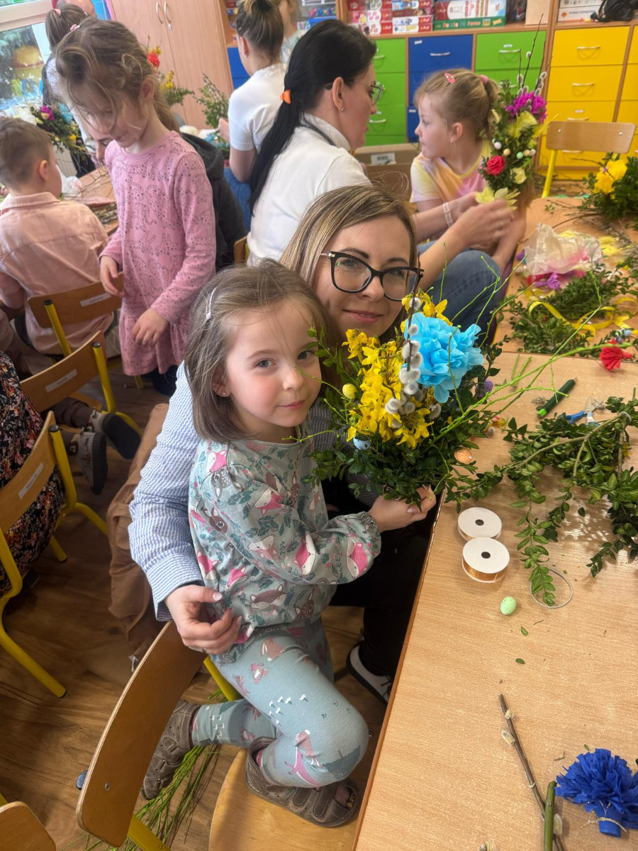 W piątek 14. kwietnia, w grupie Żabek odbyły się wyjątkowe Warsztaty Wielkanocne z udziałem rodziców. Dzieci wspólnie z najbliższymi tworzyły tradycyjne palmy wielkanocne oraz siały rzeżuchę. Sala przedszkolna zamieniła się w kolorową pracownię – stoły zostały udekorowane bibułą, gałązkami bukszpanu, kolorowymi kwiatami, elementami dekoracyjnymi i wstążkami. Pod okiem nauczycieli oraz z pomocą rodziców, dzieci z zapałem skręcały, wiązały i ozdabiały swoje palmy. Wspólna praca była doskonałą okazją do integracji grupowej. To było niezwykle ciepłe i rodzinne spotkanie, które na długo zostanie w naszej pamięci. Wszystkim uczestnikom spotkania dziękujemy za udział i zaangażowanie oraz mile spędzony czas. :)