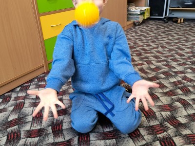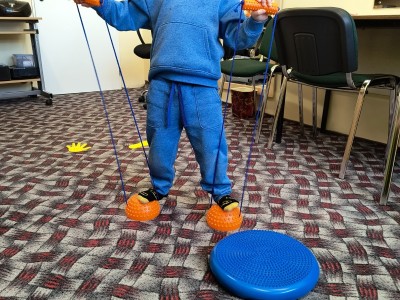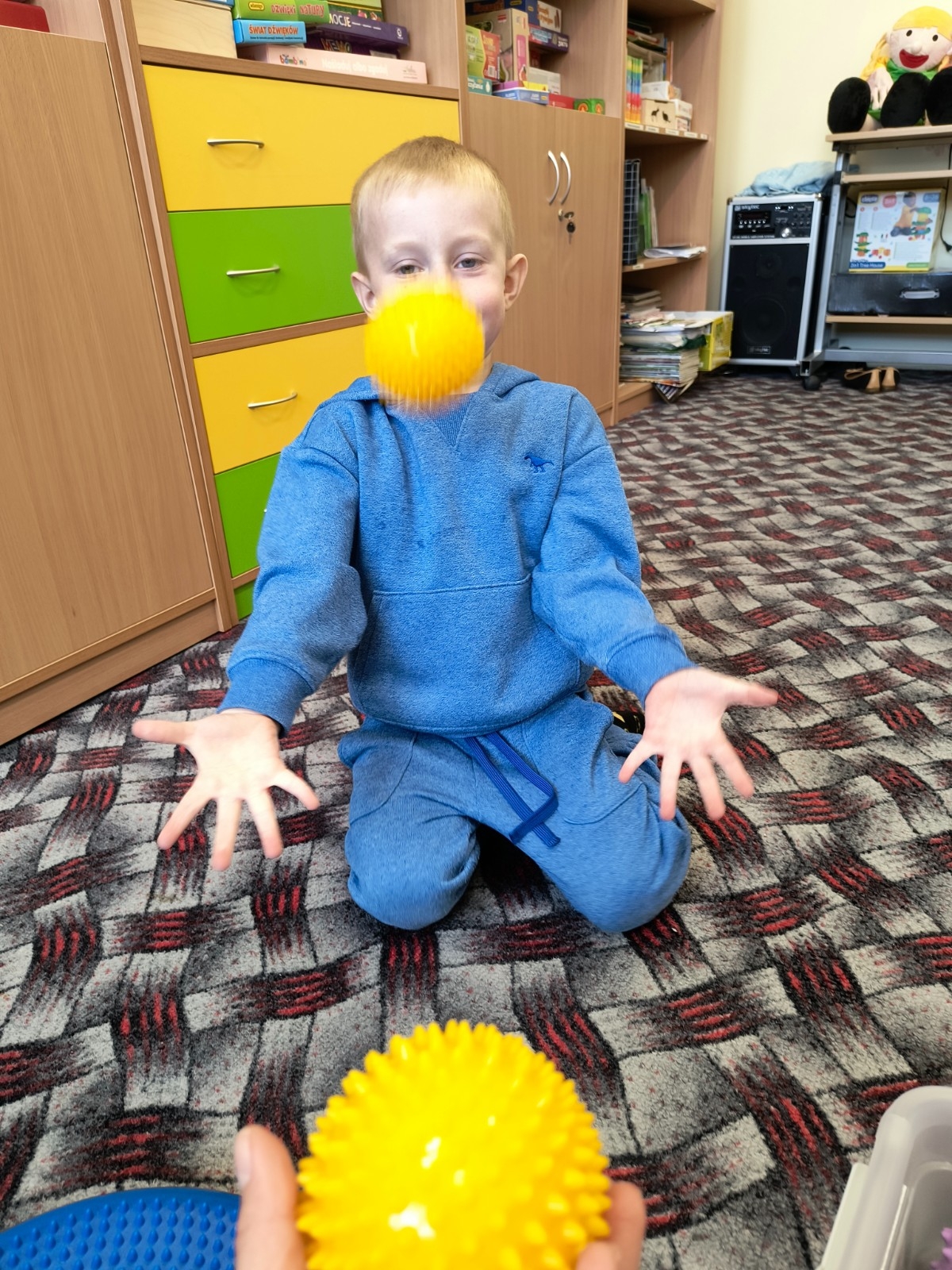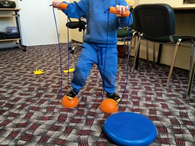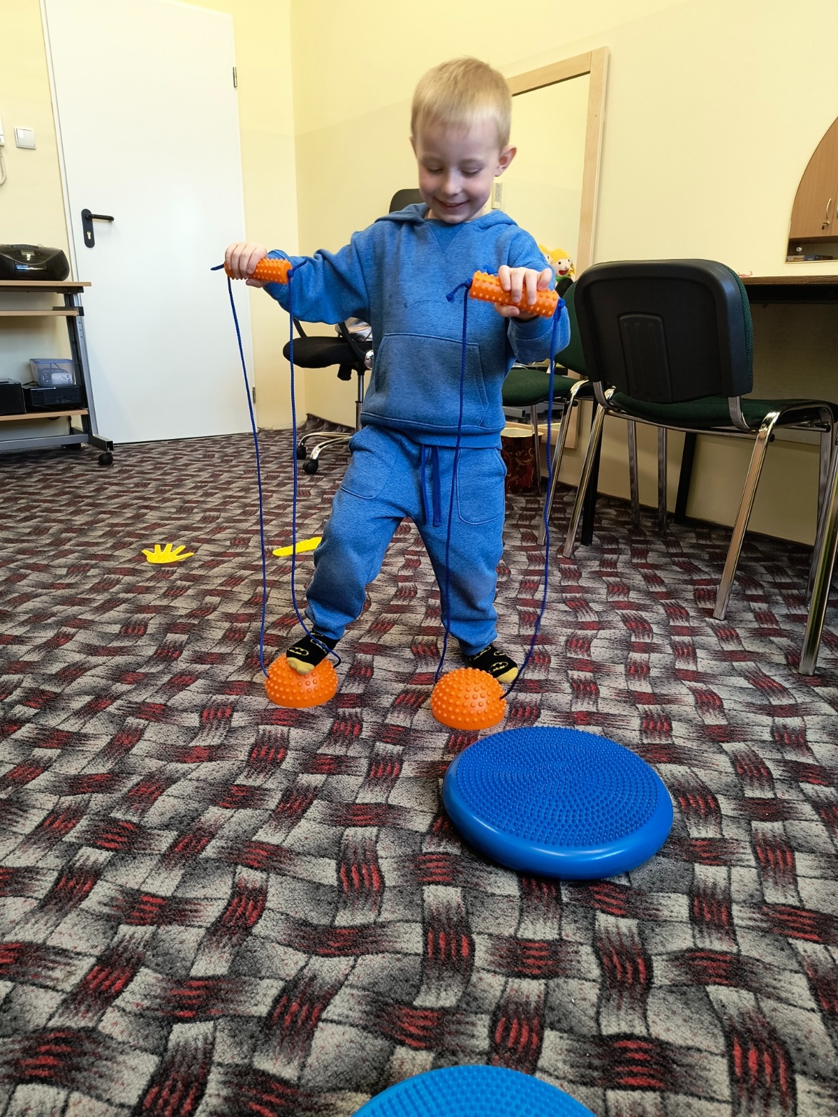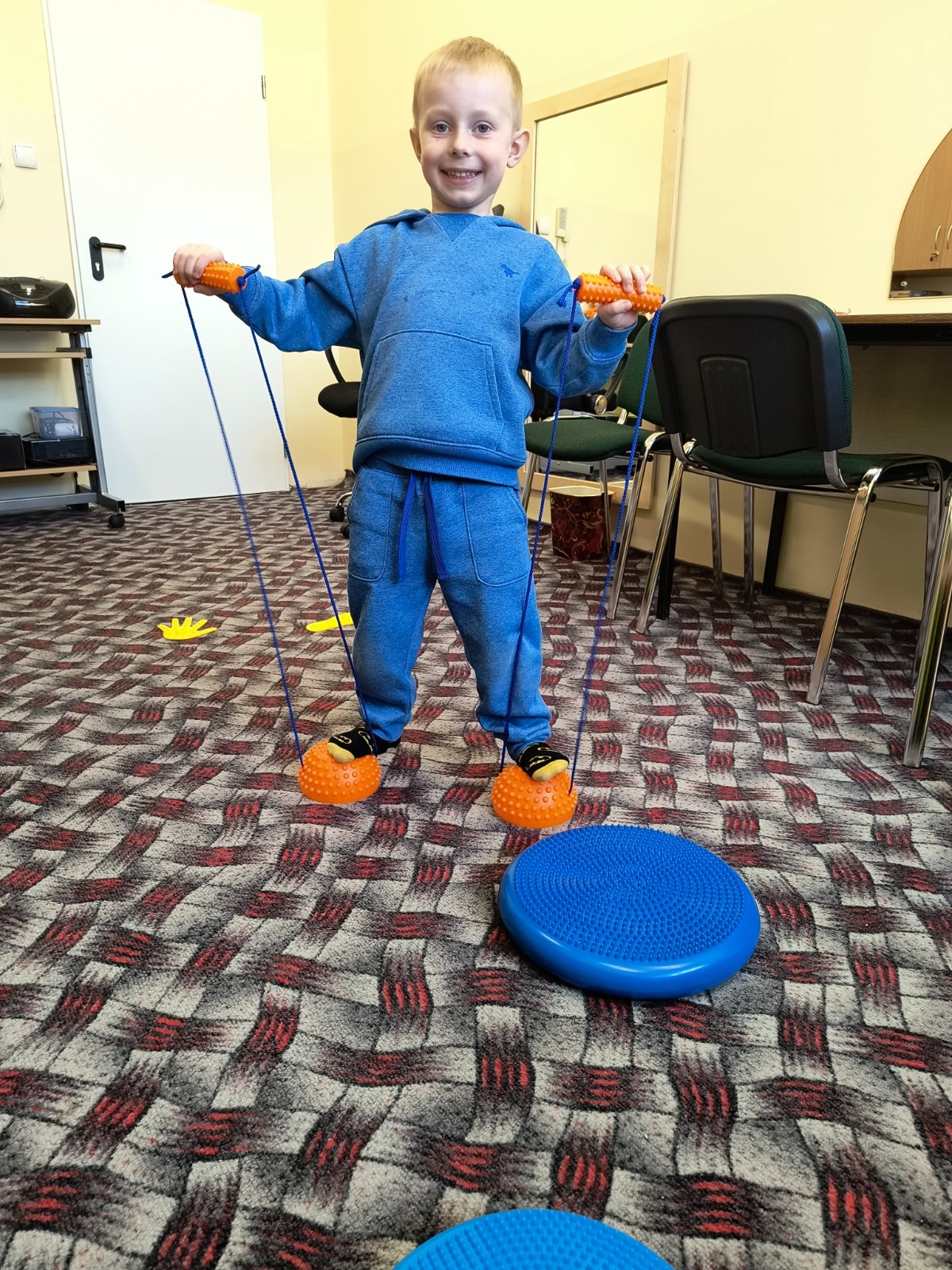 Możemy zaobserwować aktywność chłopca, który bierze udział w ćwiczeniach z wykorzystaniem specjalistycznych pomocy – piłek i dysków sensorycznych oraz półkul równoważnych. Takie przybory stymulują receptory czucia głębokiego i dotyku, ucząc jednocześnie precyzyjnych ruchów oraz kontroli nad ciałem.