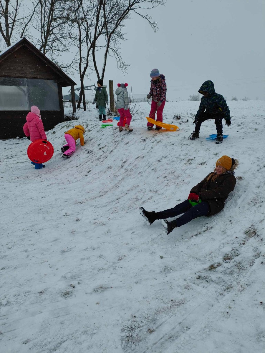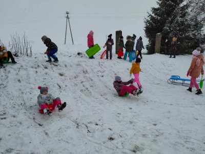 Uczniowie z klas I-III podczas lekcji w-fu wesoło spędzają czas na świeżym powietrzu.