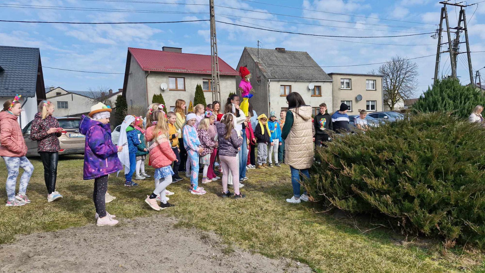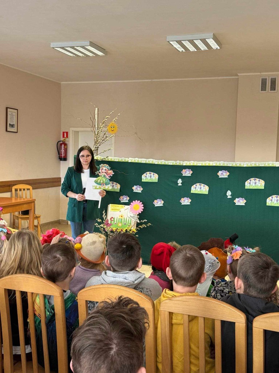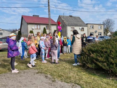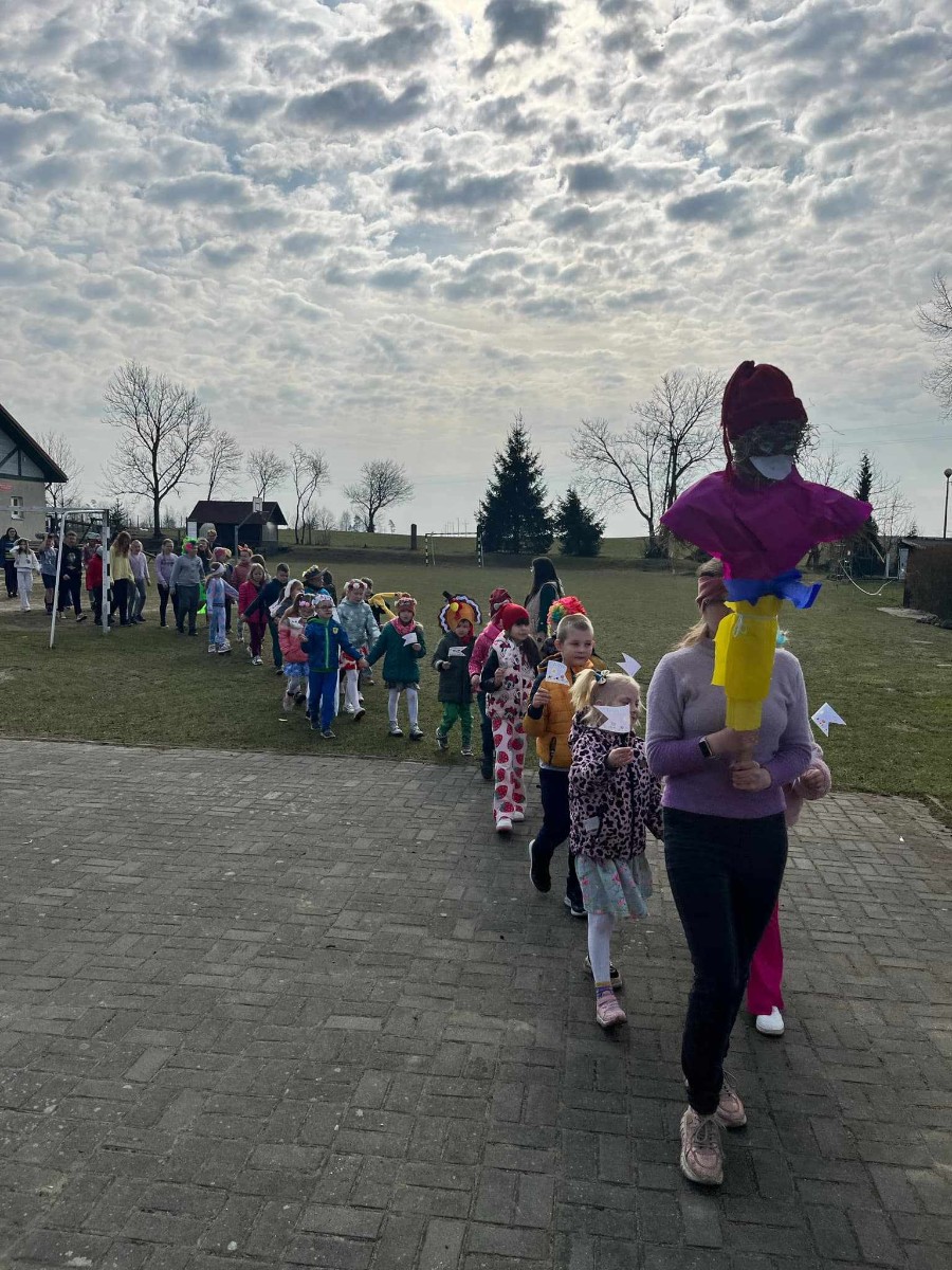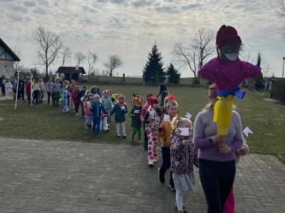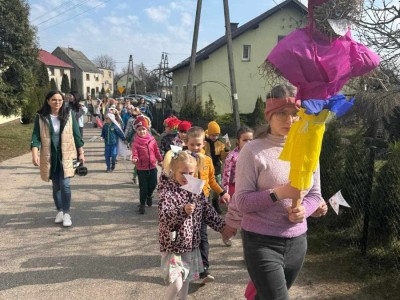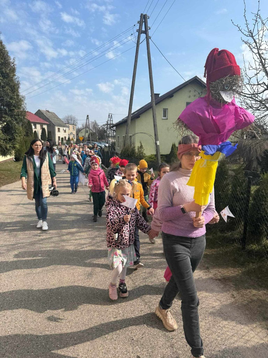 21 marca to pierwszy dzień kalendarzowej wiosny. Po długiej zimie z tęsknotą wyczekujemy tego dnia i jest to duży powód do radości dla wszystkich zmęczonych zimnem i wcześnie zapadającym mrokiem. W tym roku zanim wyruszyliśmy na przemarsz ulicami wsi mogliśmy obejrzeć krótki teatrzyk opowiadający o pierwszych oznakach przyjścia wiosny, przygotowany tym razem przez nauczycieli. Później udaliśmy się na przemarsz, aby obwieścić przybycie wiosny. W trakcie przemarszu uczestnicy nieśli marzannę, kolorowe chorągiewki oraz śpiewali piosenki o tematyce wiosennej.