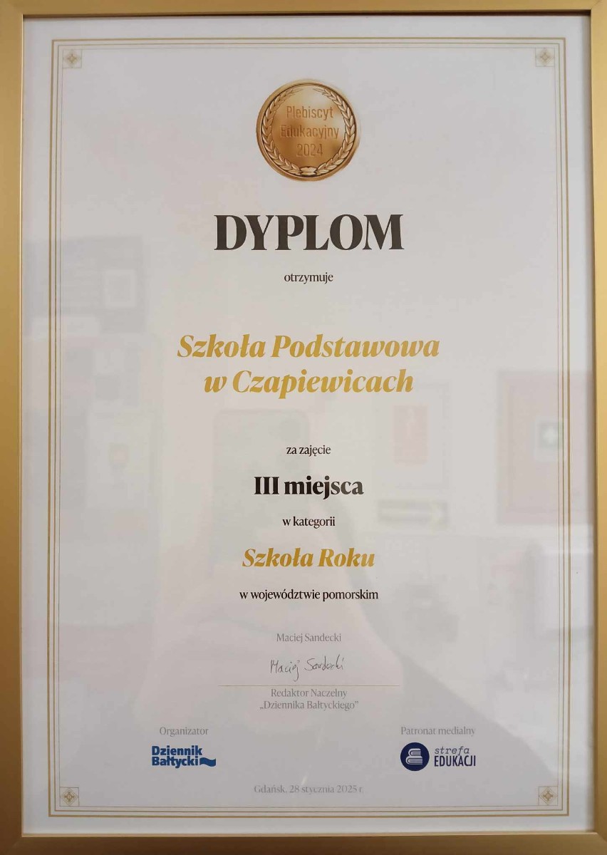 Miło nam poinformować, iż 29 stycznia 2025 r. podczas Gali w Filharmonii Bałtyckiej w Gdańsku odebraliśmy nagrodę za zajęcie trzeciego miejsca w województwie pomorskim w kategorii Szkoła Roku w Plebiscycie Edukacyjnym Dziennika Bałtyckiego.