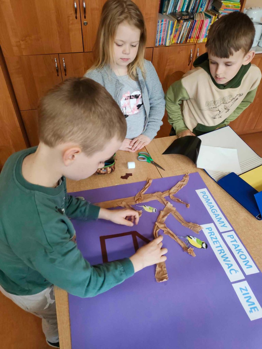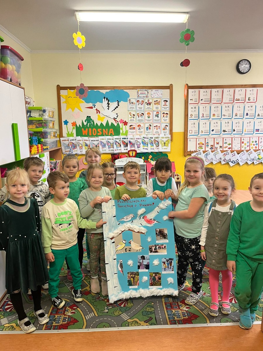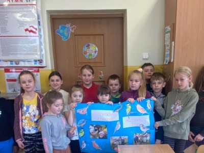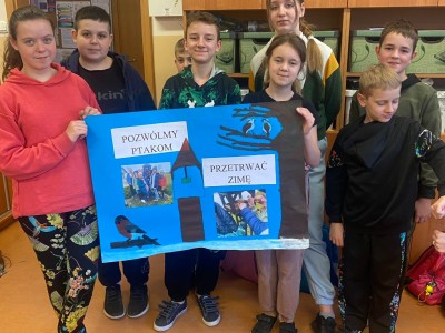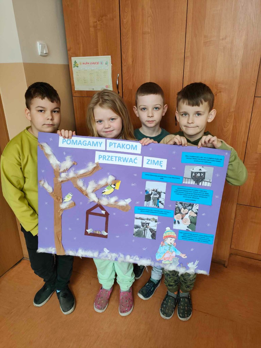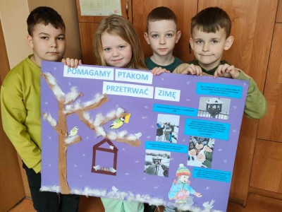 Okres zimowy to czas bardzo trudny i niepewny dla ptaków. W ramach pomocy naszym skrzydlatym przyjaciołom przedszkolaki oraz uczniowie klas I, II i III naszej szkoły wzięli udział w konkursie organizowanym przez Zaborski Park Krajobrazowy pod hasłem „Pomóżmy ptakom przetrwać zimę”. Przez cały okres od późnej jesieni do wczesnej wiosny uczniowie pomagali ptakom regularnie wsypując ziarno do karmników. Gości nam nie brakowało i każdy ptaszek znalazł coś dla siebie. W ramach podsumowania każda z grup wykonała plakat.