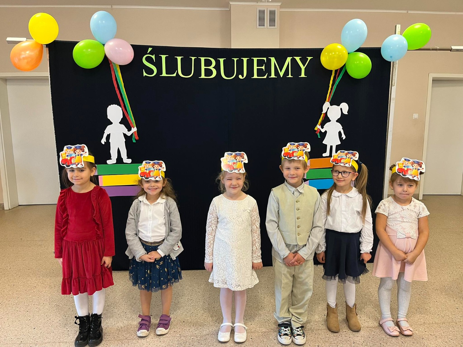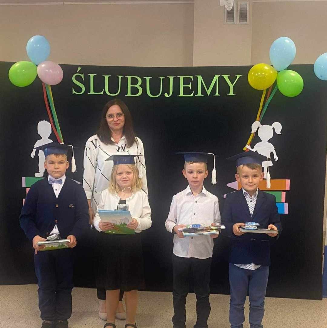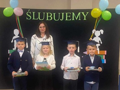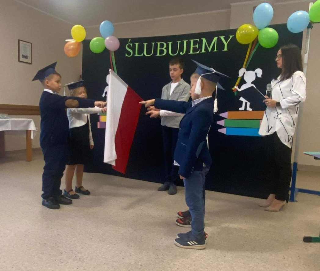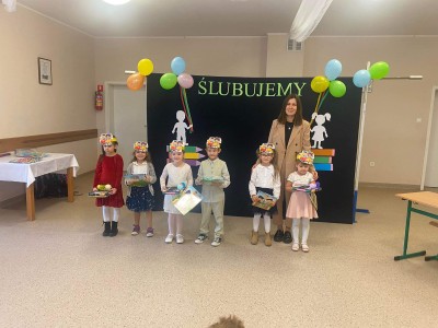 19 października 2023 roku w naszej szkole odbyło się Ślubowanie uczniów klasy I oraz Pasowanie na przedszkolaka. Uroczystość rozpoczęła się powitaniem zebranych gości przez panią dyrektor Joannę Cupa- Frąckowiak. Najpierw swój występ przedstawiły najmłodsze przedszkolaki, które pięknie recytowały wierszyki, śpiewały piosenki i tańczyły. Pani dyrektor pasowała nowo przyjęte dzieci na prawdziwych przedszkolaków. Następnie dzieci z klasy pierwszej zaprezentowały swoją część artystyczną. Po zakończeniu dzieci ślubowały być wzorowymi uczniami, otrzymując przy tym dyplom, niespodziankę od Rady Rodziców oraz swój pierwszy dokument - legitymację szkolną. Był to dla nas wszystkich dzień pełen radości, niespodzianek i wrażeń.