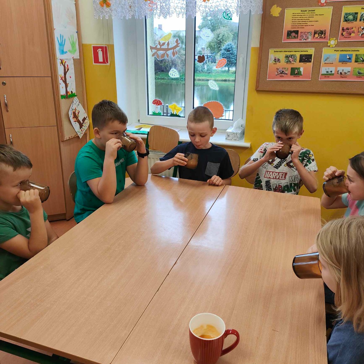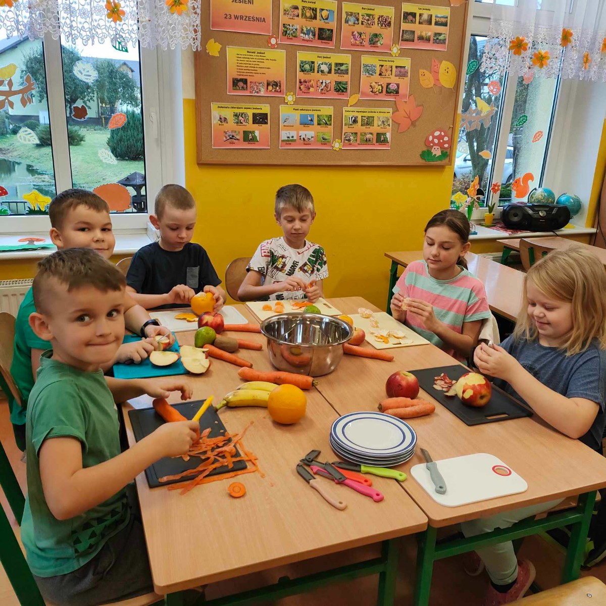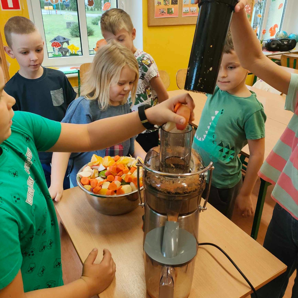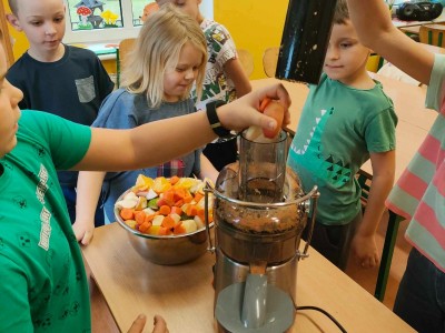 Jesień, to czas, kiedy w naszych ogrodach i sadach pojawia się wiele zdrowych i kolorowych przysmaków. Uczniowie klasy I i III wiedzą, jak ważne dla organizmu jest spożywanie warzyw i owoców. Jako dowód na to, że dbają o zdrowie zrobili przepyszny sok owocowy- warzywny.