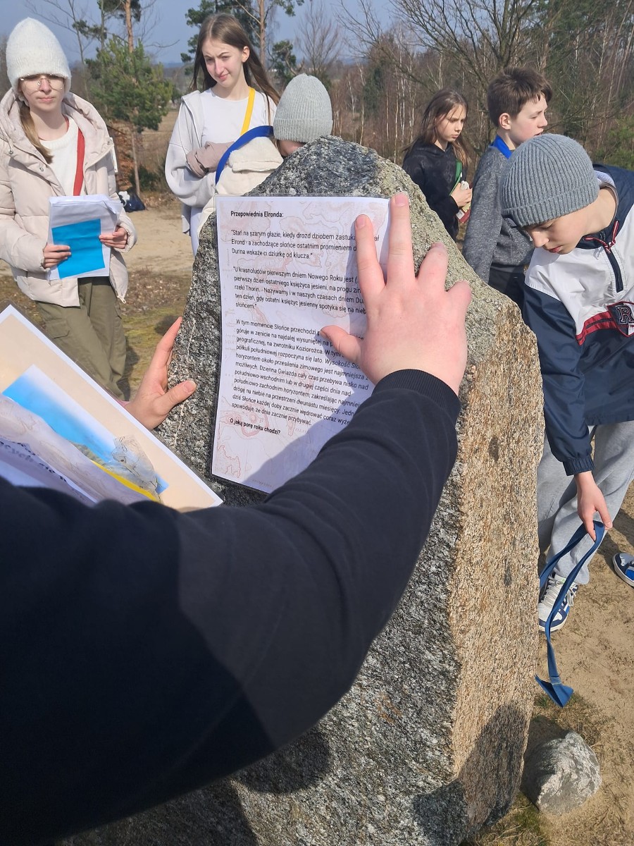 W miniony piątek, 15 marca 2024 r., uczniowie wraz opiekunami wyruszyli na Ścieżka lichenologiczno-kulturowa w Leśnie, gdzie poszukiwali i rozwiązywali różnorodne zadania dotyczące np. fabuły, mapy, kierunków geograficznych, Nowej Zelandii, świata przedstawionego w lekturze, czy czytania pisma runicznego (związanego z językiem elfickim, stworzonym przez wybitnego Tolkiena ). Ostatecznie kompanii szóstoklasistów udało się rozszyfrować przepowiednię Elronda i odzyskać skarb Króla spod Góry!